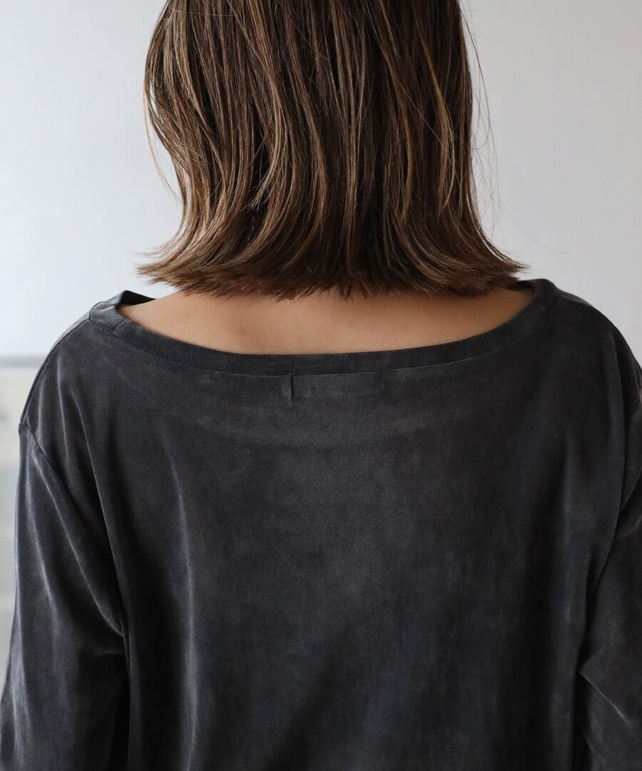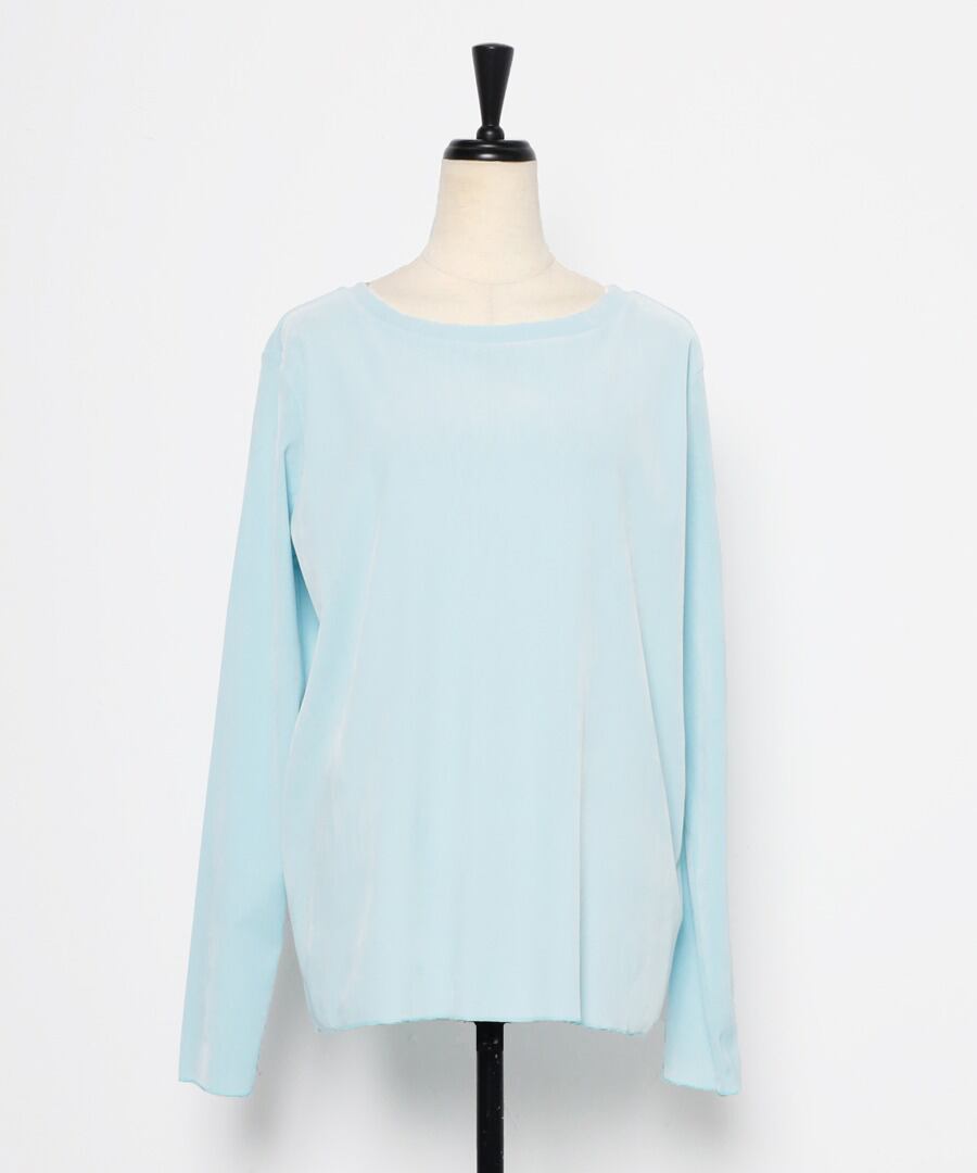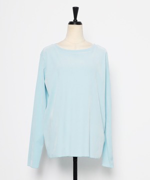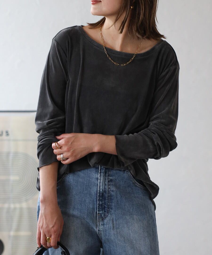 ベロアの質感がほんのりとした透け感を演出し、女性らしい繊細なスタイルを引き立てるロングスリーブT。