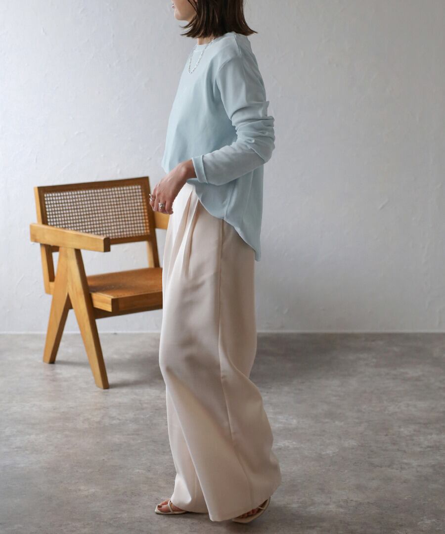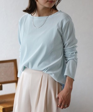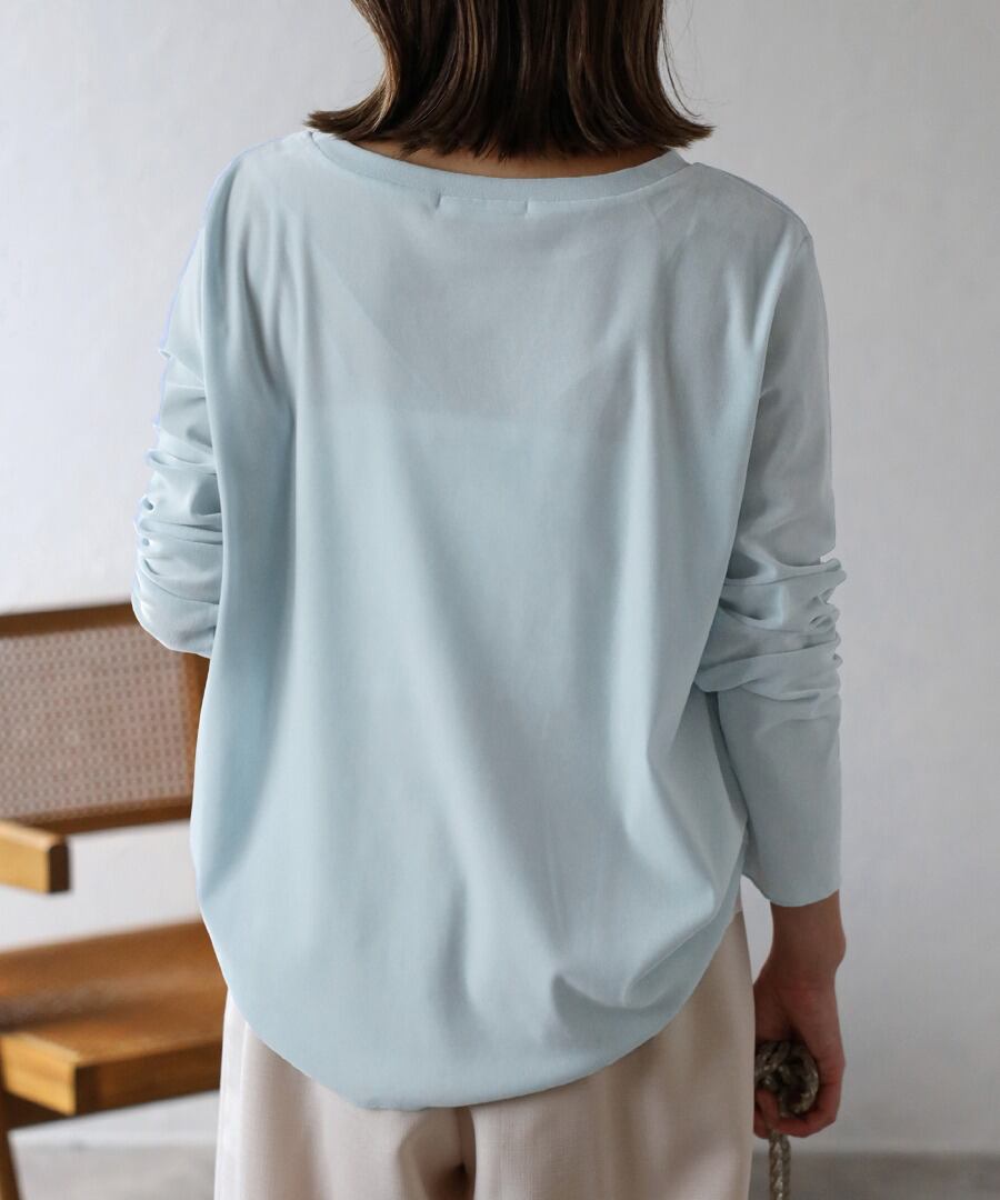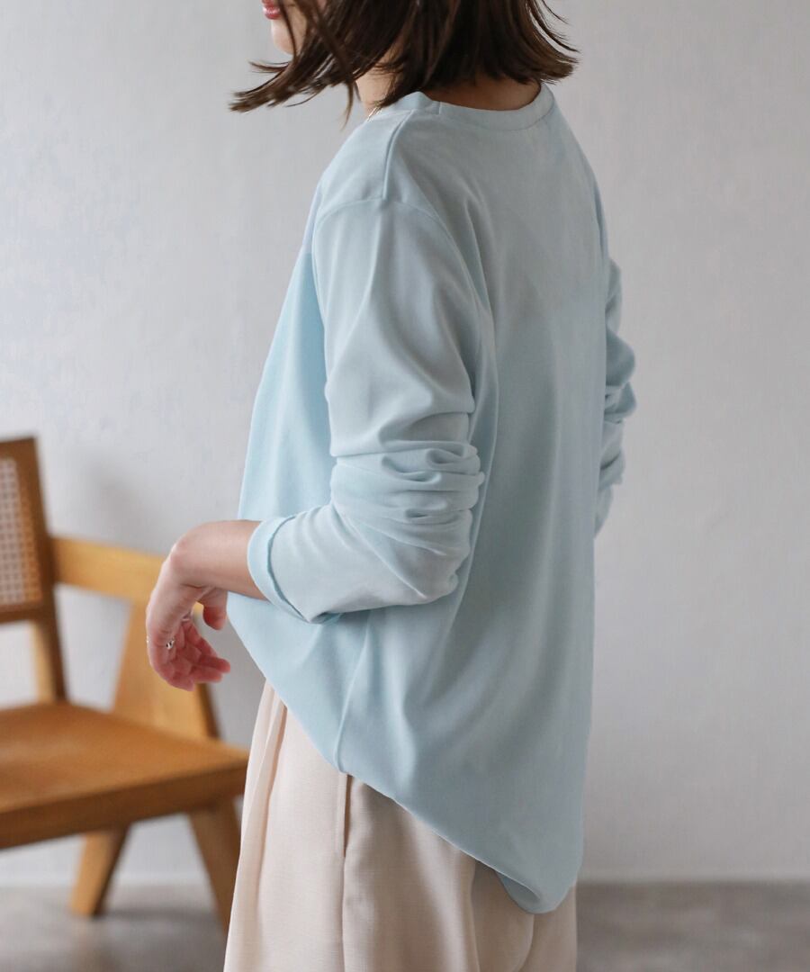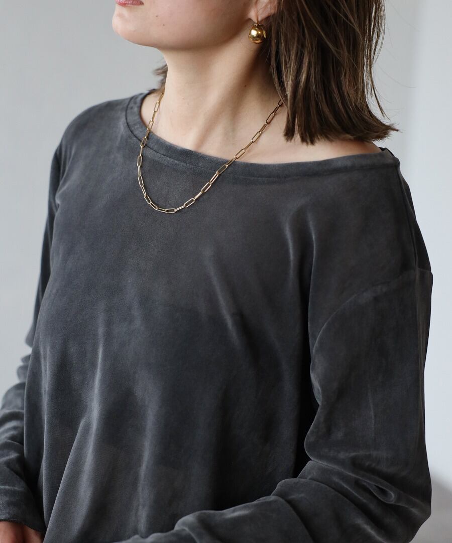ベロアの質感がほんのりとした透け感を演出し、女性らしい繊細なスタイルを引き立てるロングスリーブT。