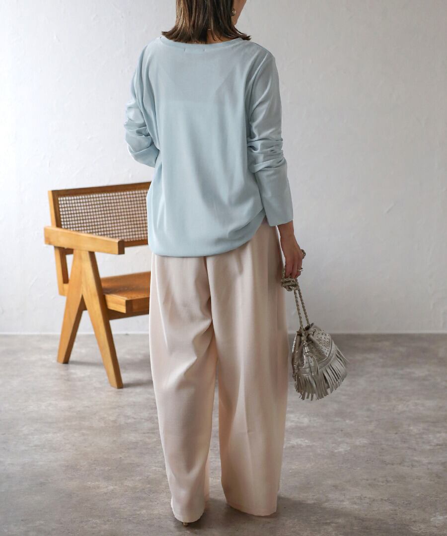 柔らかく軽やかな素材で肌触りが良く、伸縮性も抜群で、上品さと動きやすさを兼ね備えた一枚です。