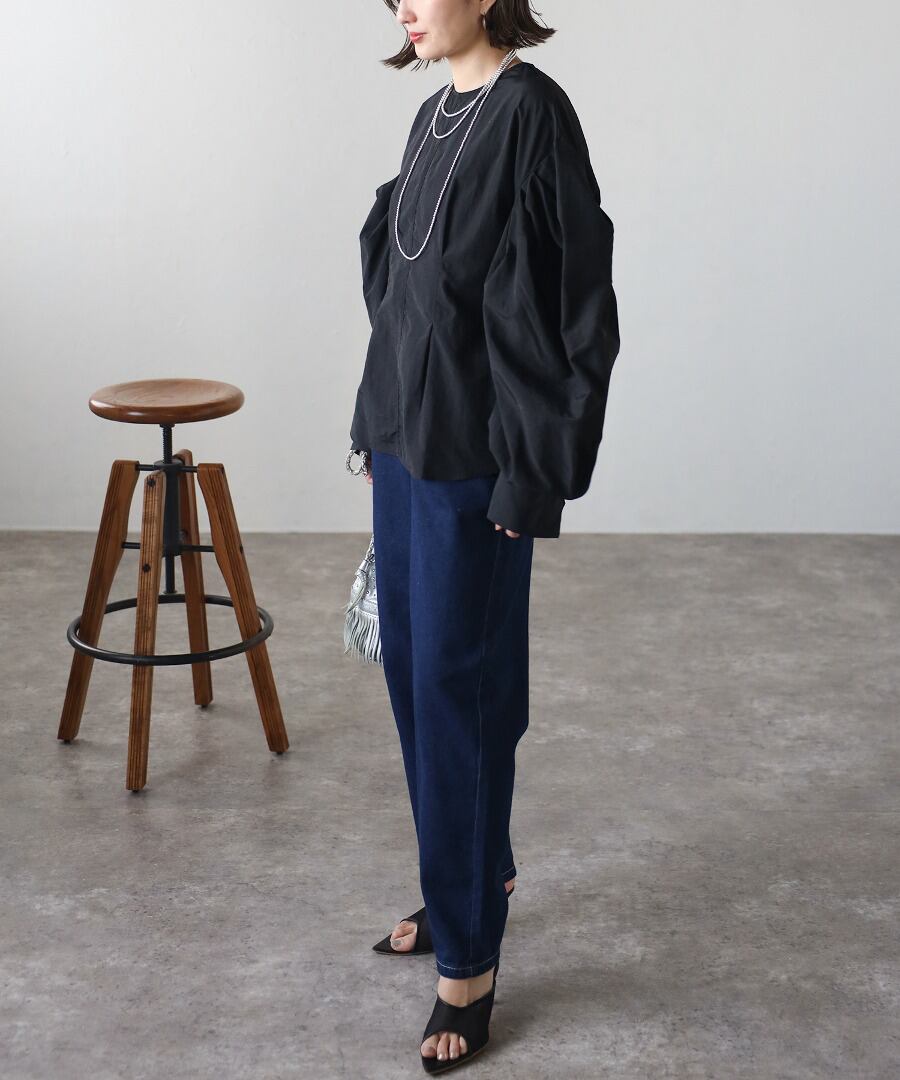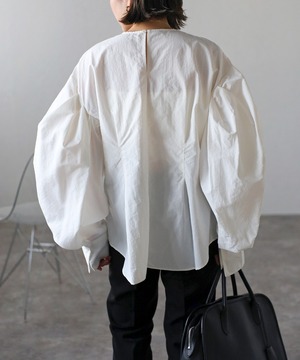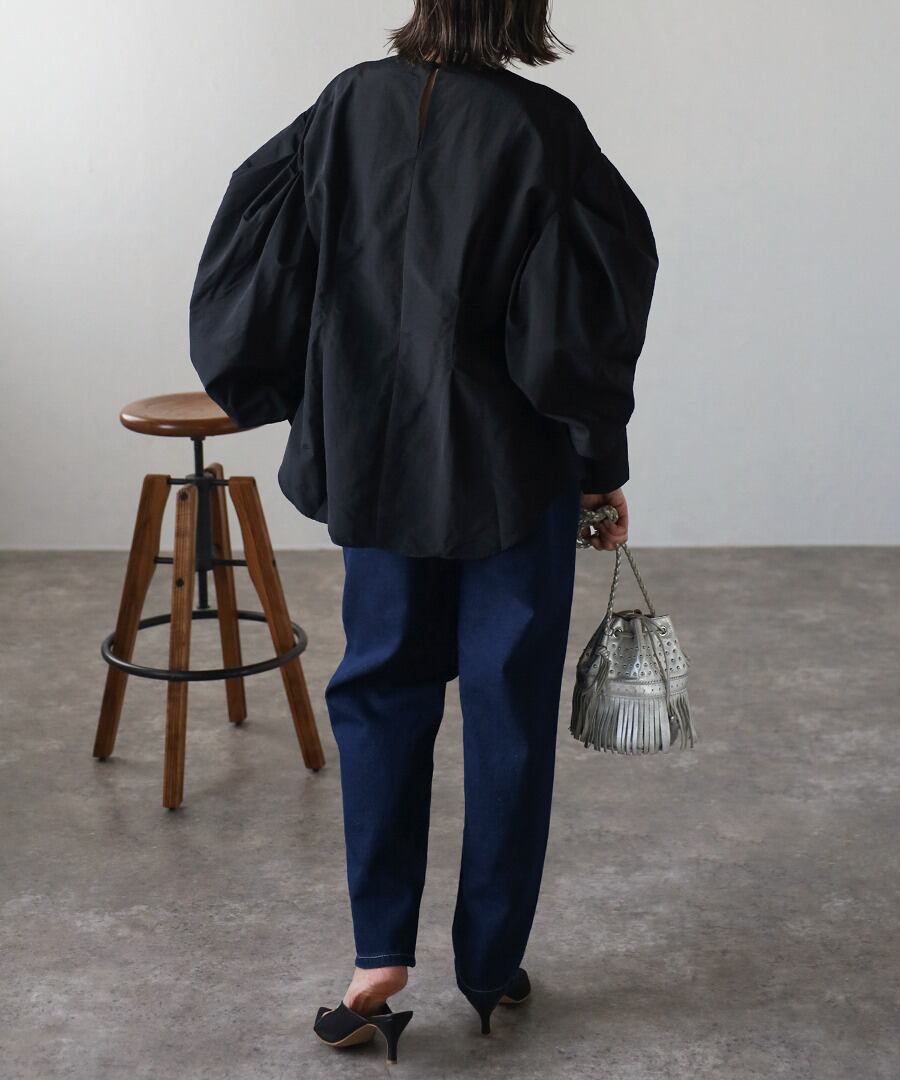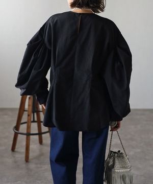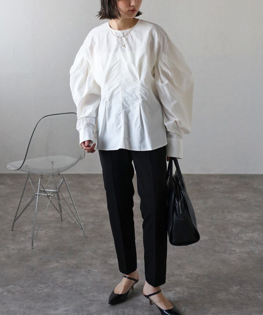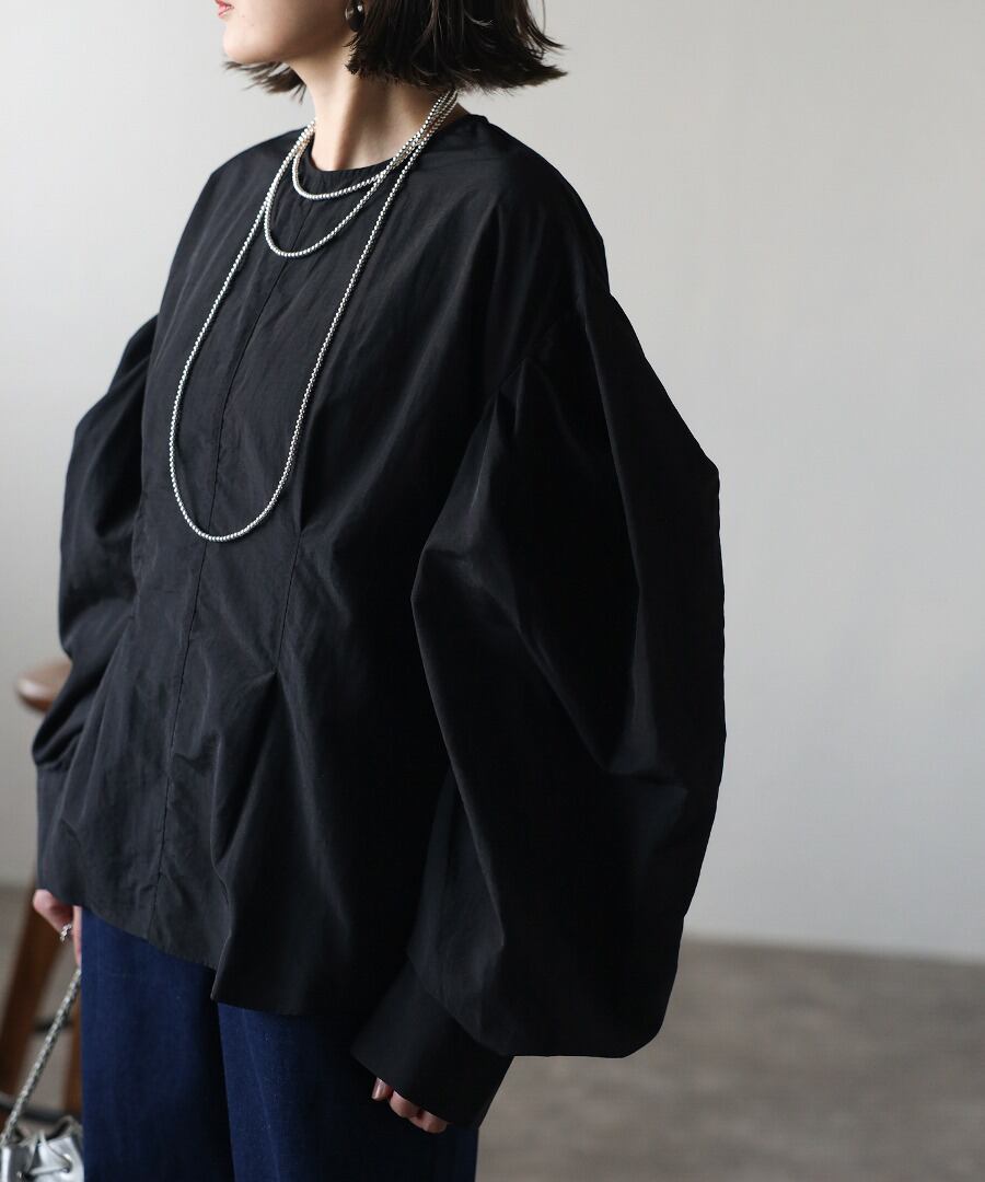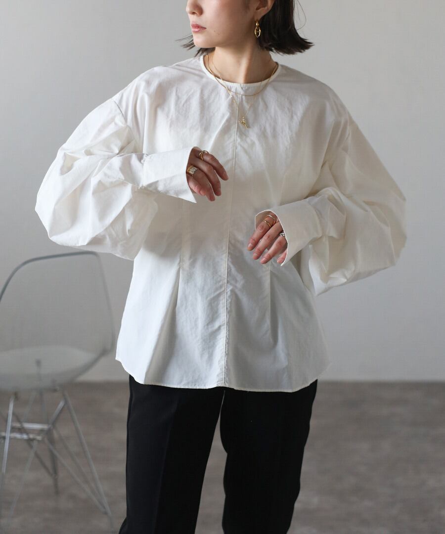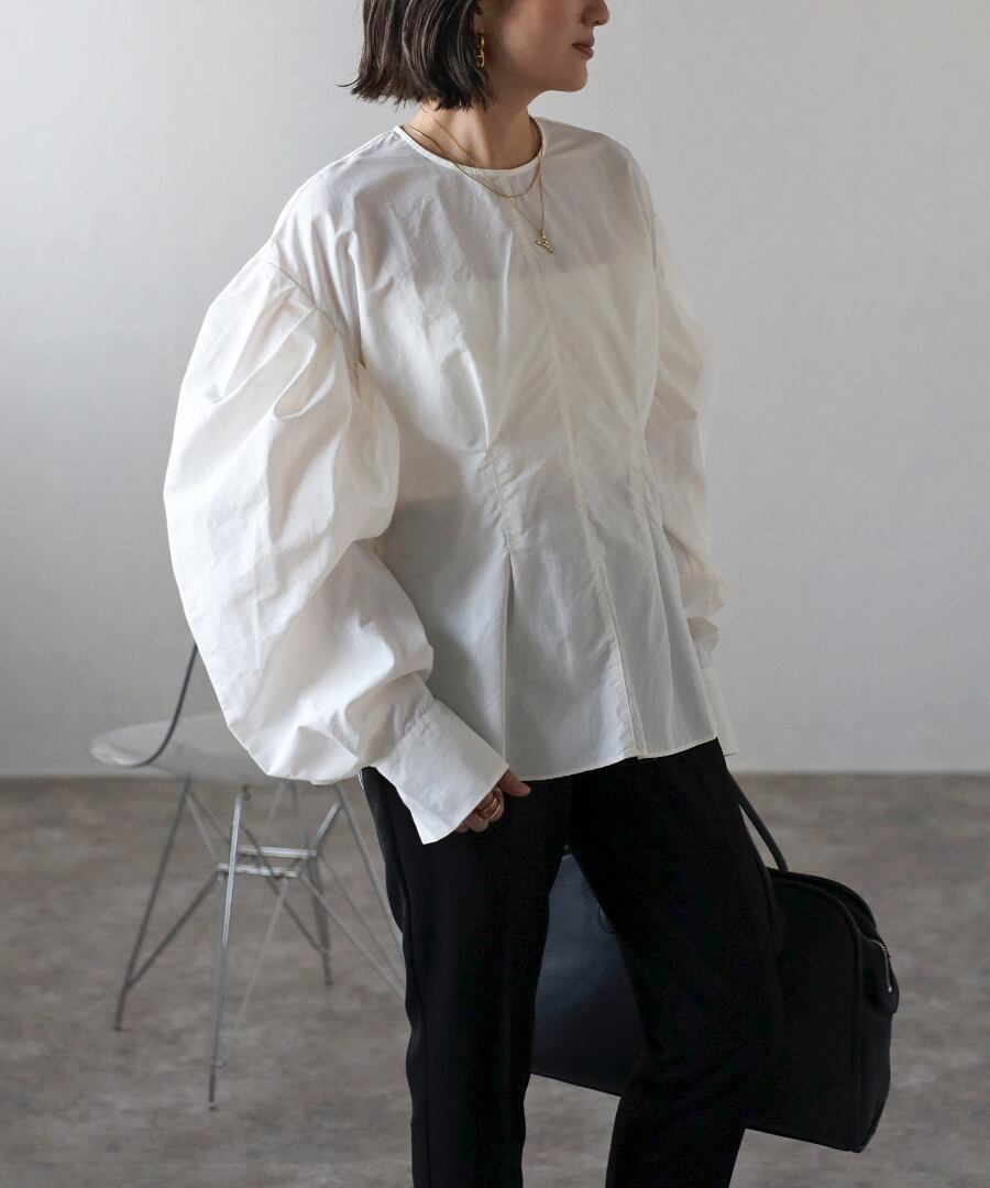 タックデザインが目を惹く、モード感のあるボリュームスリーブブラウス