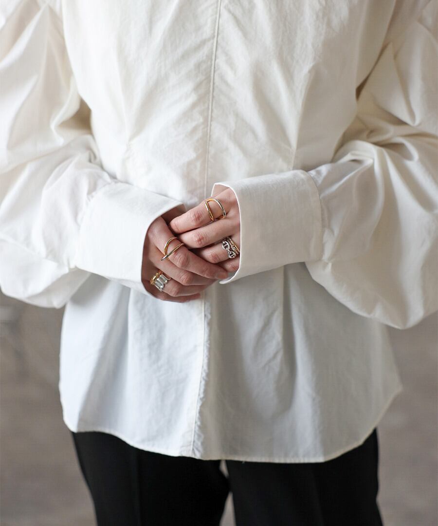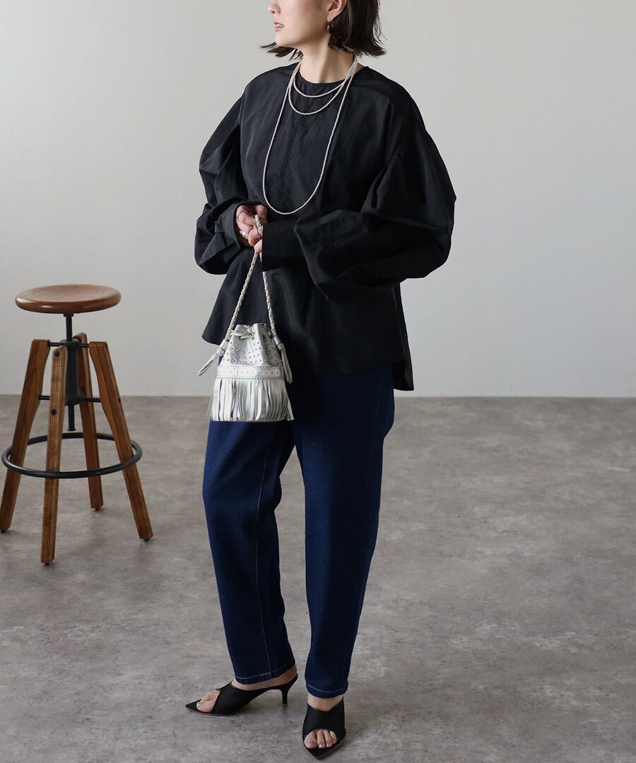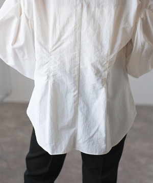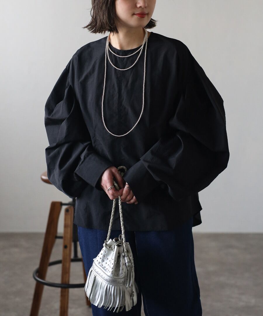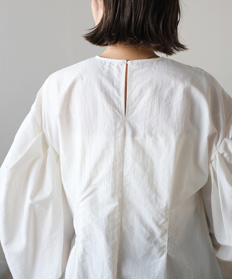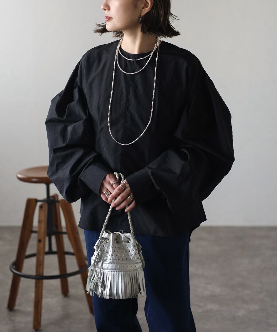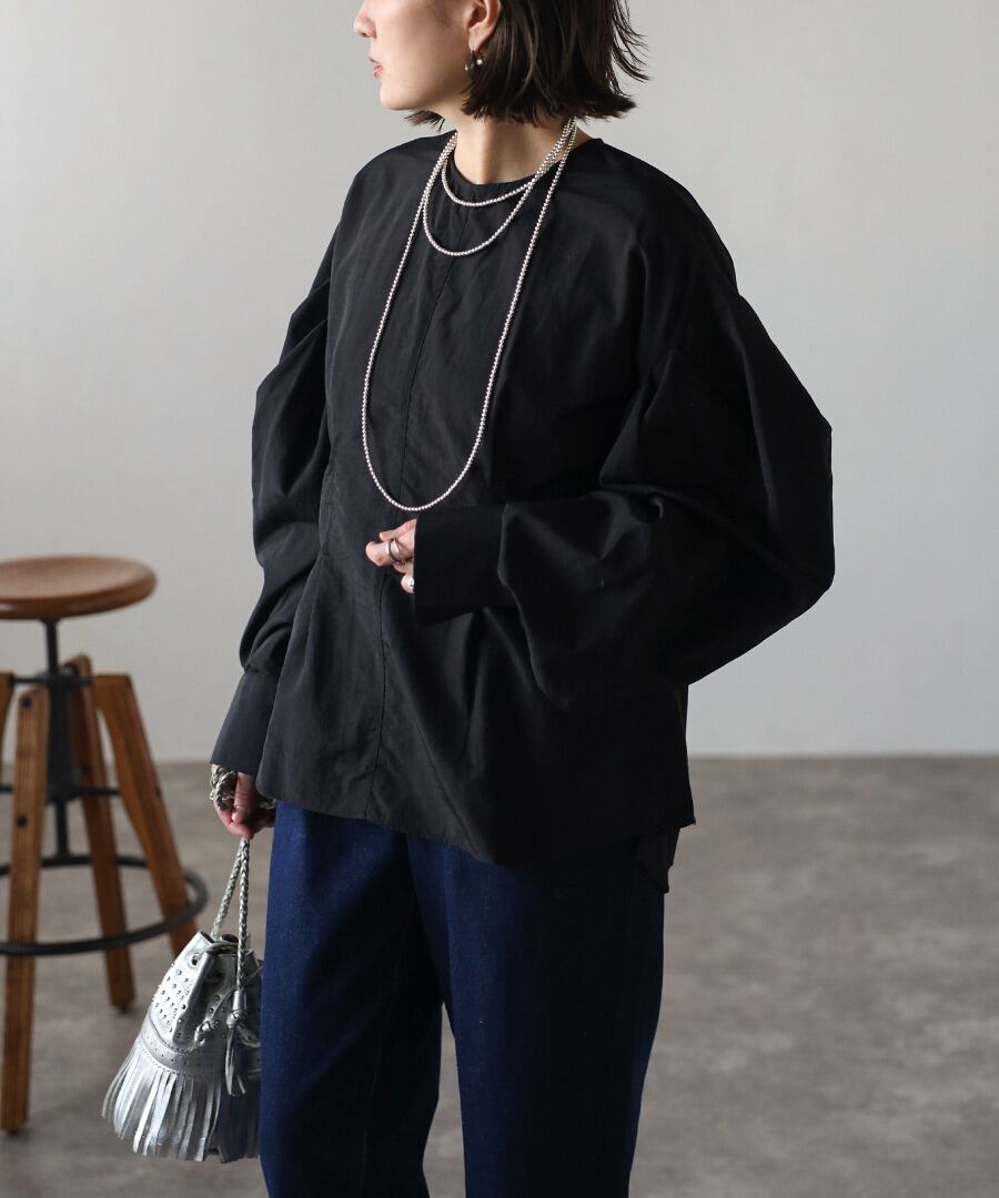 タックデザインが目を惹く、モード感のあるボリュームスリーブブラウス