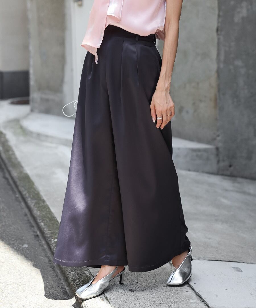 2WAYリボンオーガンジブラウス×サテンタックワイドパンツセットアップ【s-40020】.