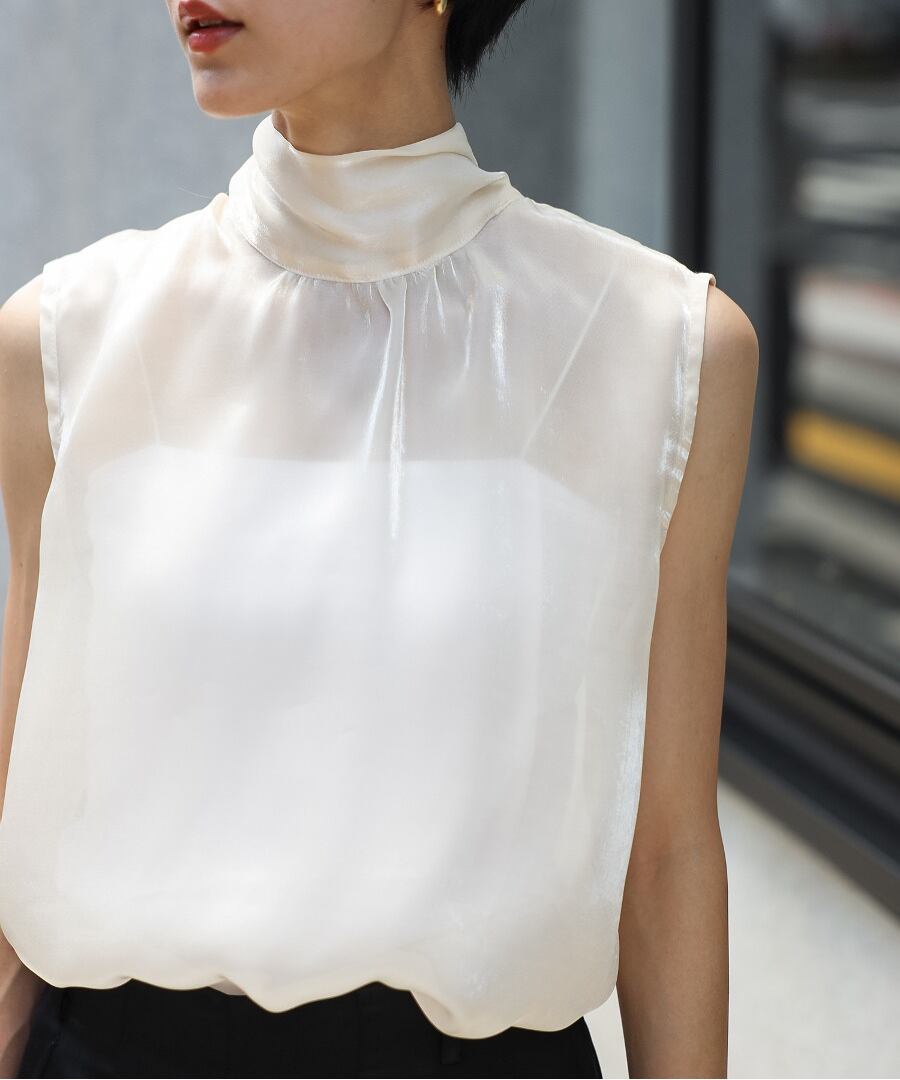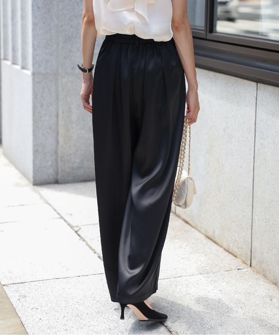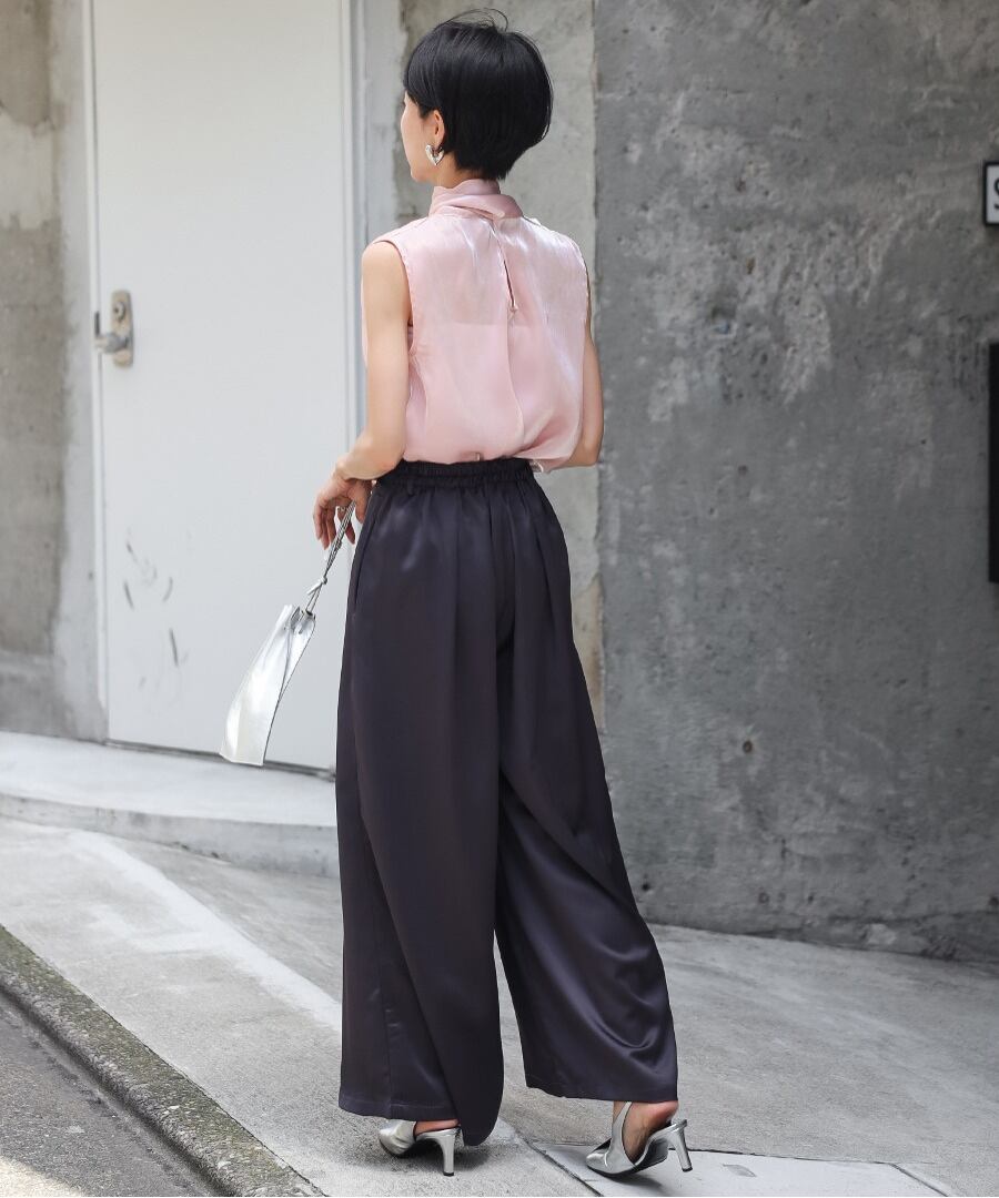 エレガントなオーガンジー素材のブラウスと、シルエットが美しいサテンパンツの贅沢な2点セット。