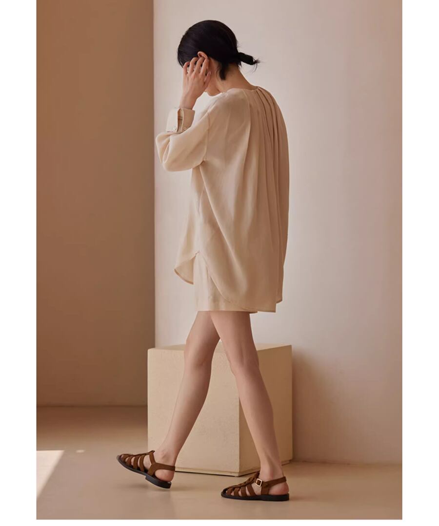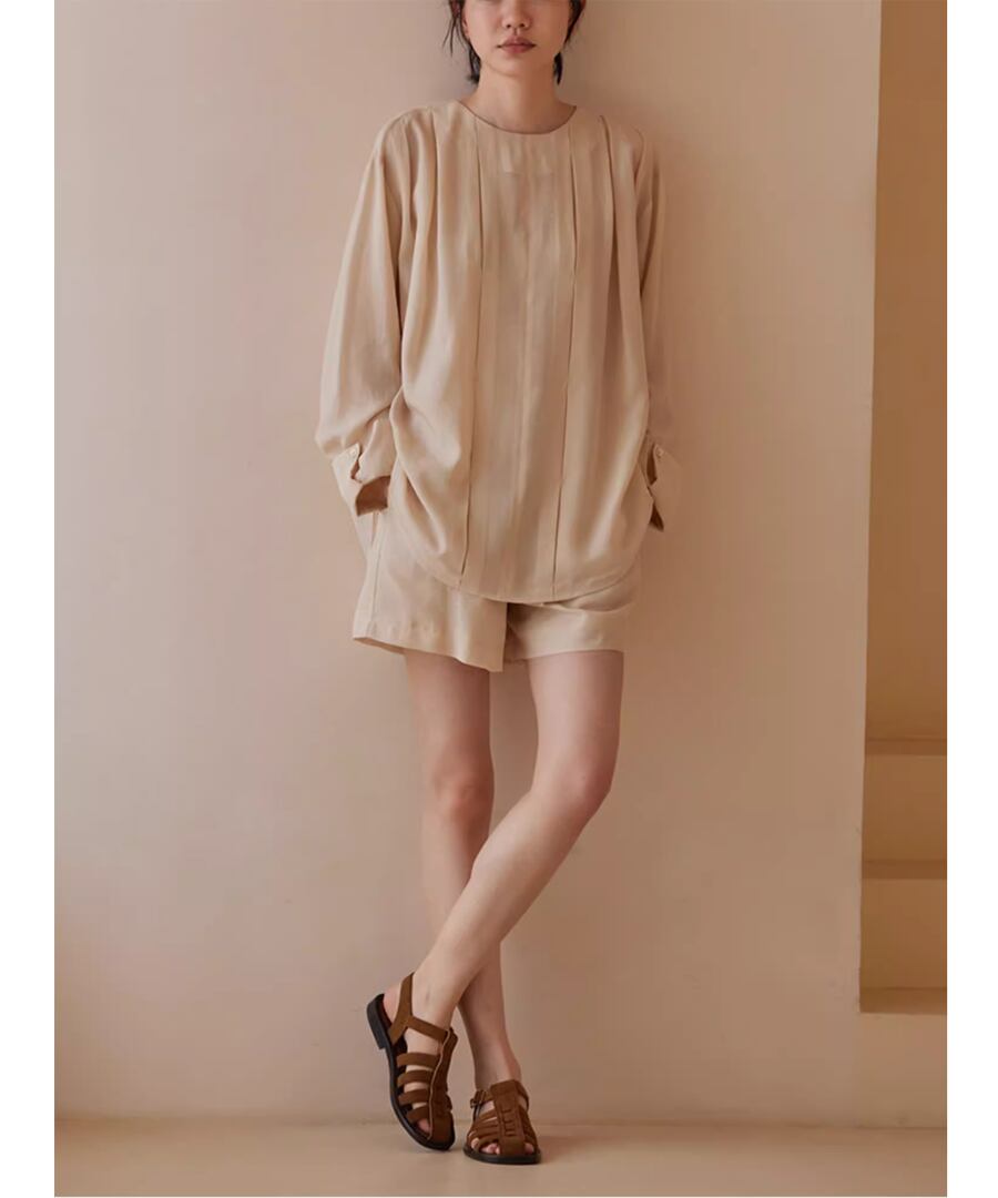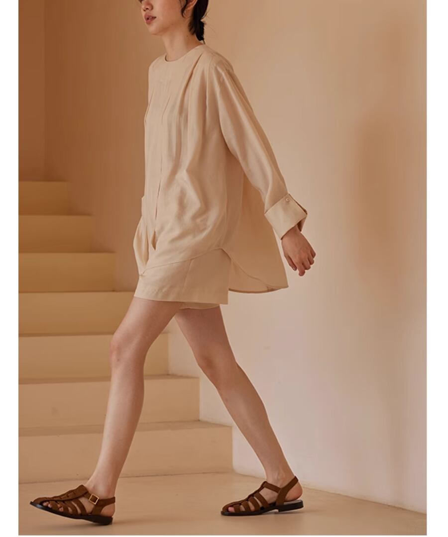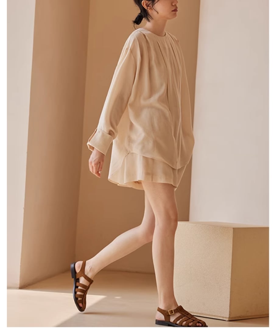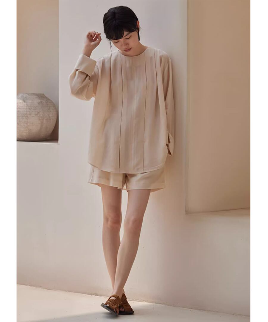 シンプルでありながら、ナチュラルな魅力を引き立てるブラウス&ショートパンツセット。