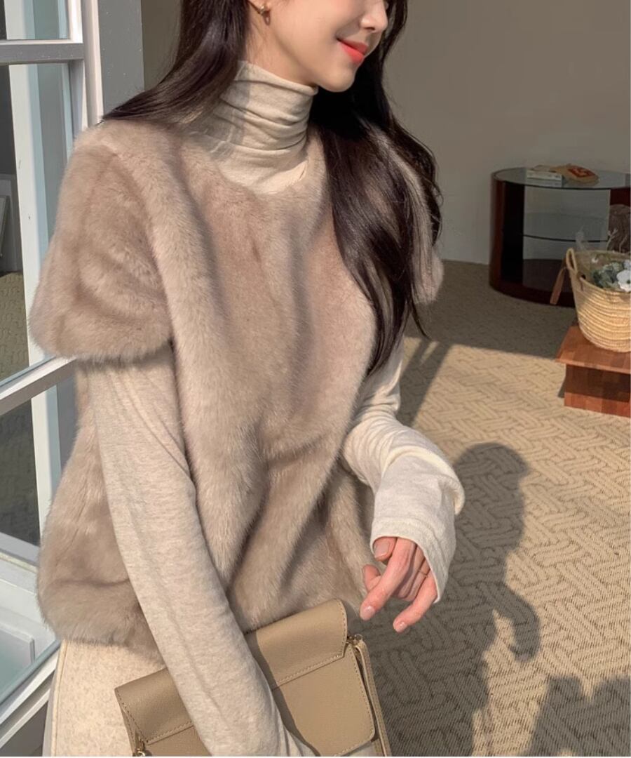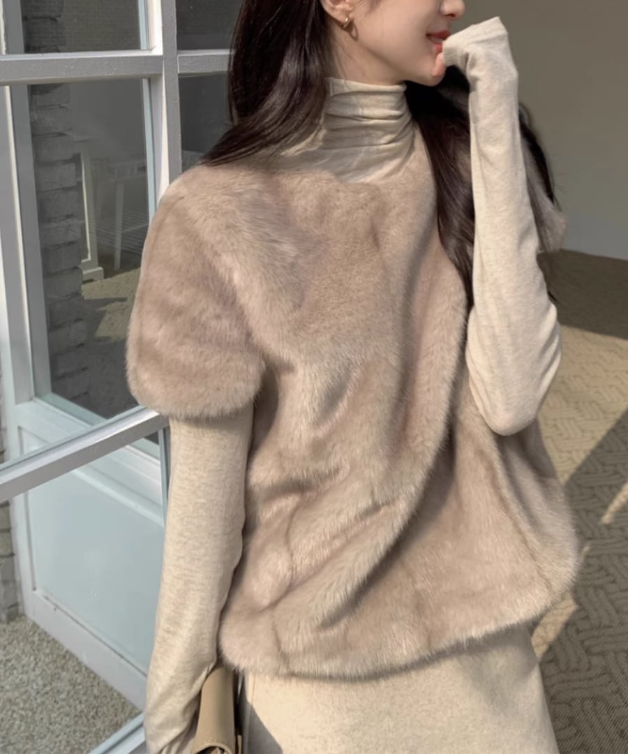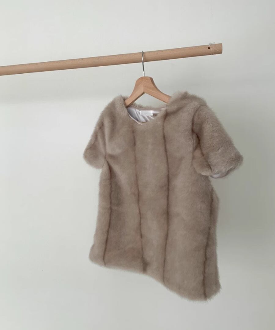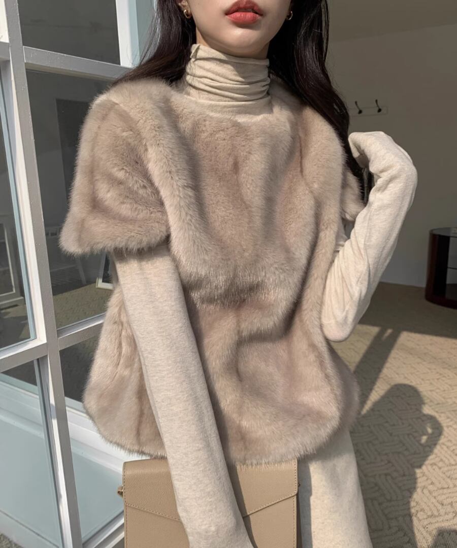柔らかなフェイクファー素材が肌に優しく、リッチな印象を与える一枚です。