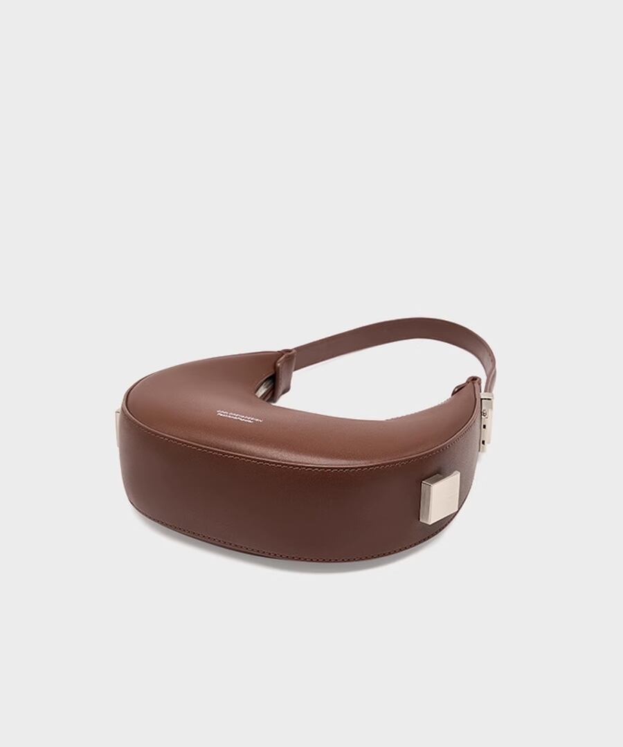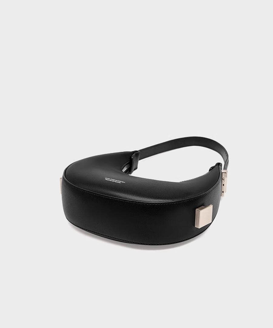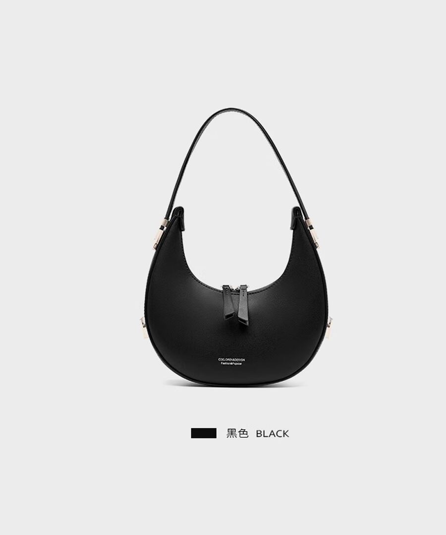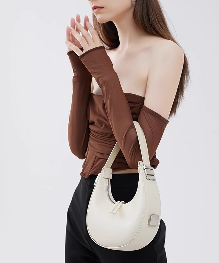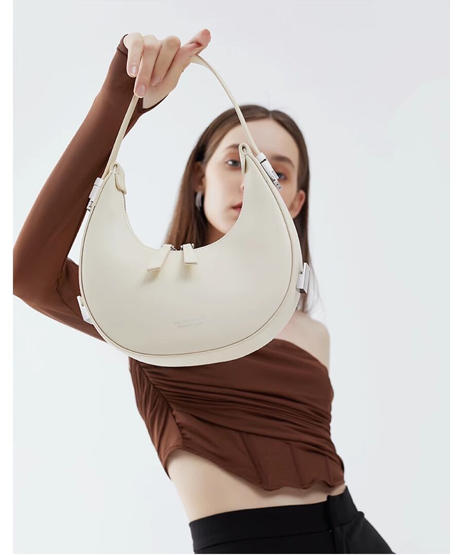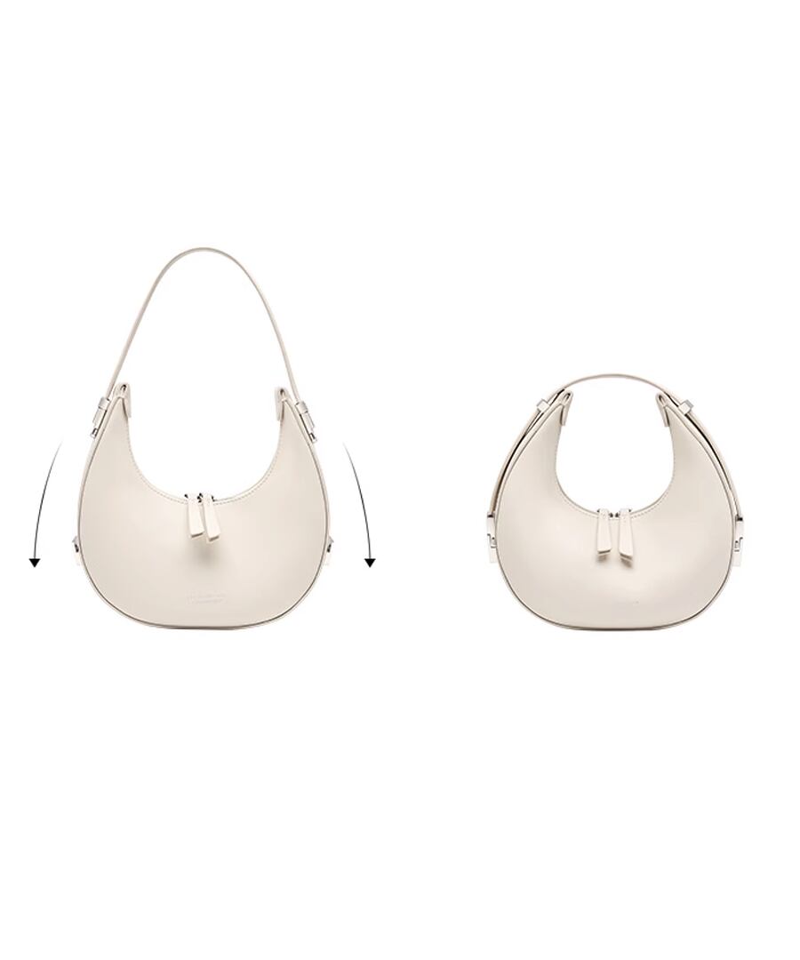 エレガントな雰囲気を演出するハーフムーンデザインのハンドバッグ。
