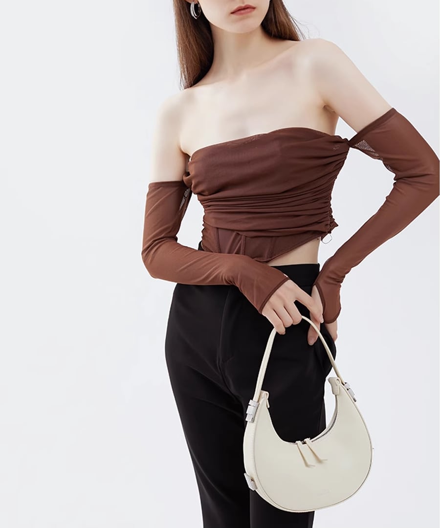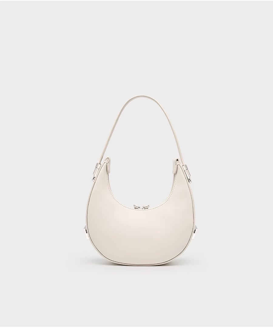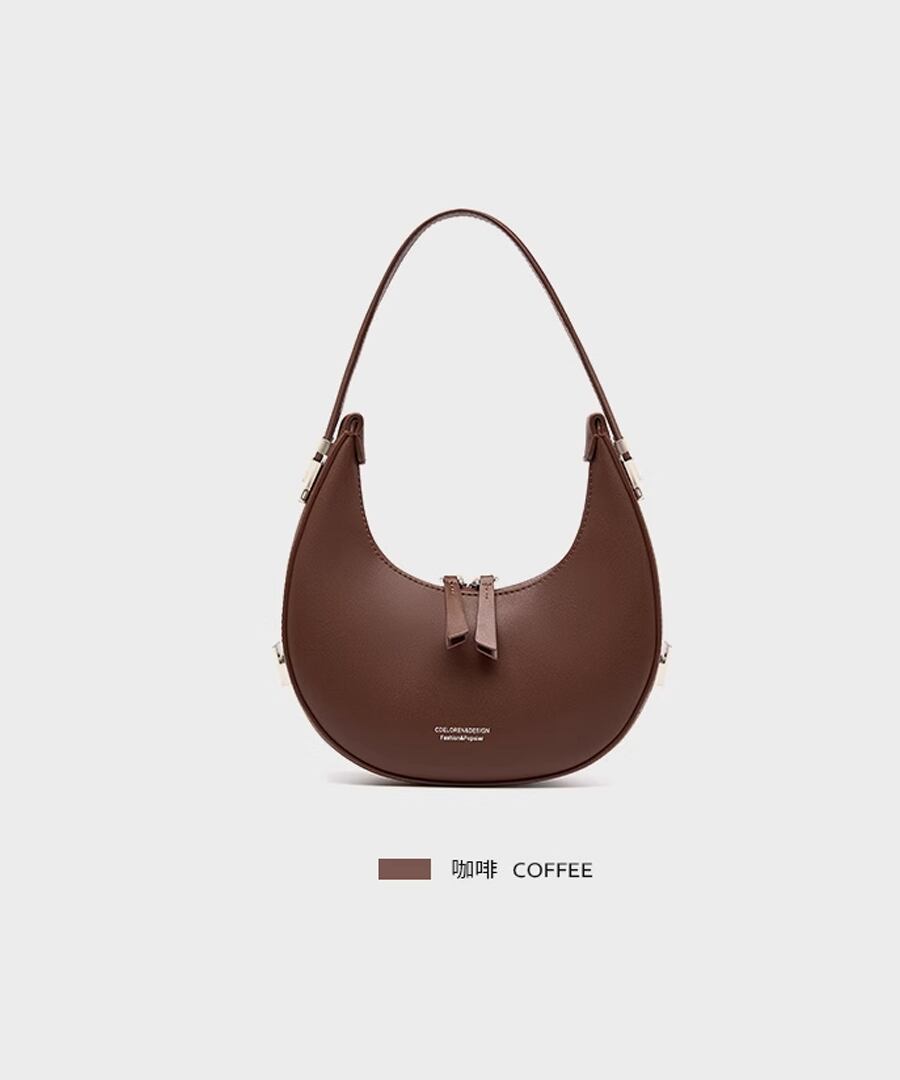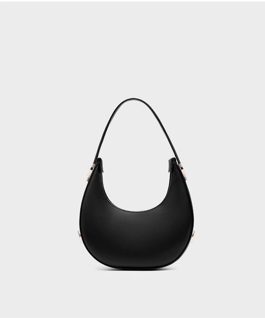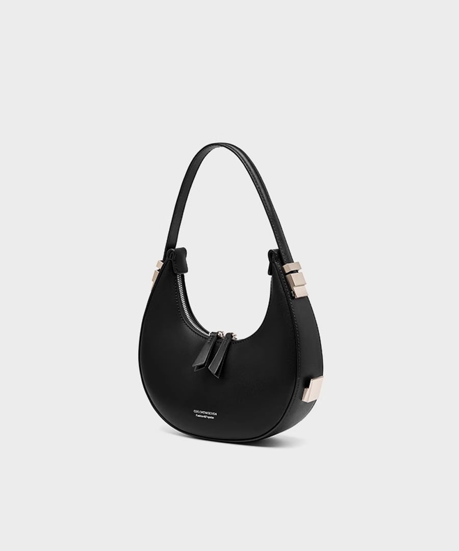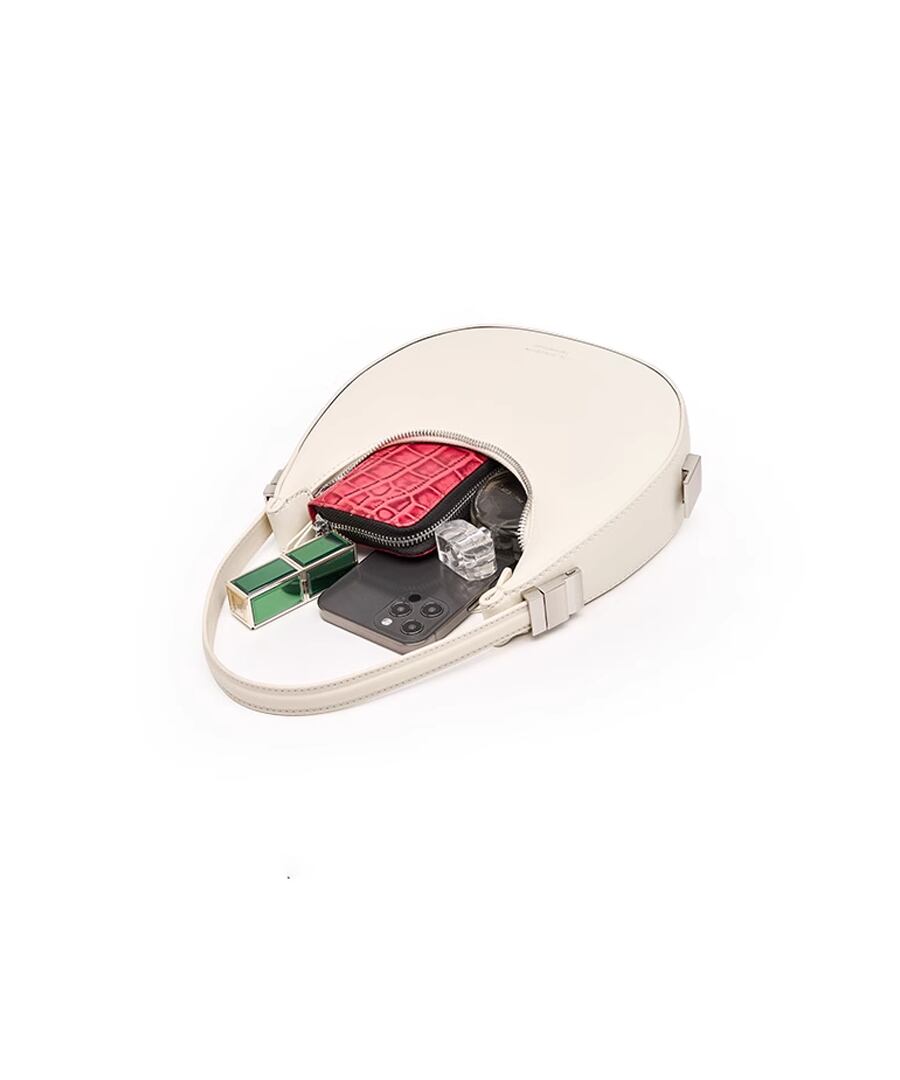 エレガントな雰囲気を演出するハーフムーンデザインのハンドバッグ。