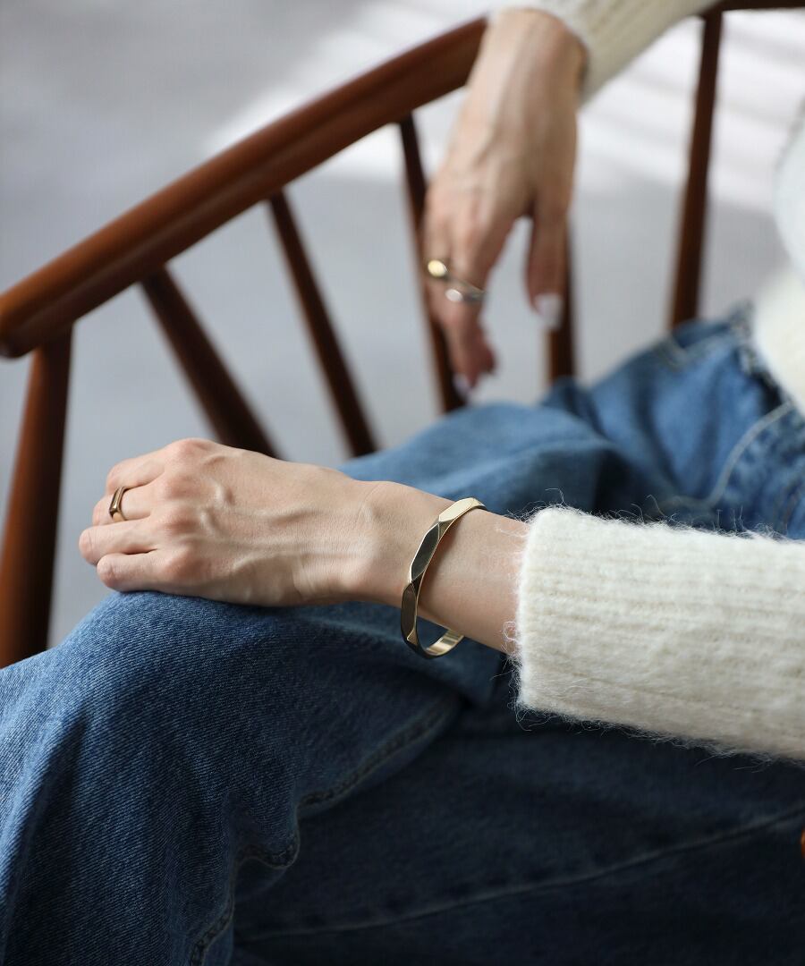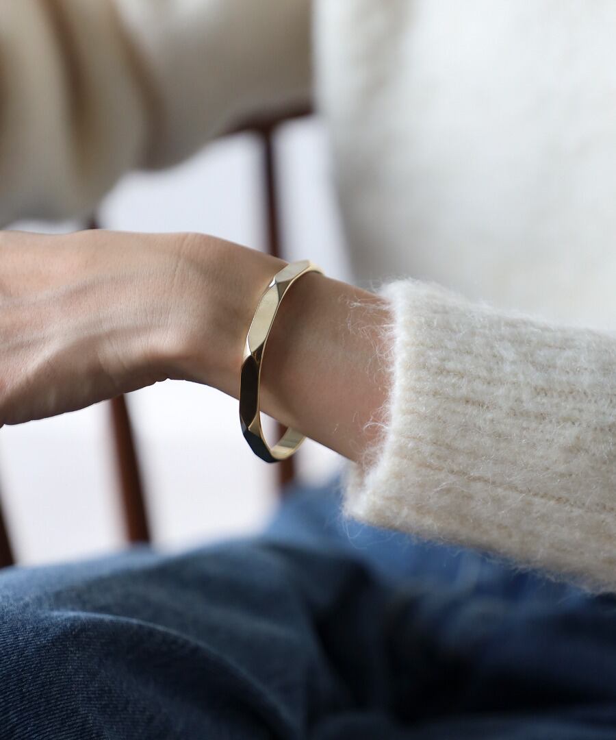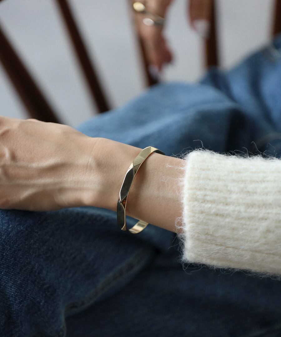 滑らかなメタリックの質感と、立体感のあるデザインが手元を華やかに彩るバングル。