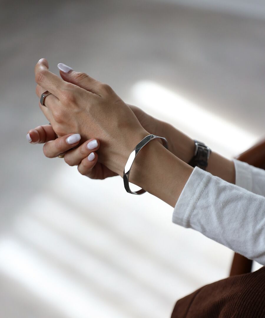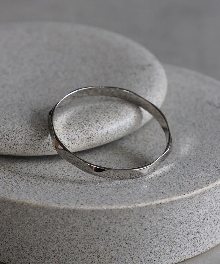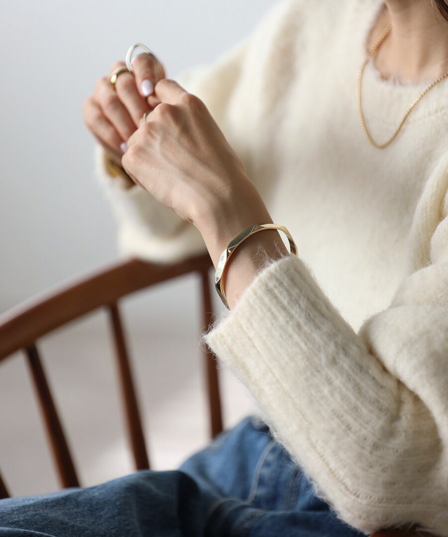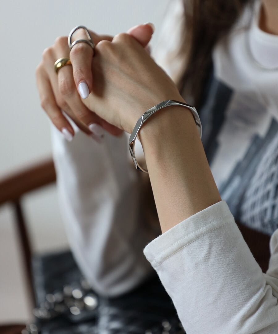 滑らかなメタリックの質感と、立体感のあるデザインが手元を華やかに彩るバングル。