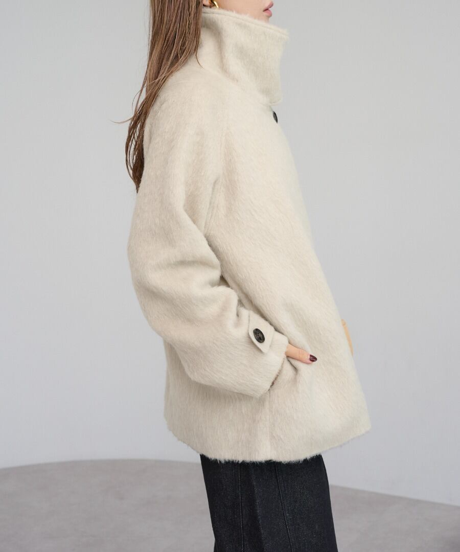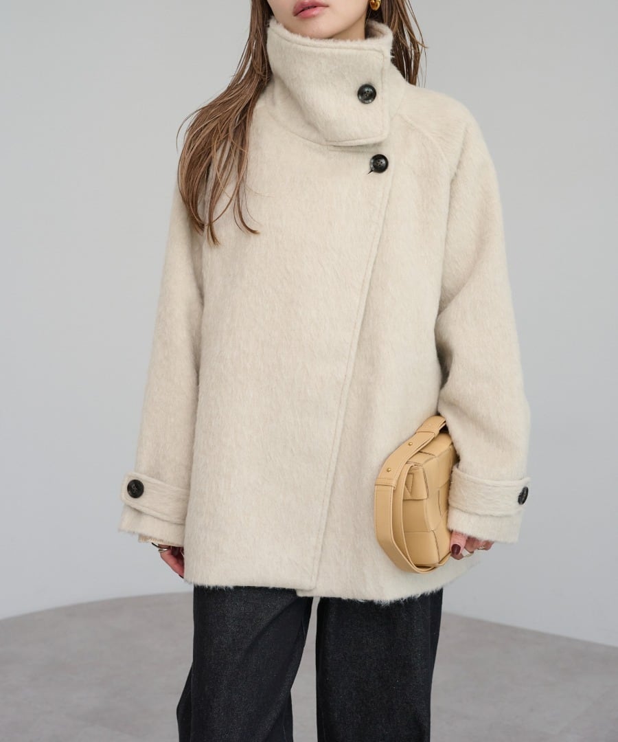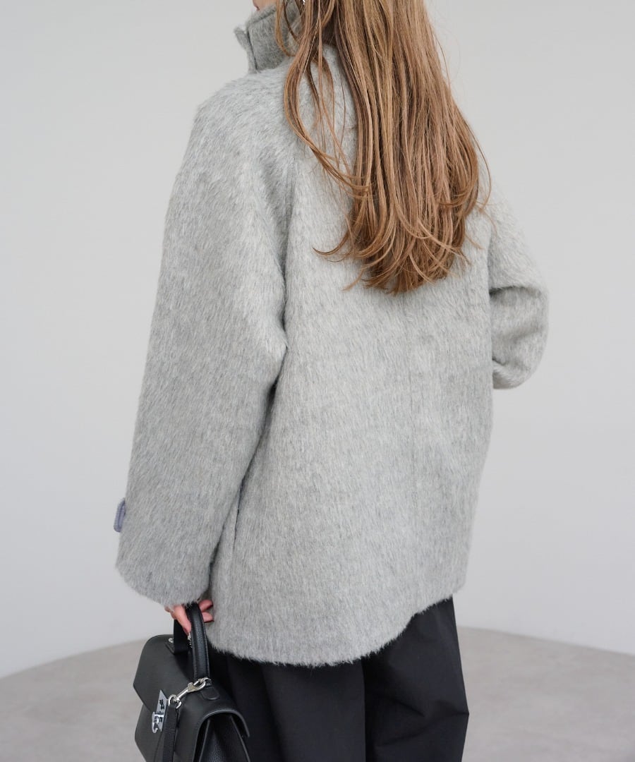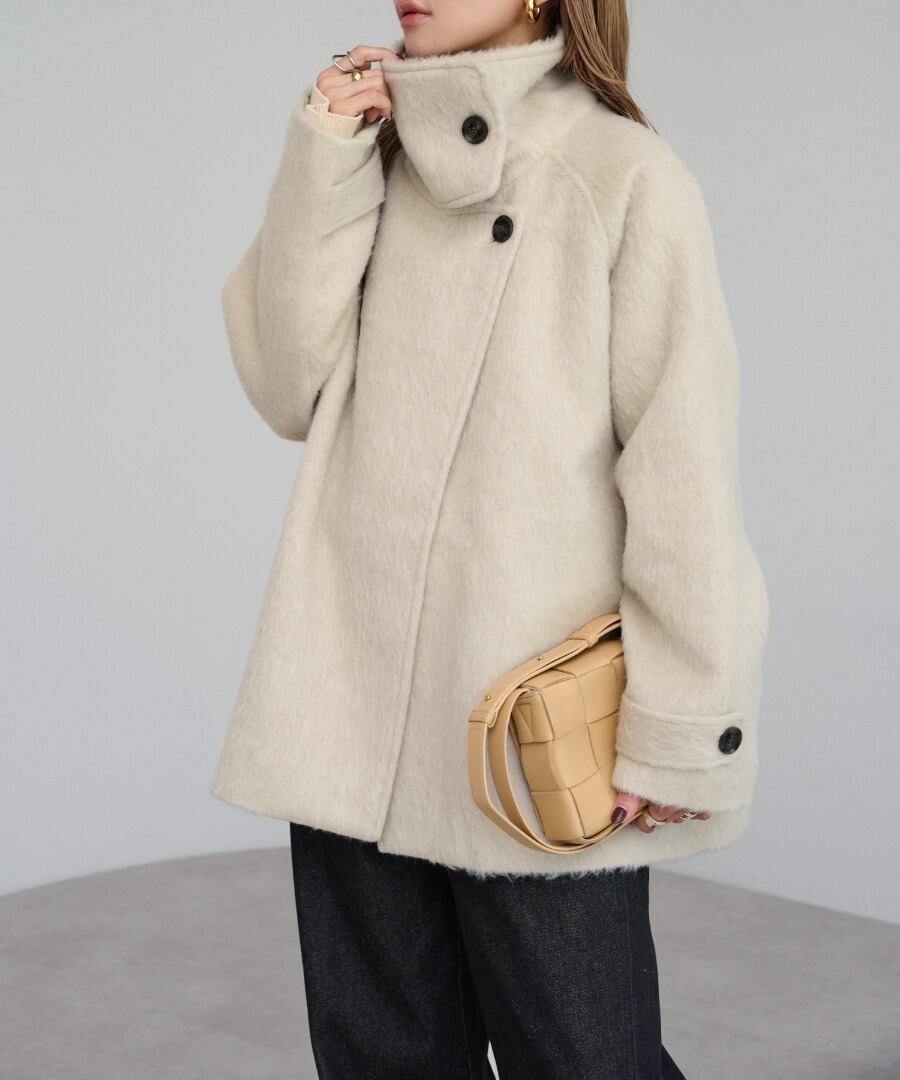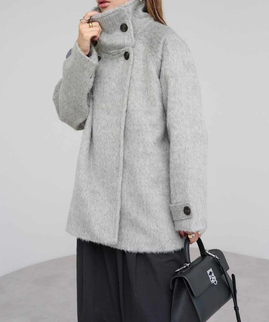 短めの毛足で扱いやすいシャギーが魅力のミドル丈スタンドカラーコート。