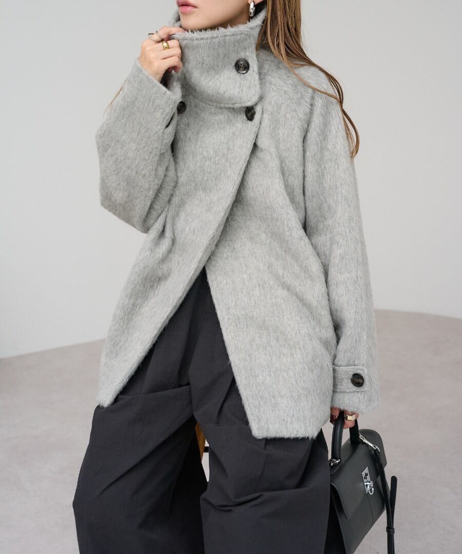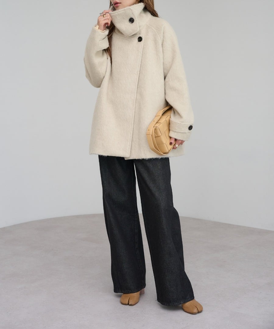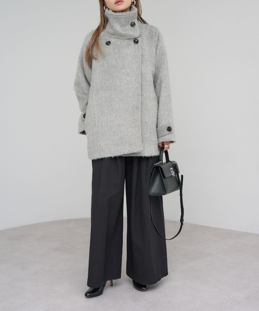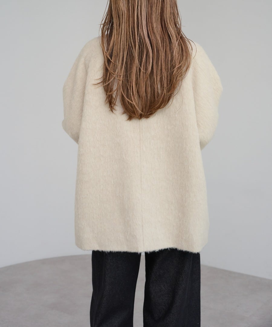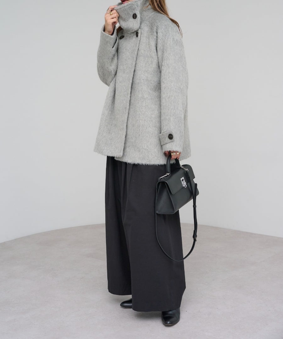 短めの毛足で扱いやすいシャギーが魅力のミドル丈スタンドカラーコート。