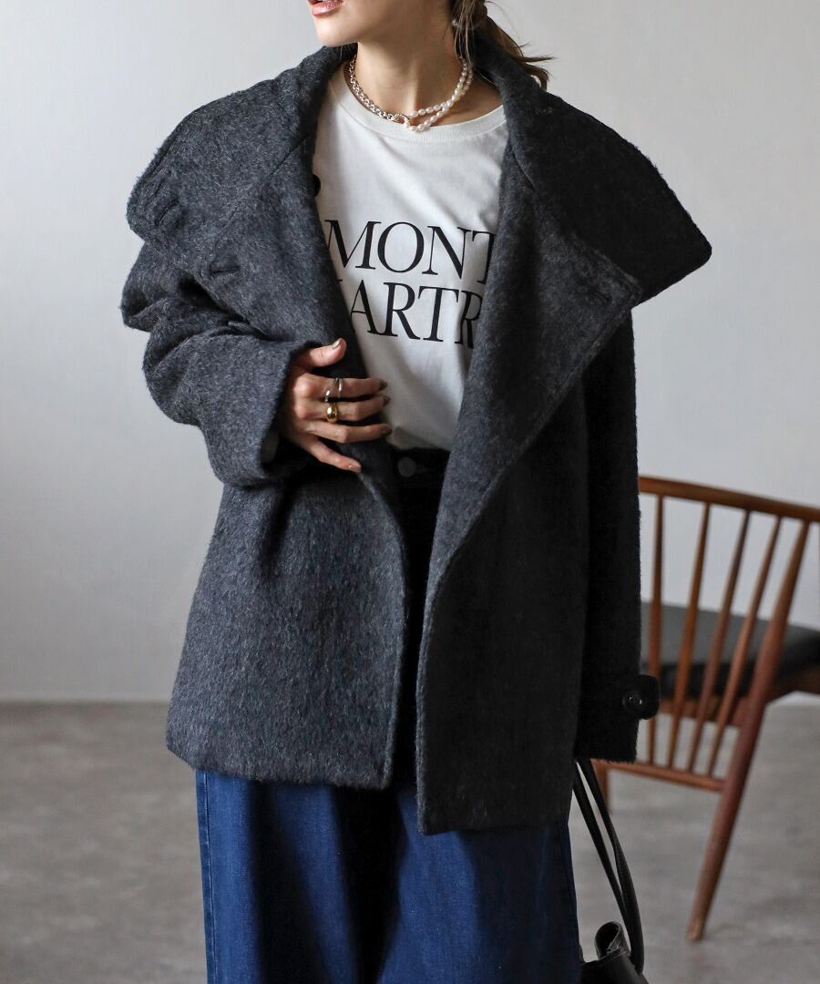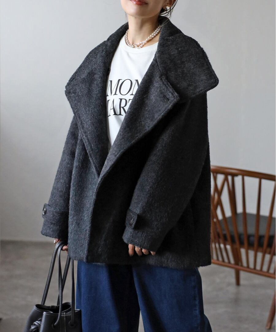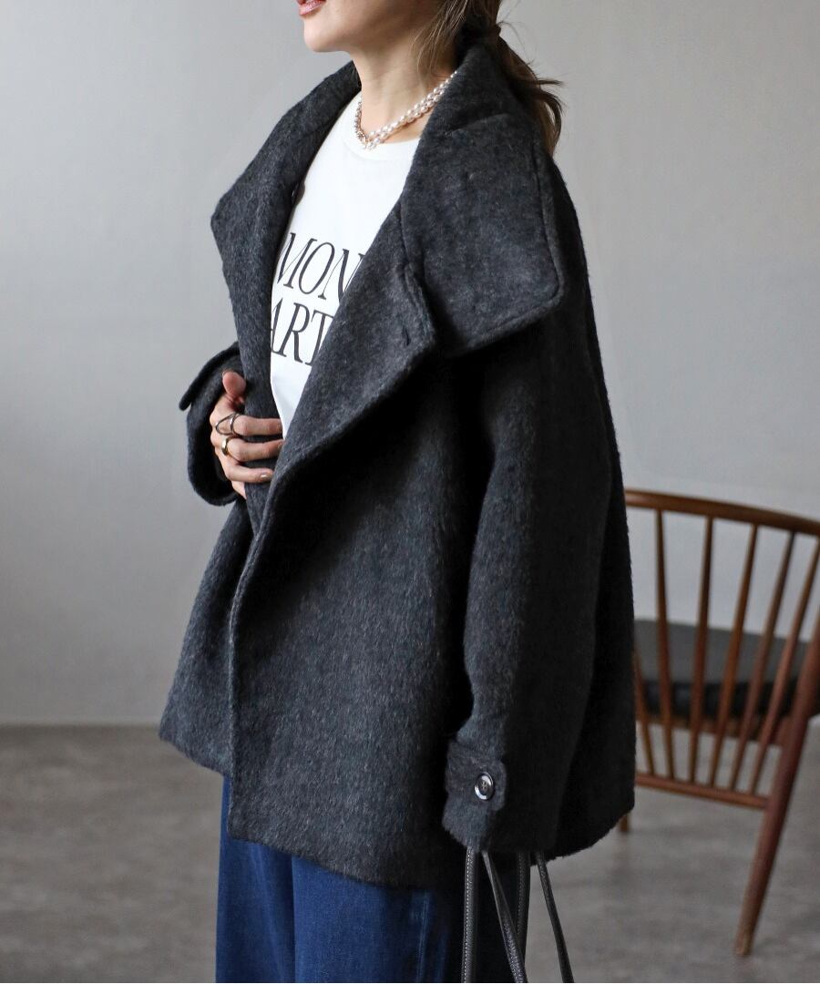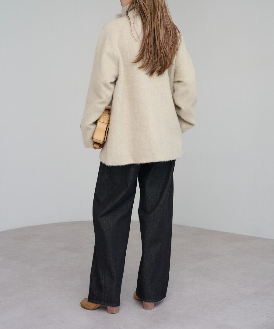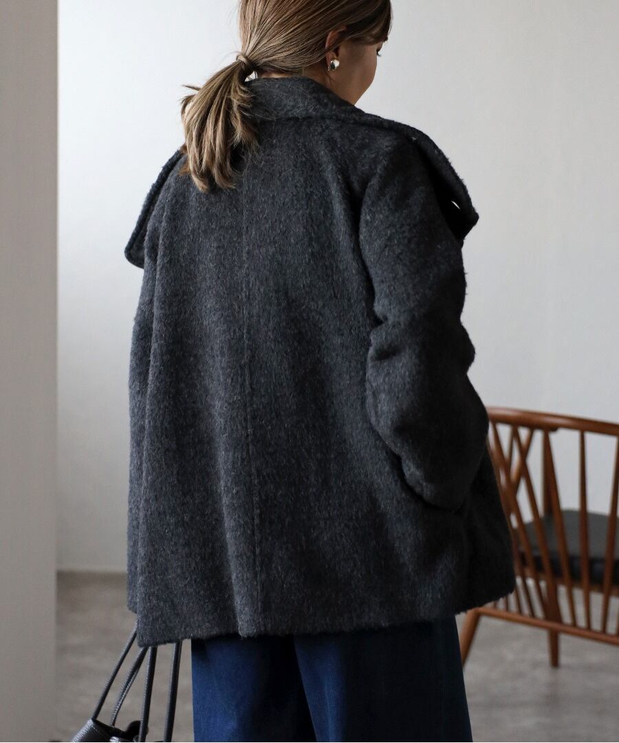 短めの毛足で扱いやすいシャギーが魅力のミドル丈スタンドカラーコート。