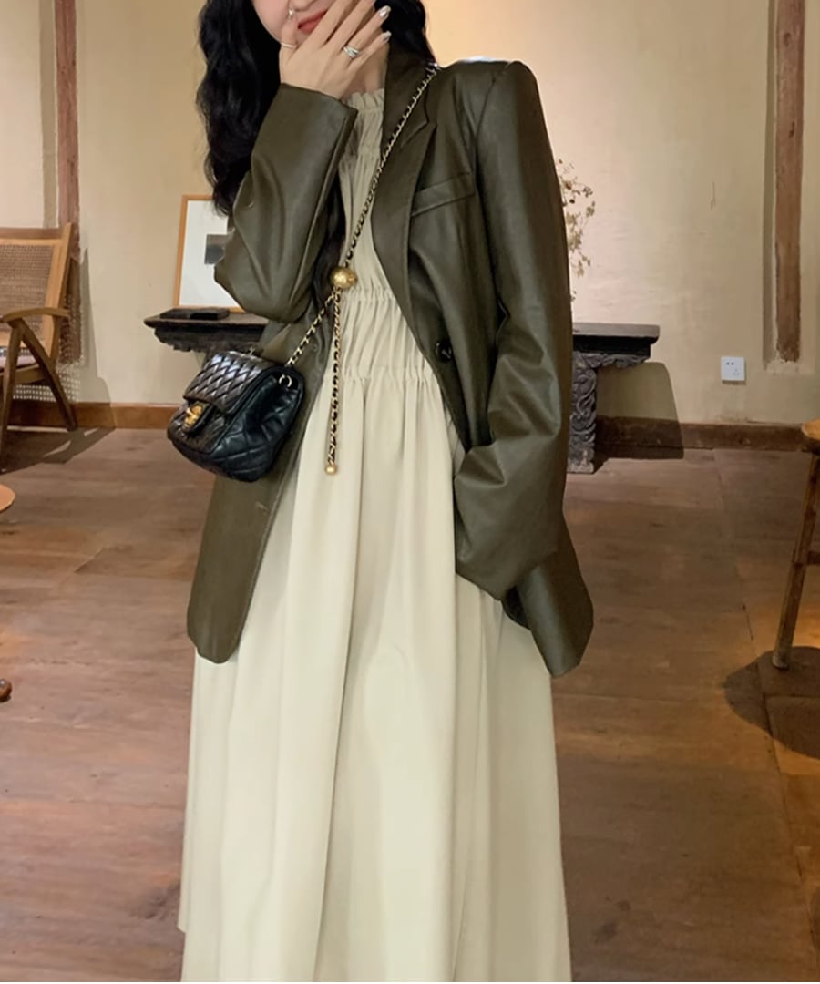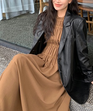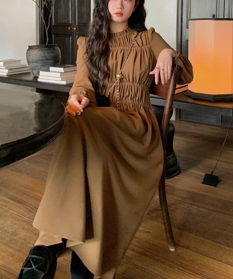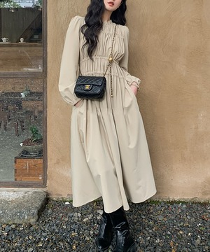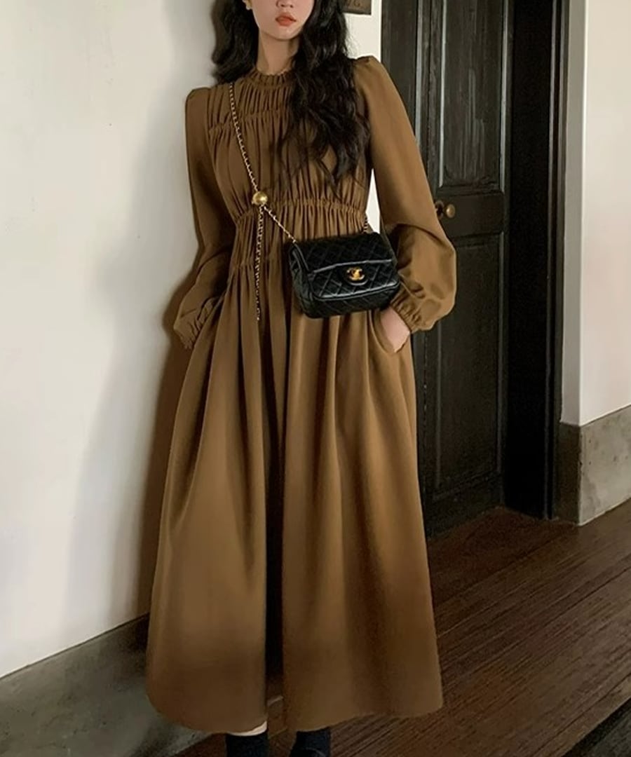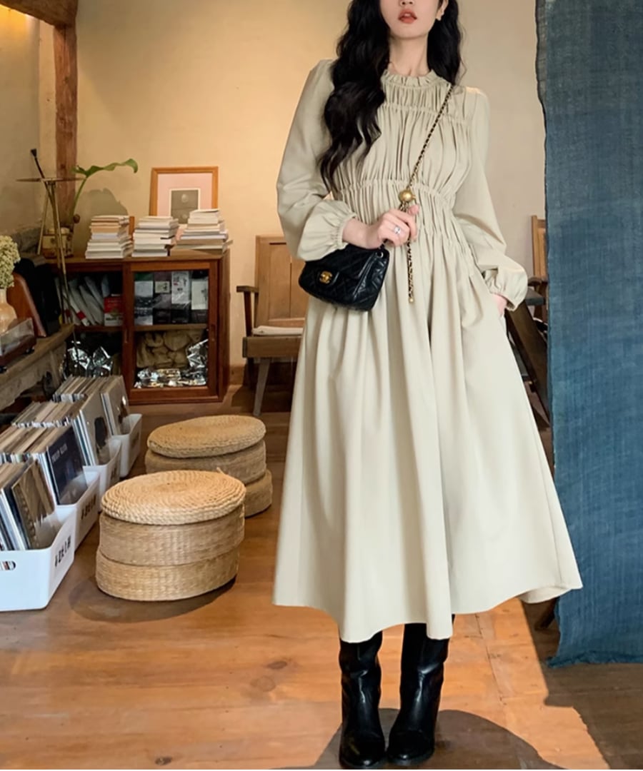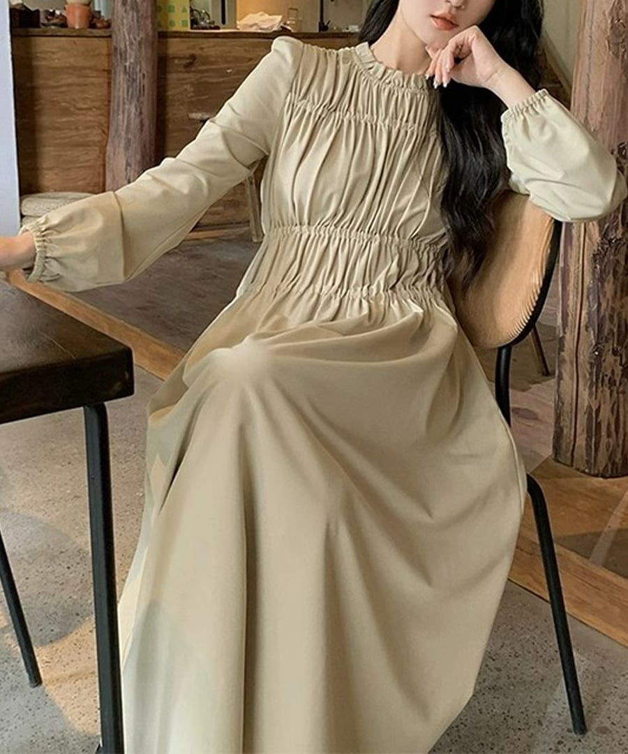 ゆったりとしたシルエットが体型をカバーしつつも、シャーリングのディテールが女性らしい美しさを引き立てます。