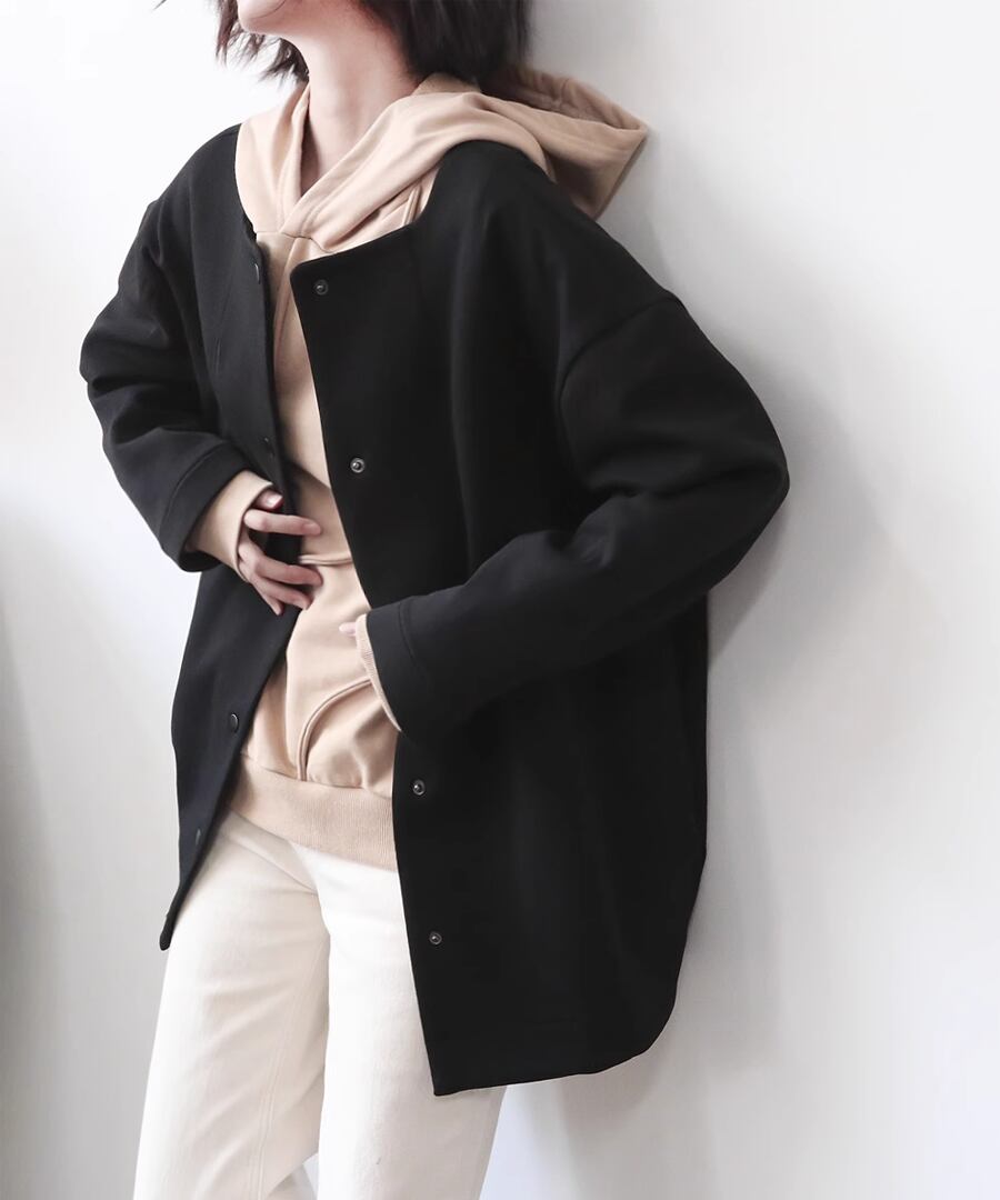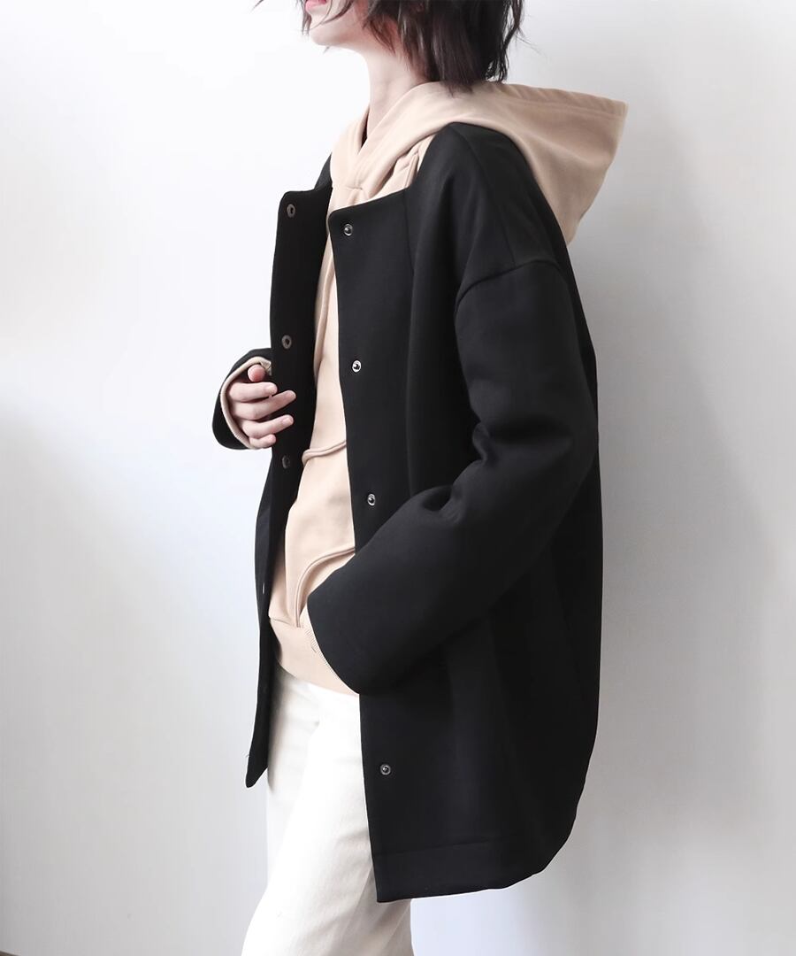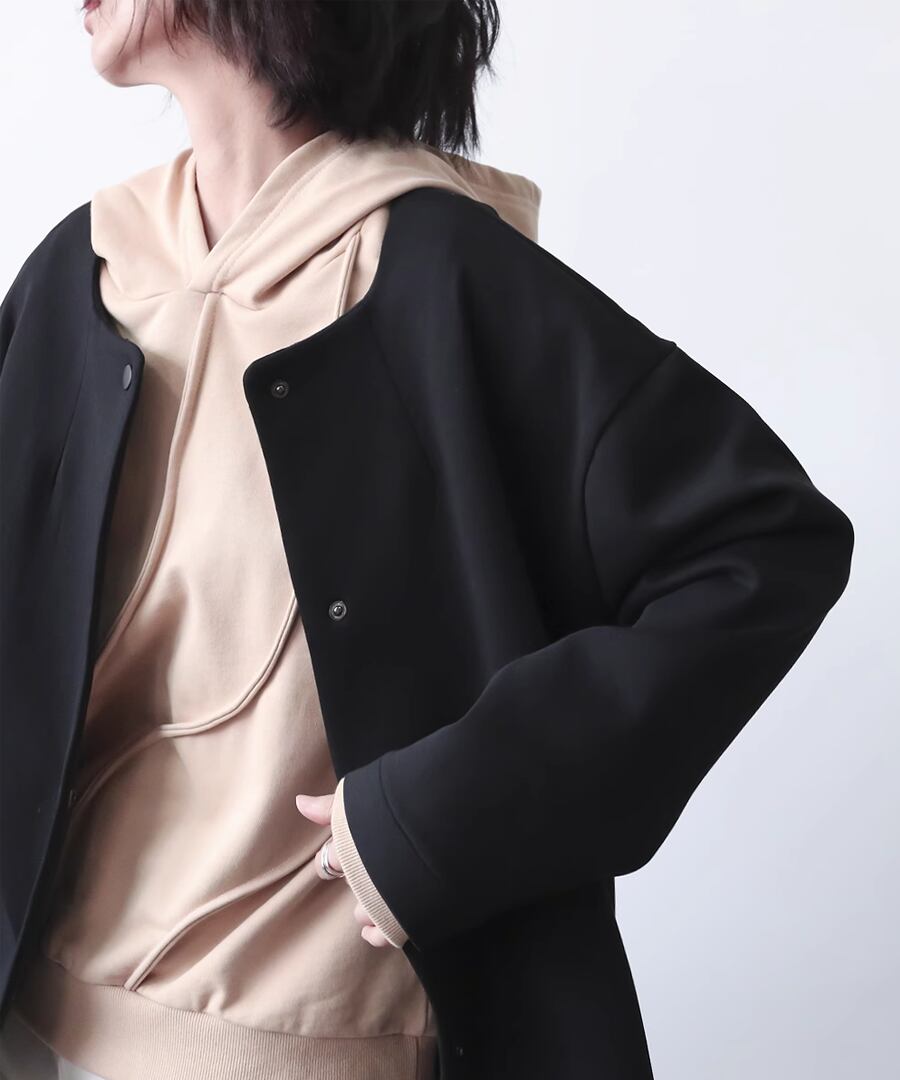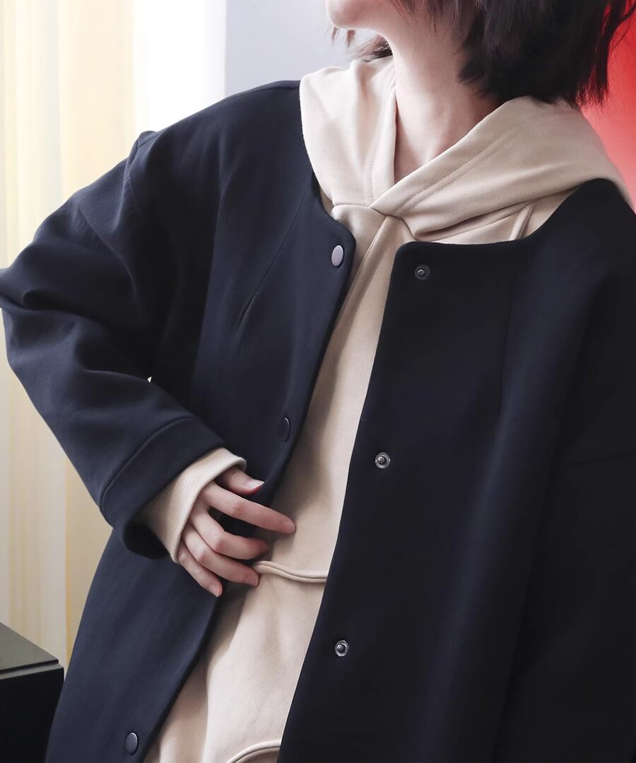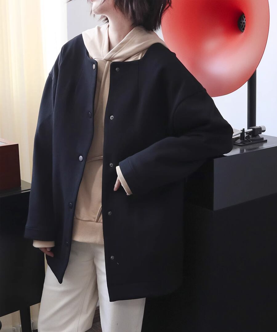 ラウンドネックデザインのシンプルなジャケット。