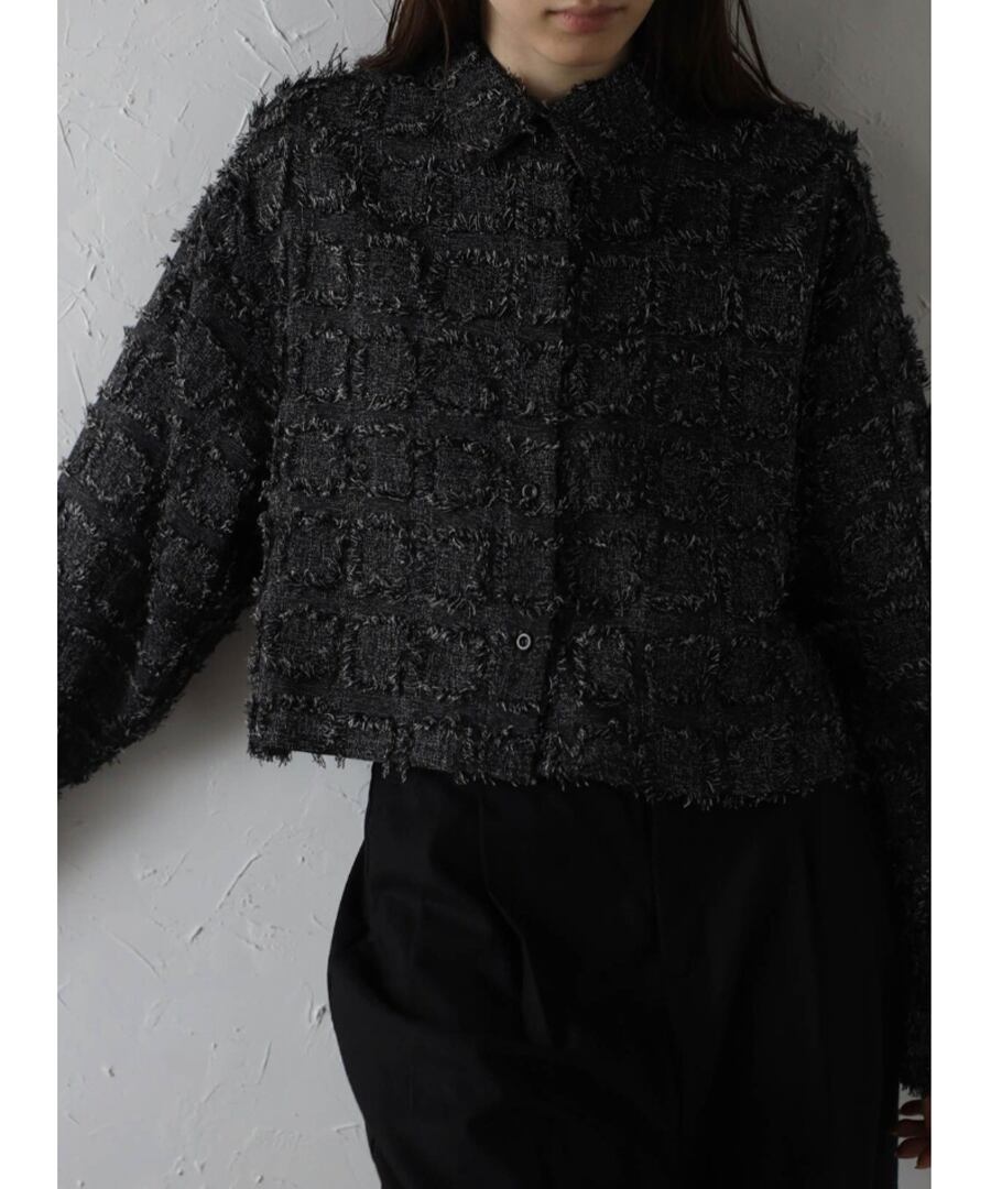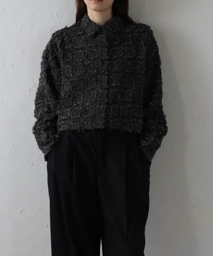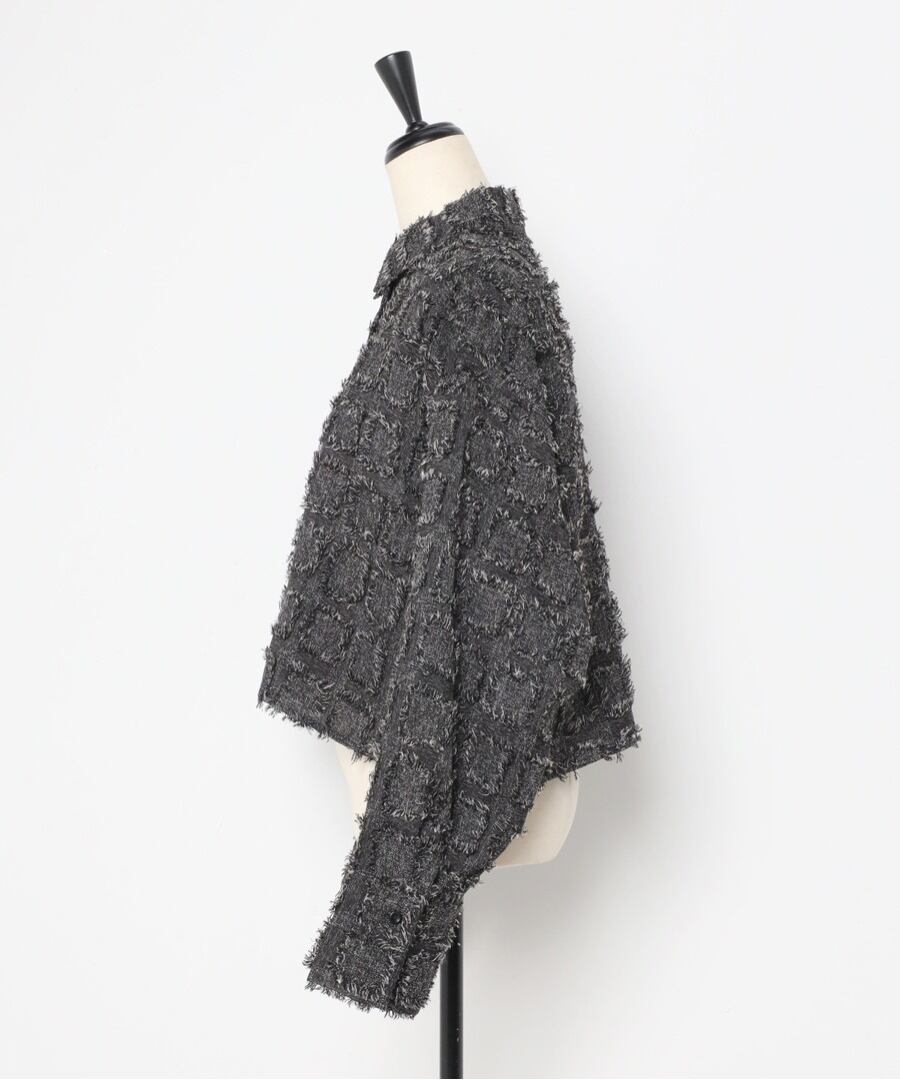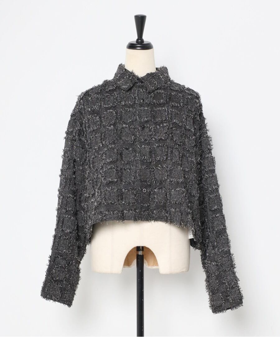 モード感溢れるデザインが魅力の、フリンジ素材が目を惹くクロップドシャツ。