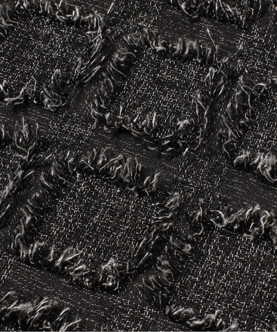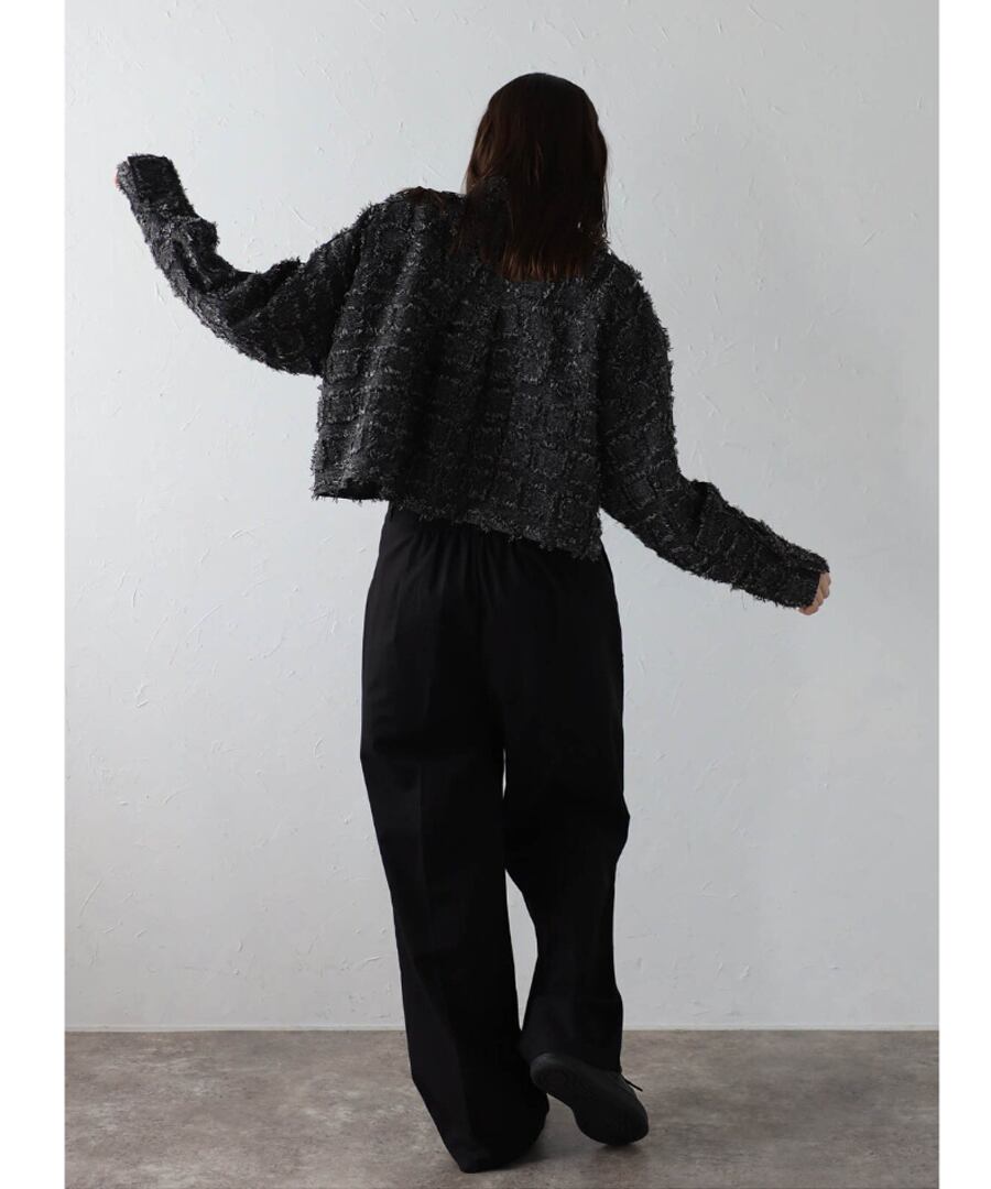 立体的なテクスチャーが、シンプルなコーディネートにアクセントをプラスします。