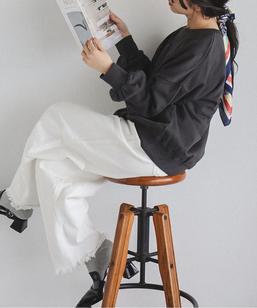 ラウンドネックが首元をすっきり見せ、抜け感のあるシンプルコーデに。