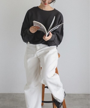 前後に施されたロゴ刺繍が、シンプルながら印象的なスウェット。
