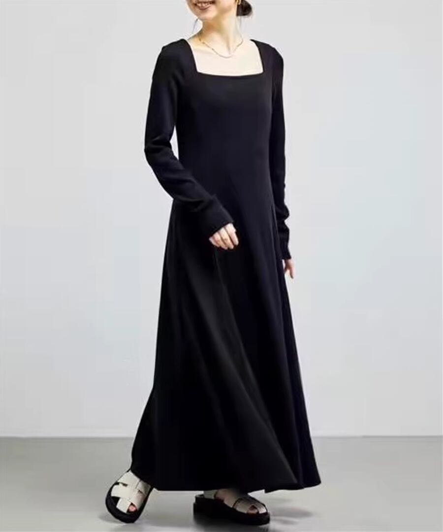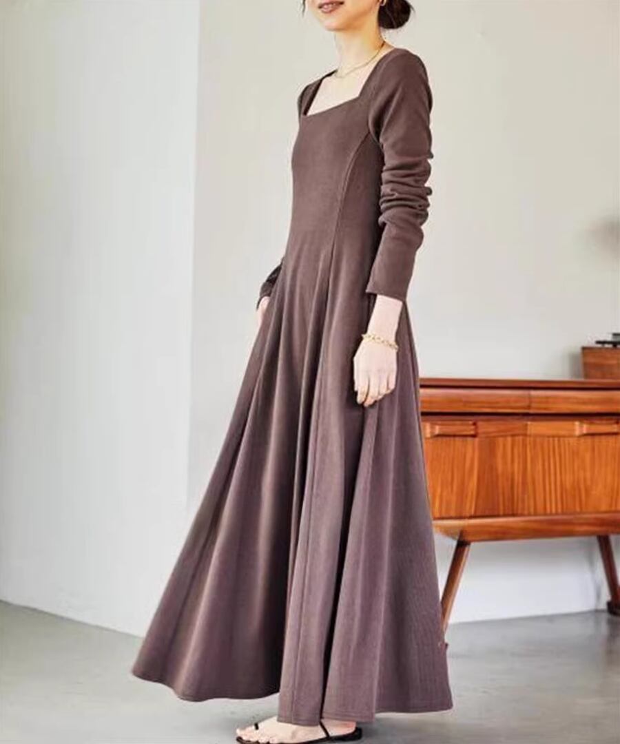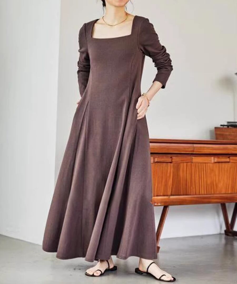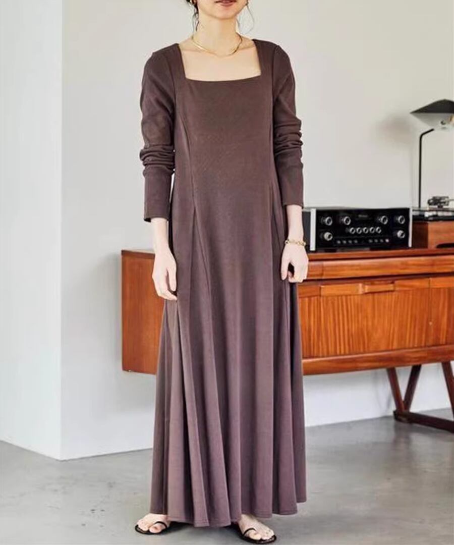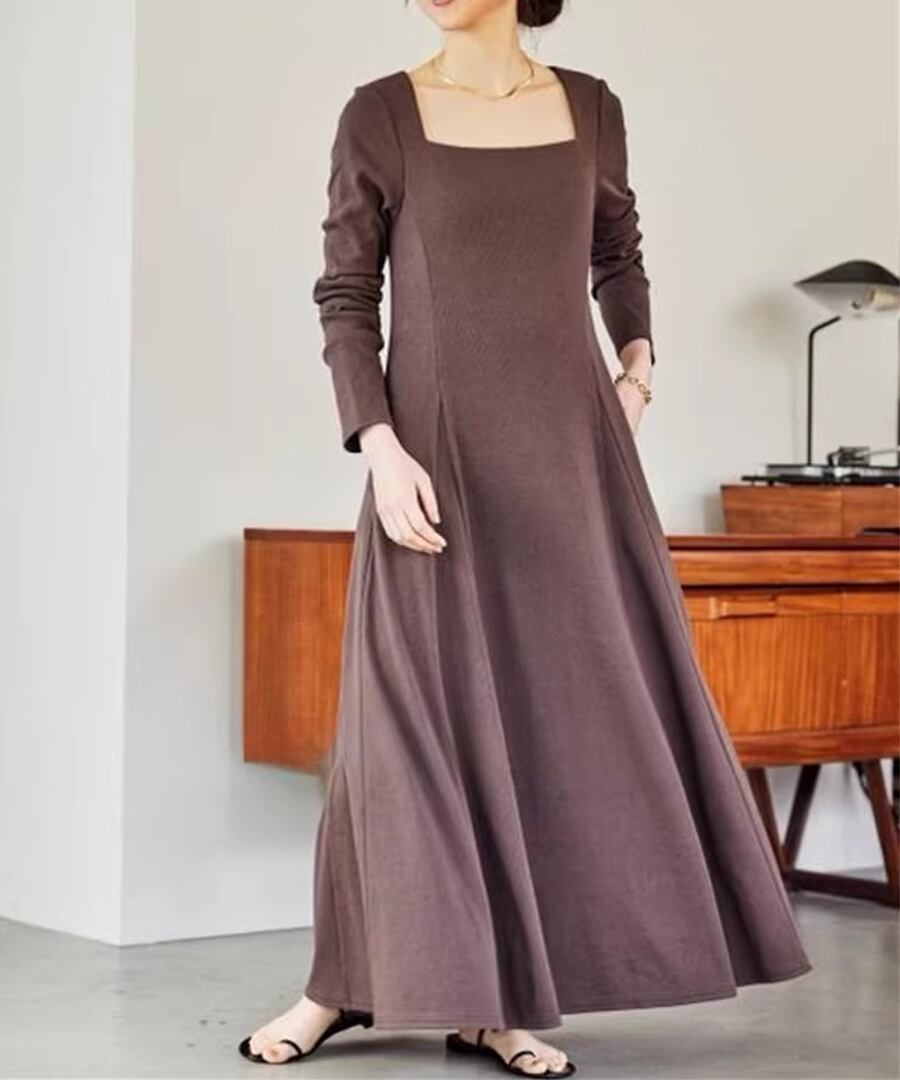 スクエアネックデザインのフレアワンピは、全体を優雅に包み込み、動くたびにふんわりとした印象を与えます。