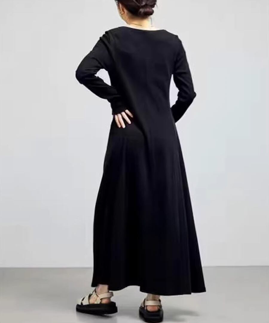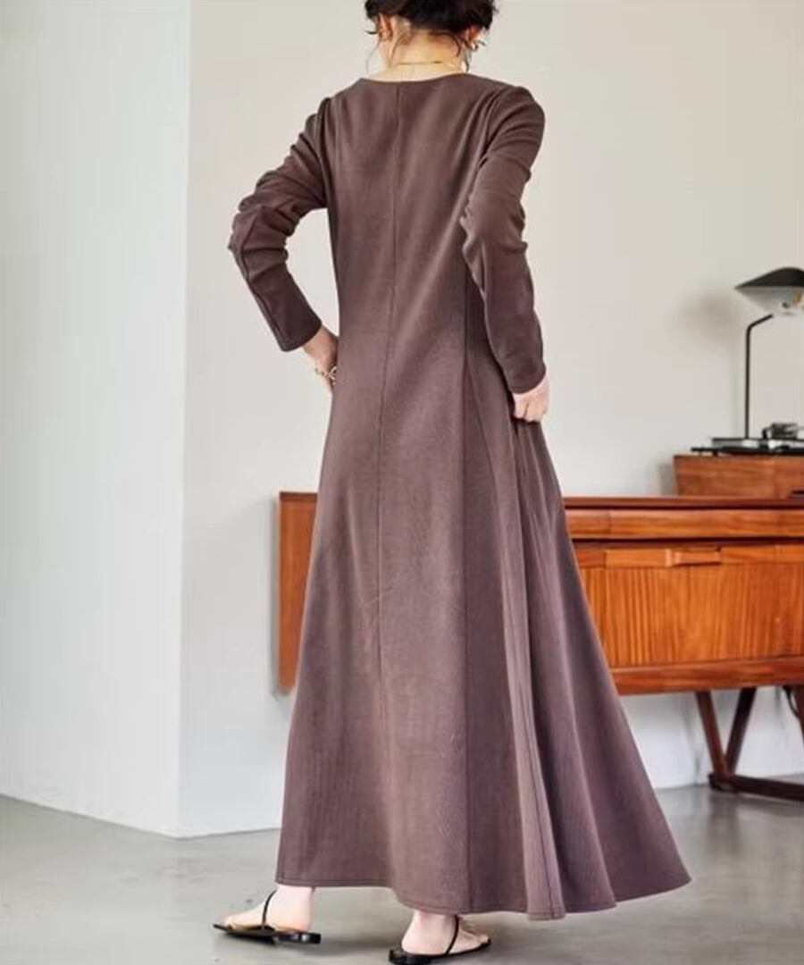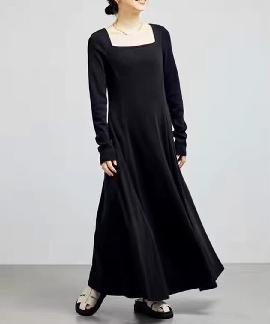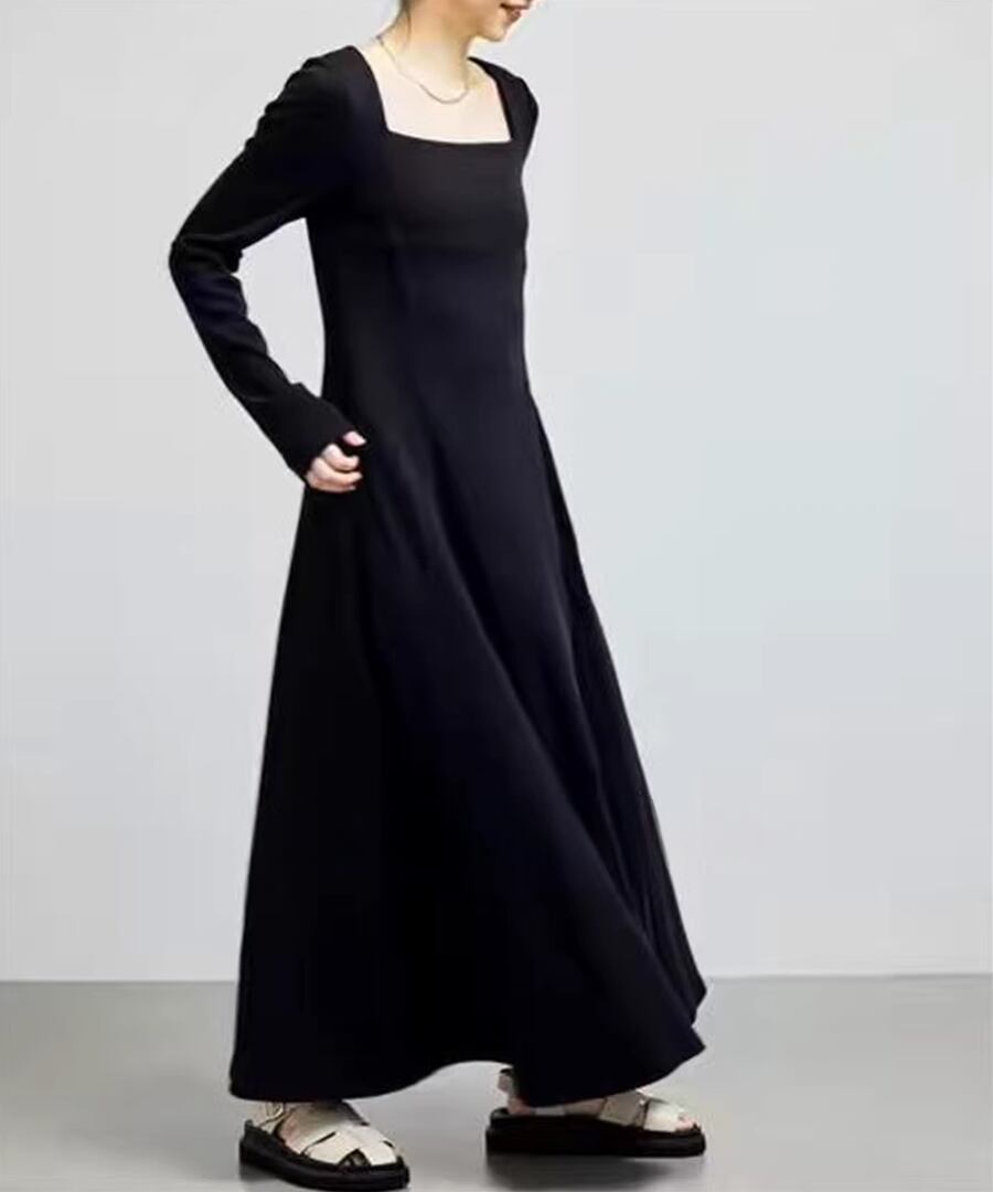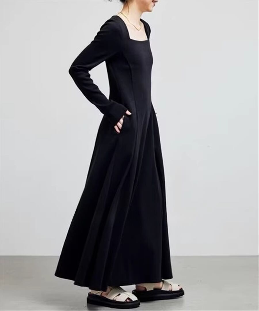 スクエアネックデザインのフレアワンピは、全体を優雅に包み込み、動くたびにふんわりとした印象を与えます。