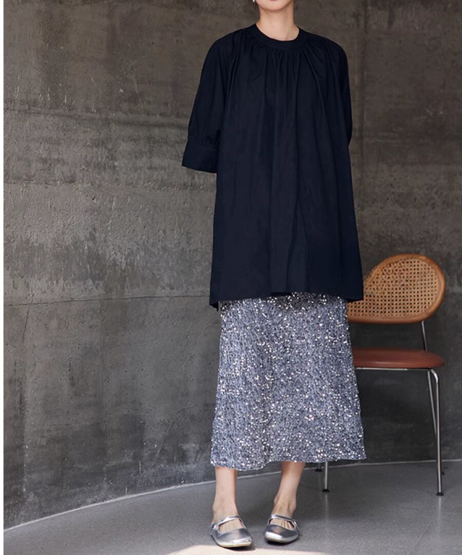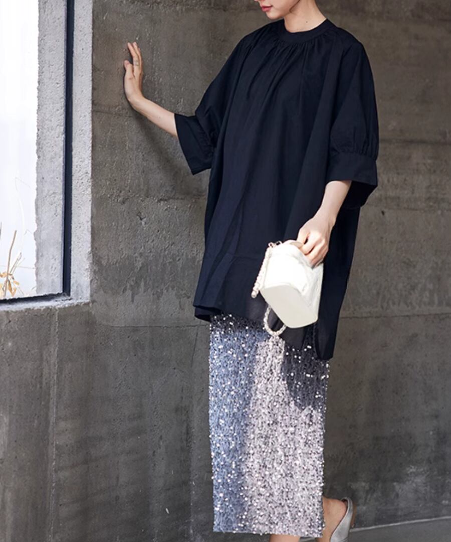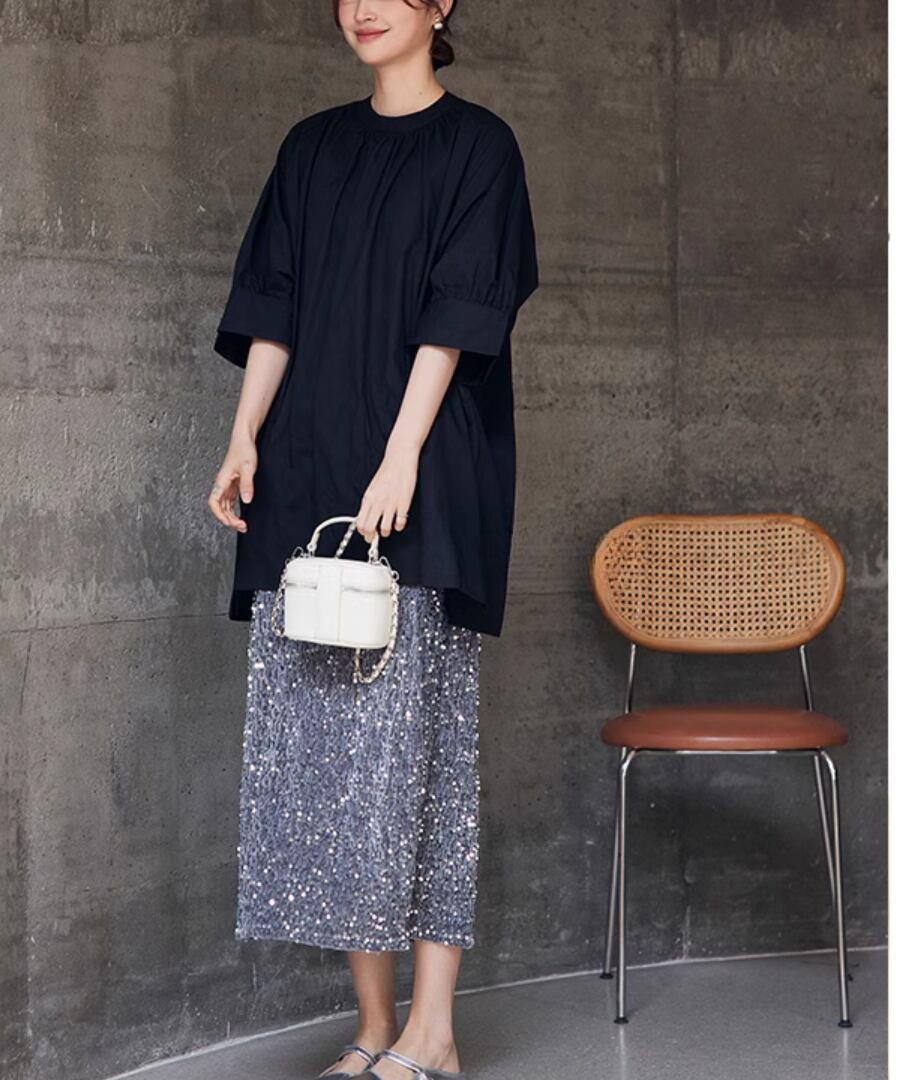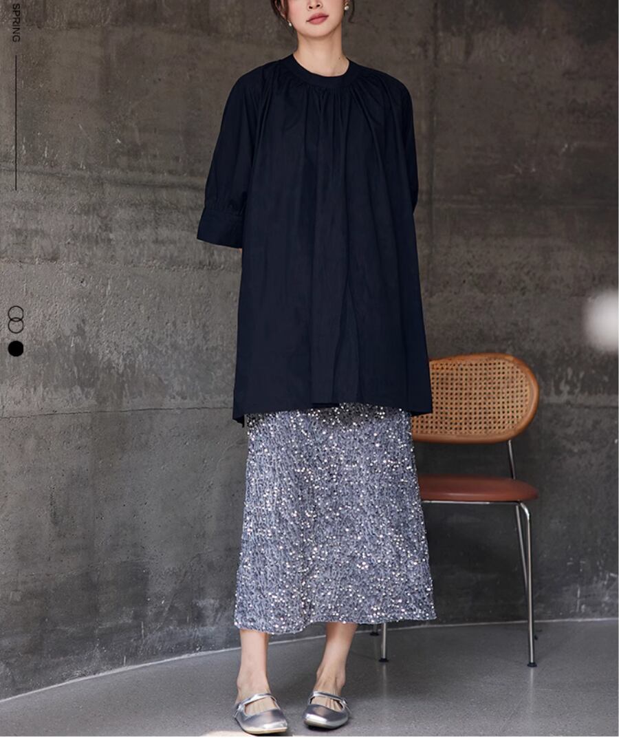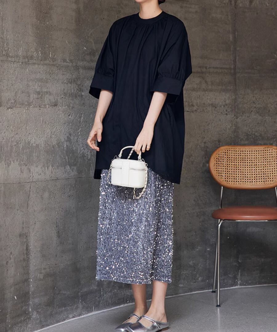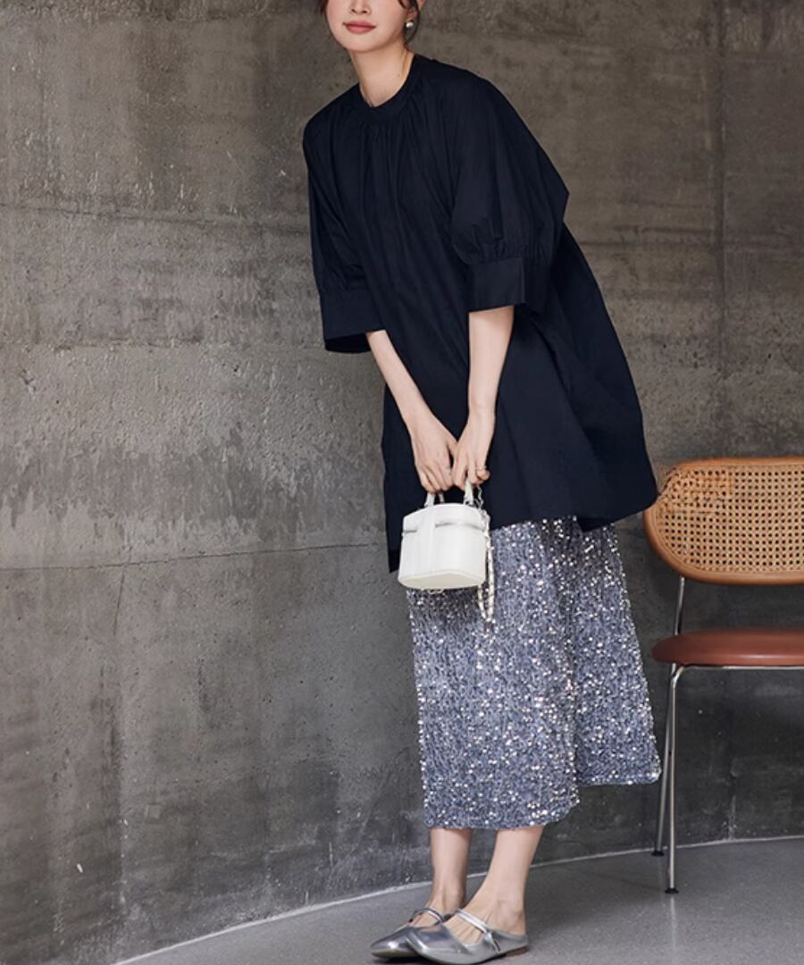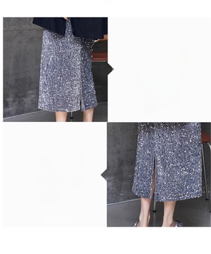 優雅で華やかな印象を与える、スパンコールスカート