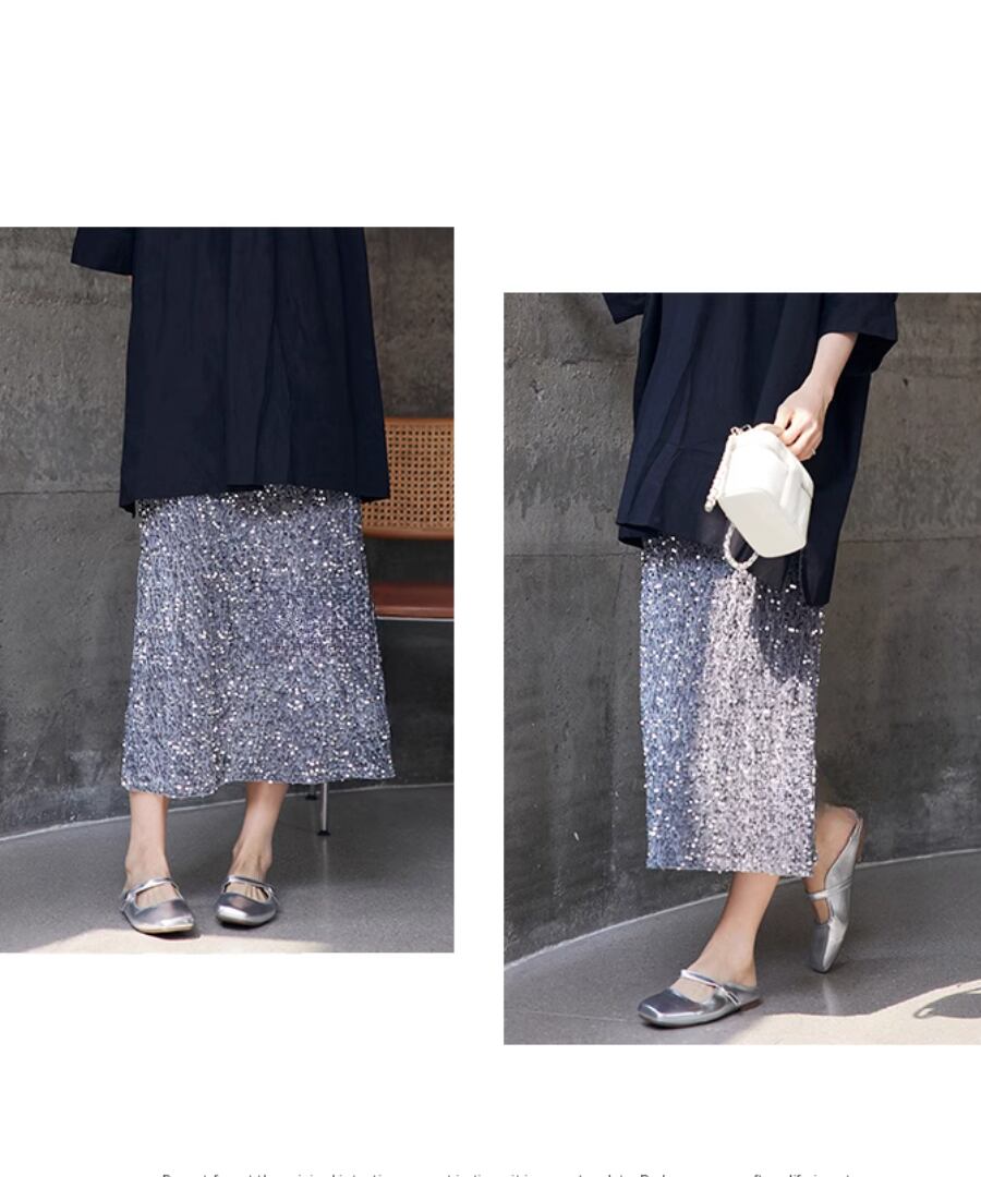 スパンコールが施された表面が光を反射し、華やかさを引き立てる魅力的なスカート。