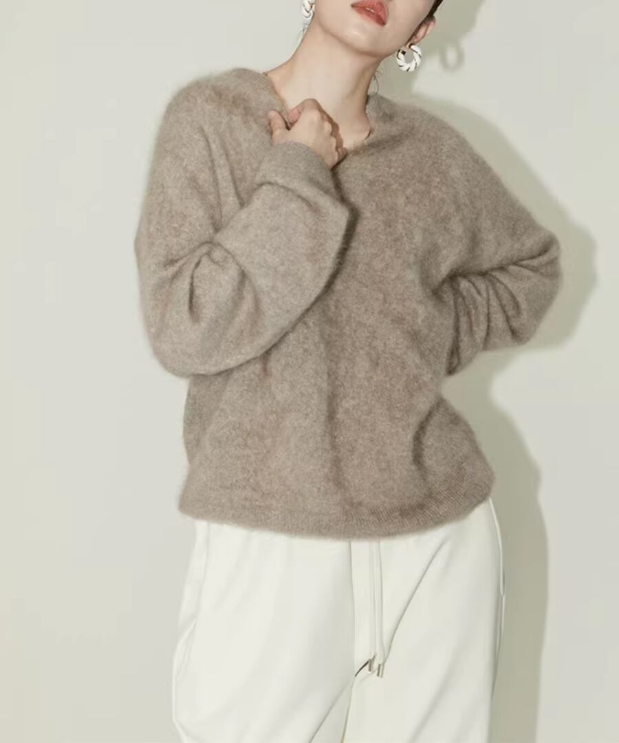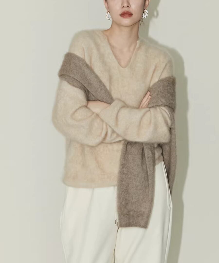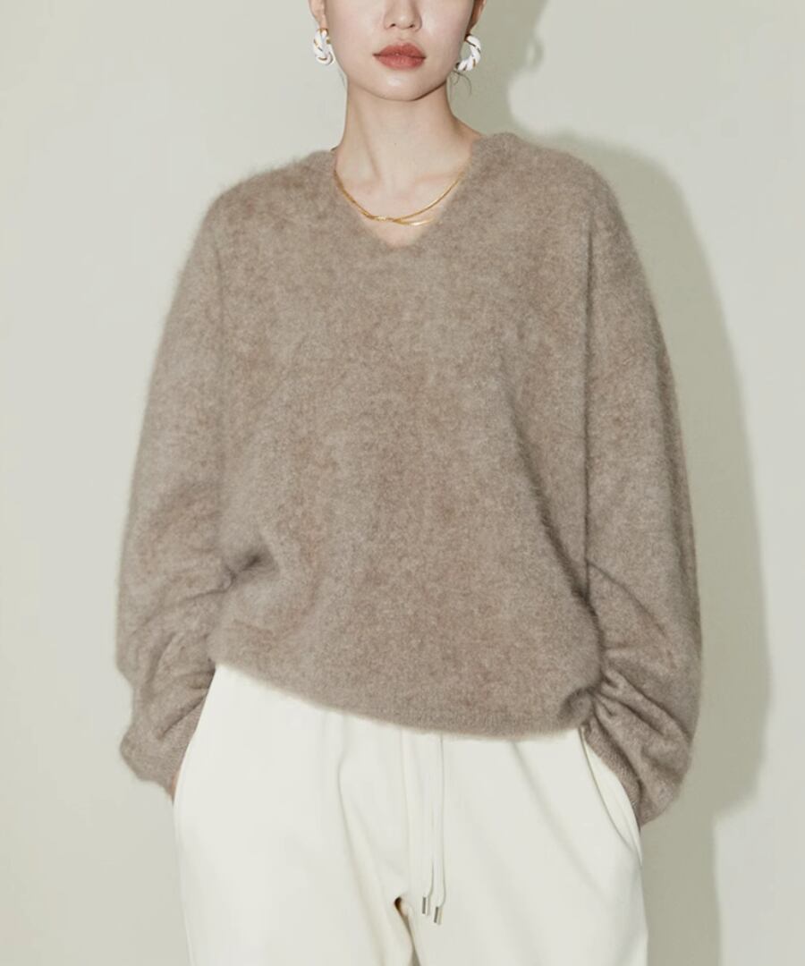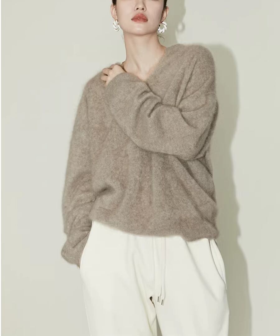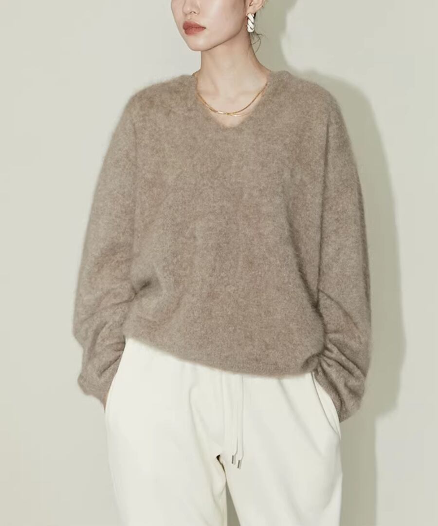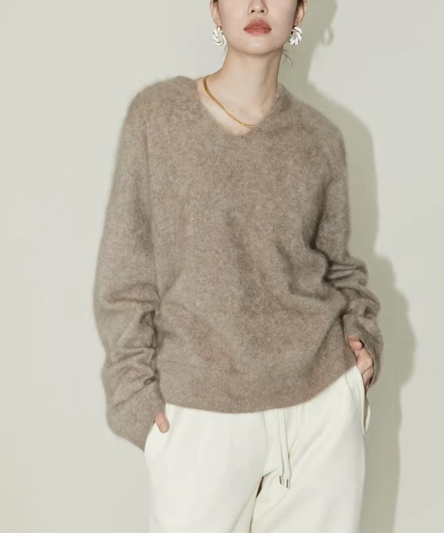 柔らかな風合いと洗練されたVネックデザインが特徴。