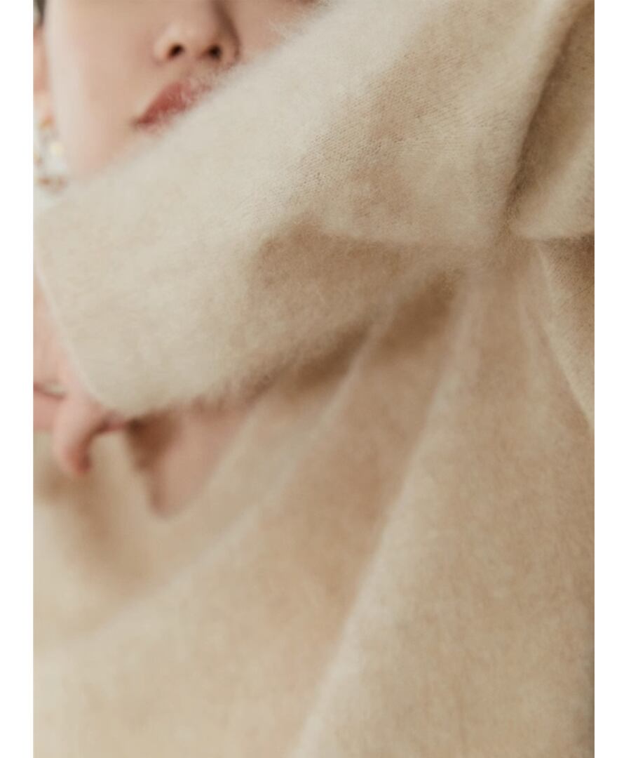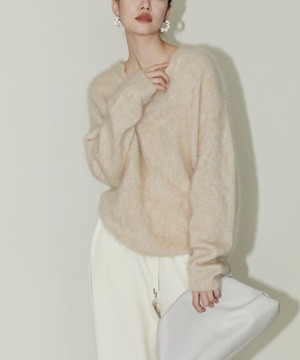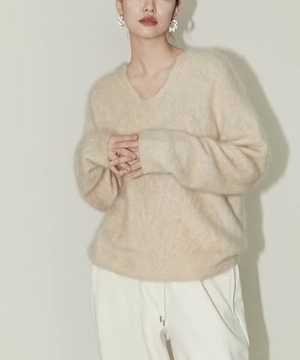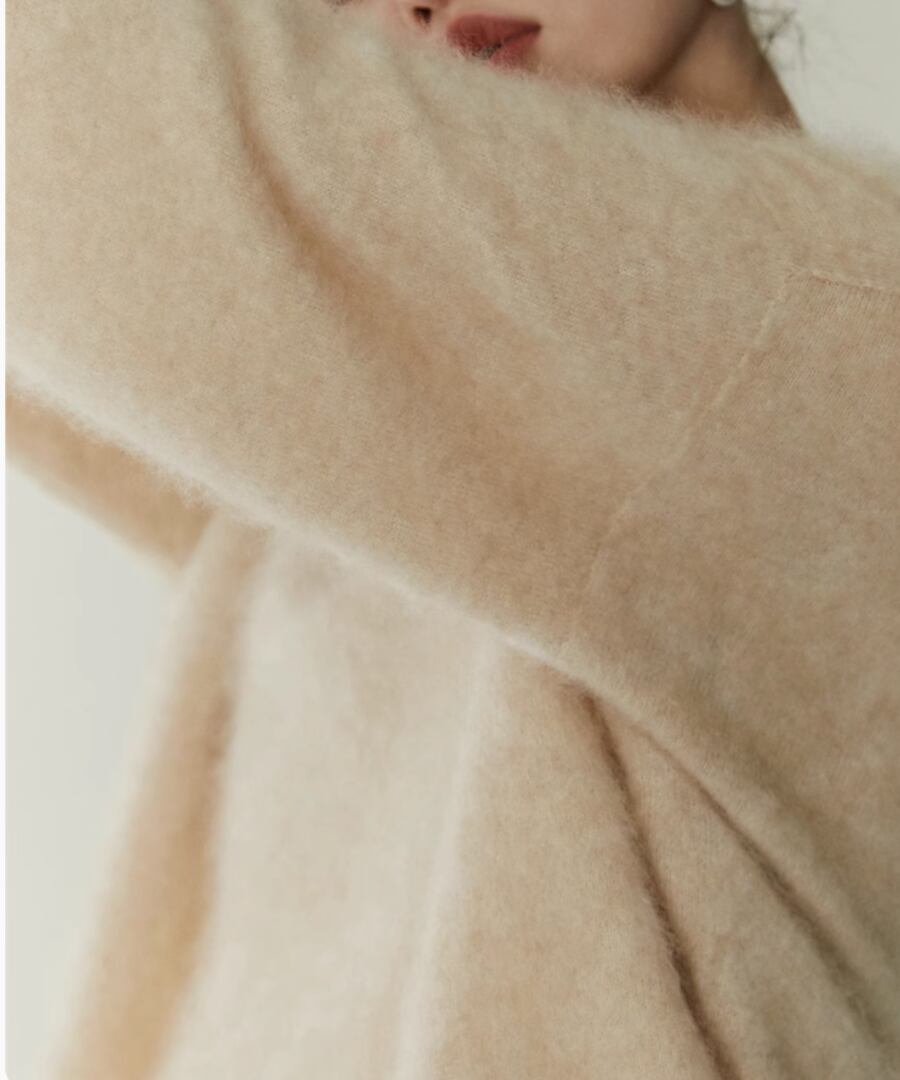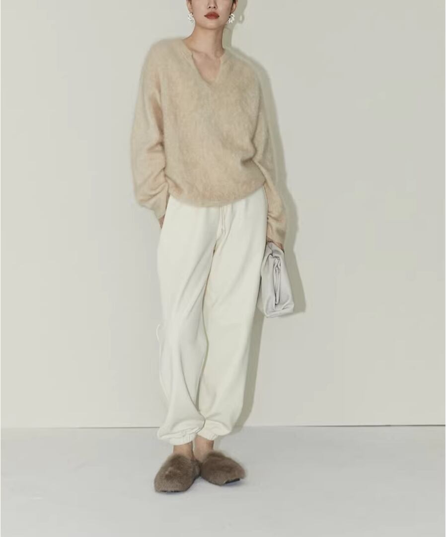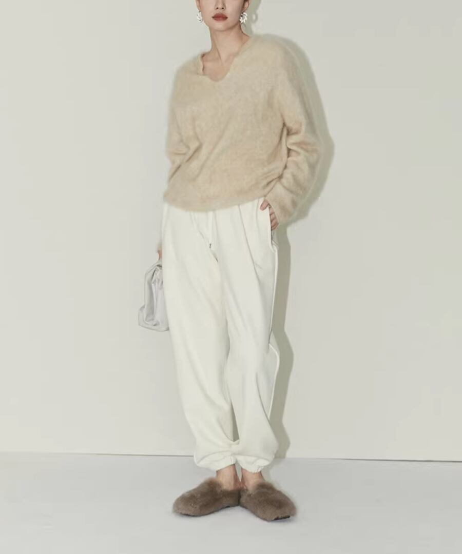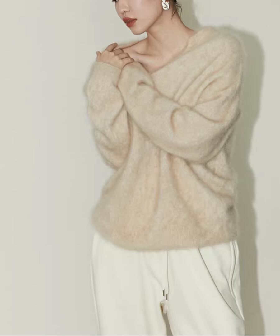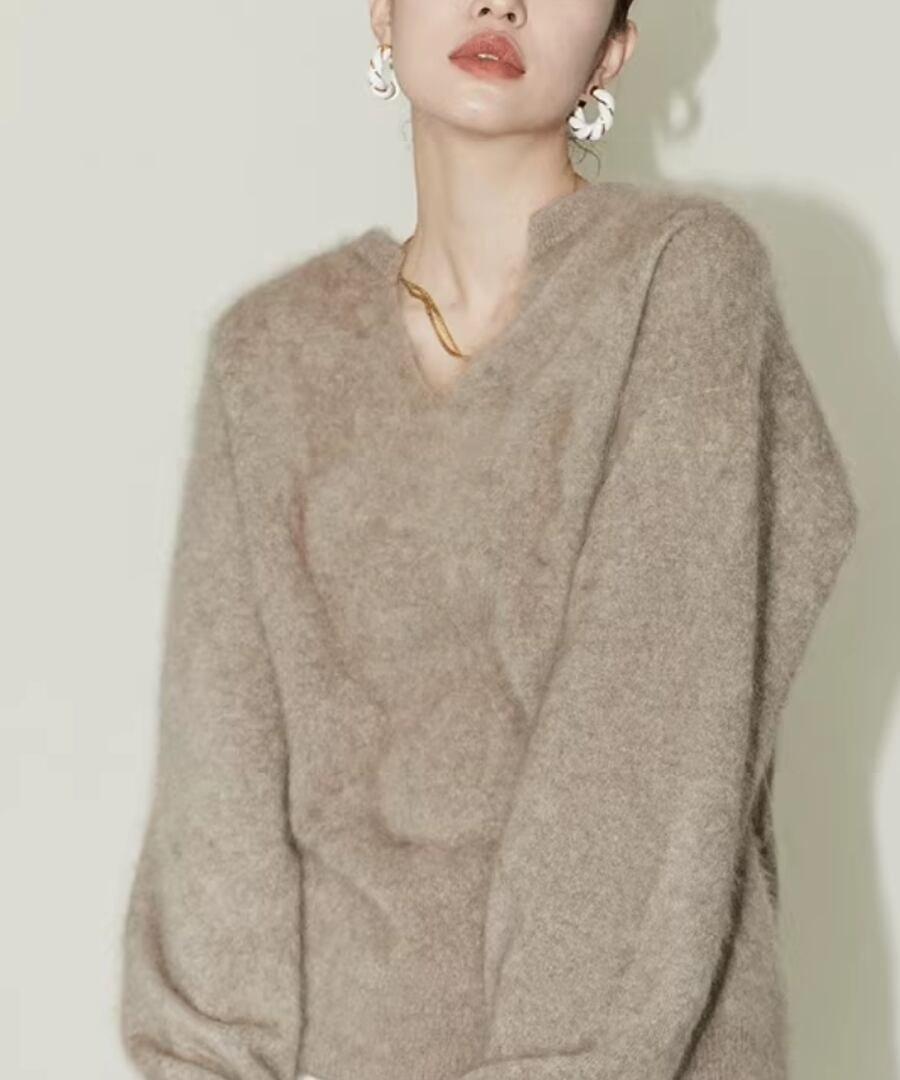 柔らかな風合いと洗練されたVネックデザインが特徴。