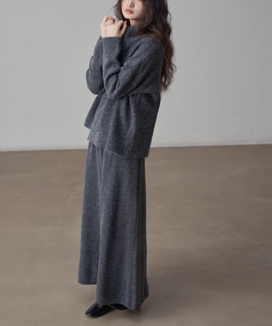 Vネックニットは、デコルテを美しく引き立て、スカートとのバランスが絶妙です。