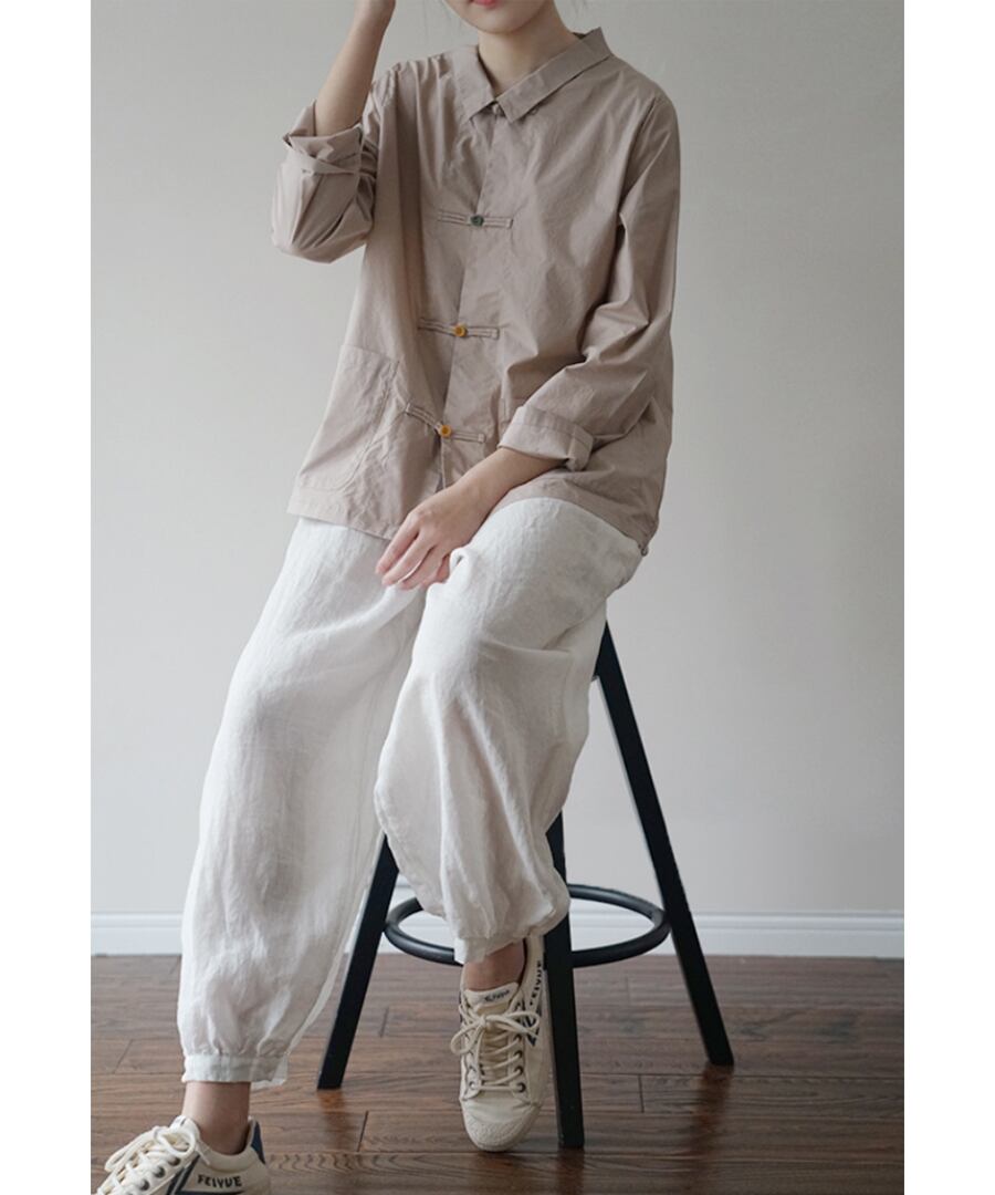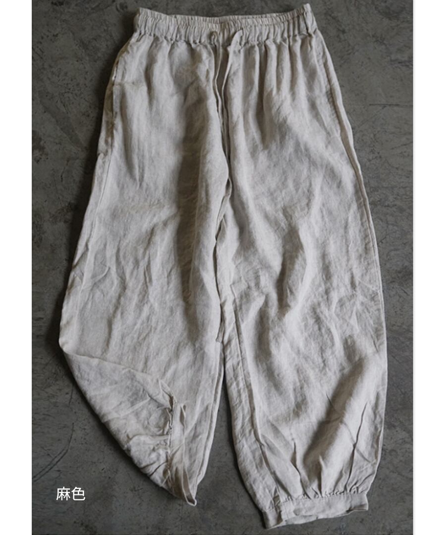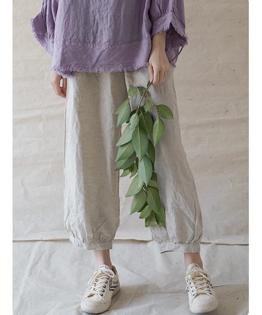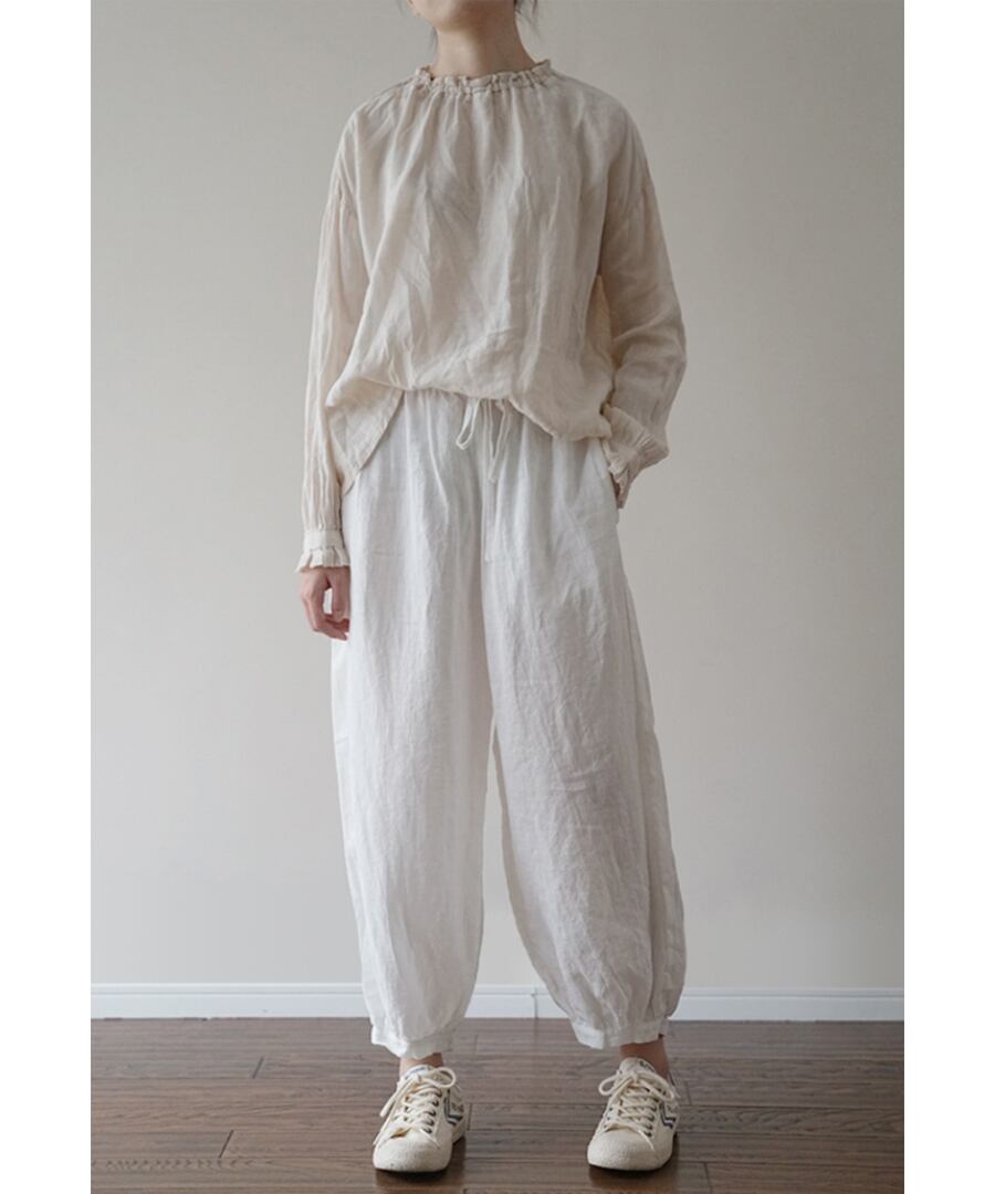 心地よいリネン素材で、裾にギャザーを施したパンツ。