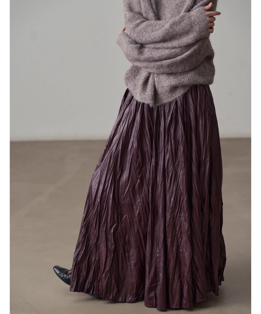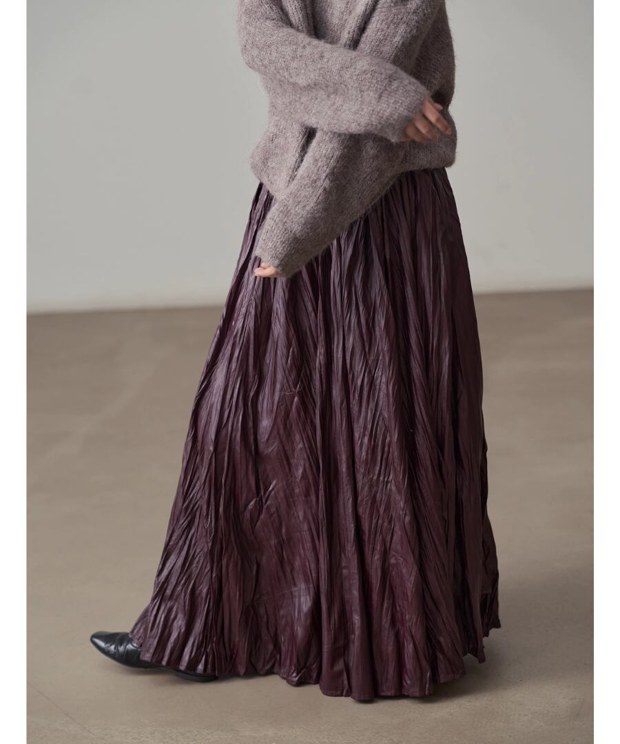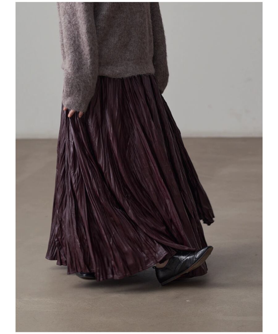 洗練されたスタイルを演出するフェイクレザーのプリーツロングスカート。