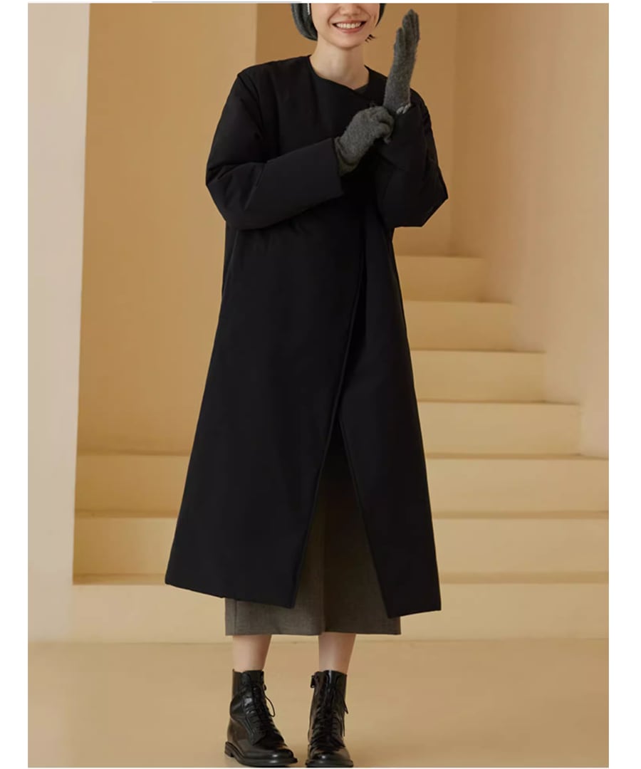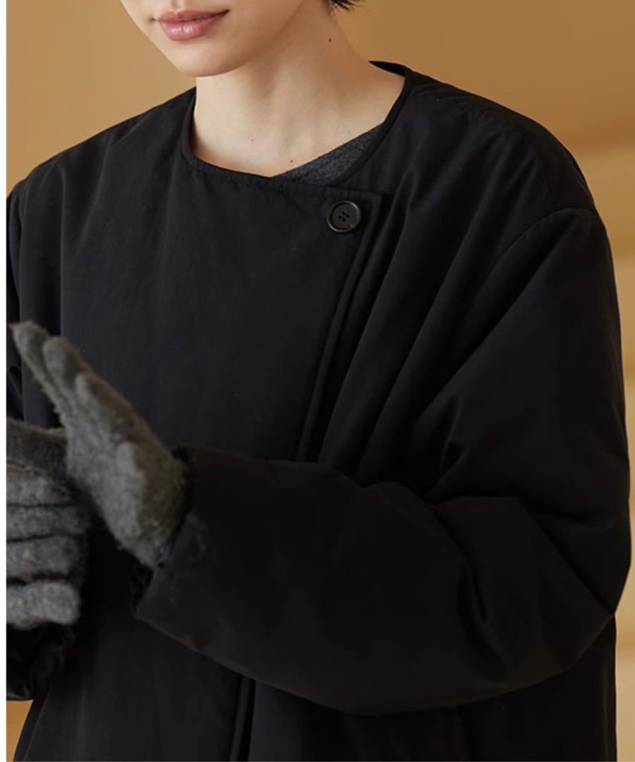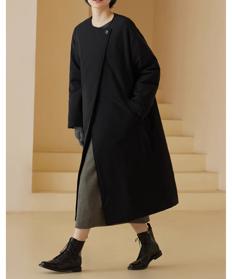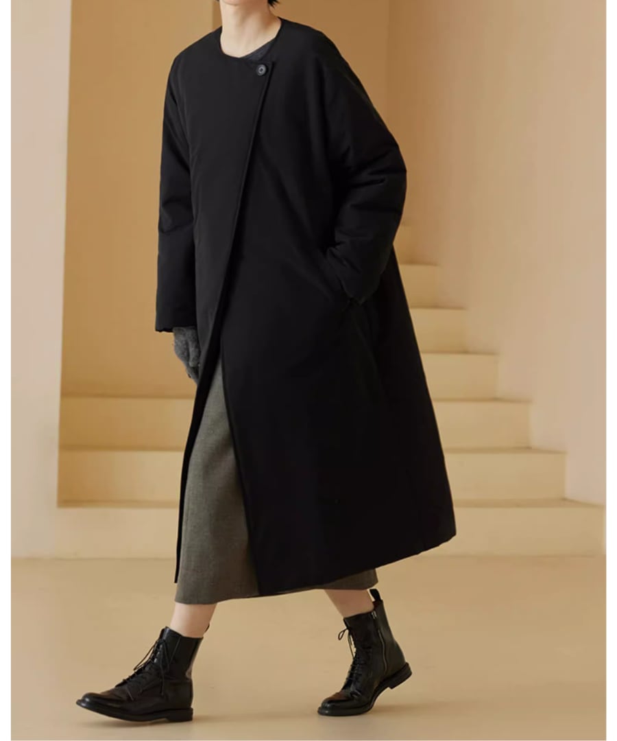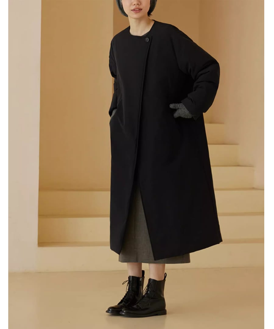 ノーカラーのデザインが洗練された印象を与え、どんなスタイルにも合わせやすい一着です。