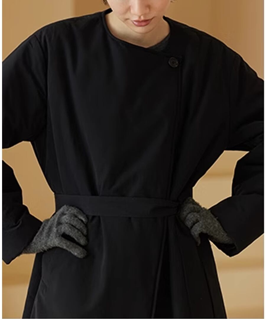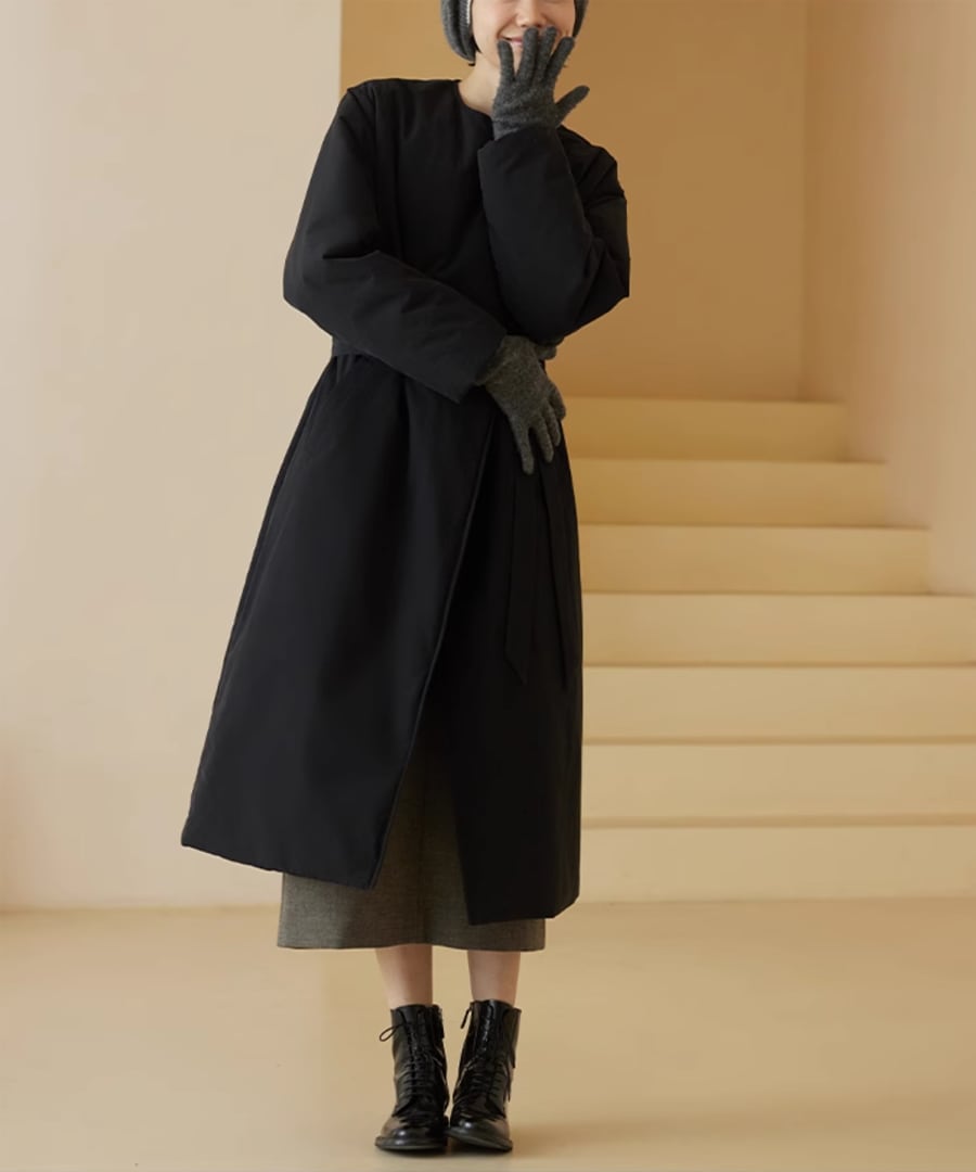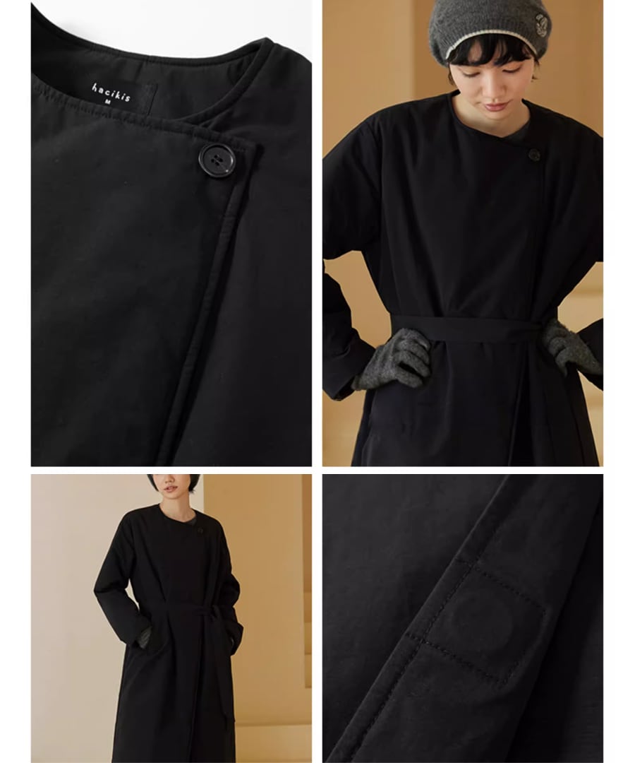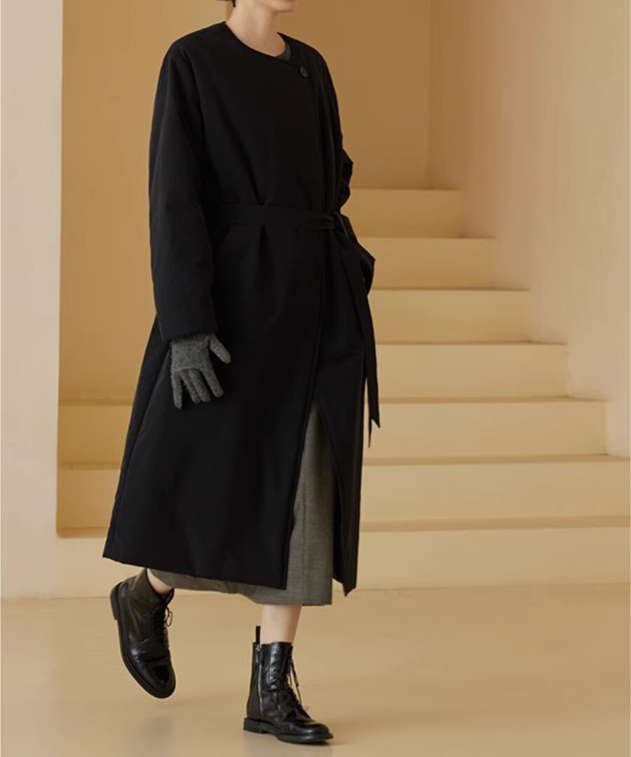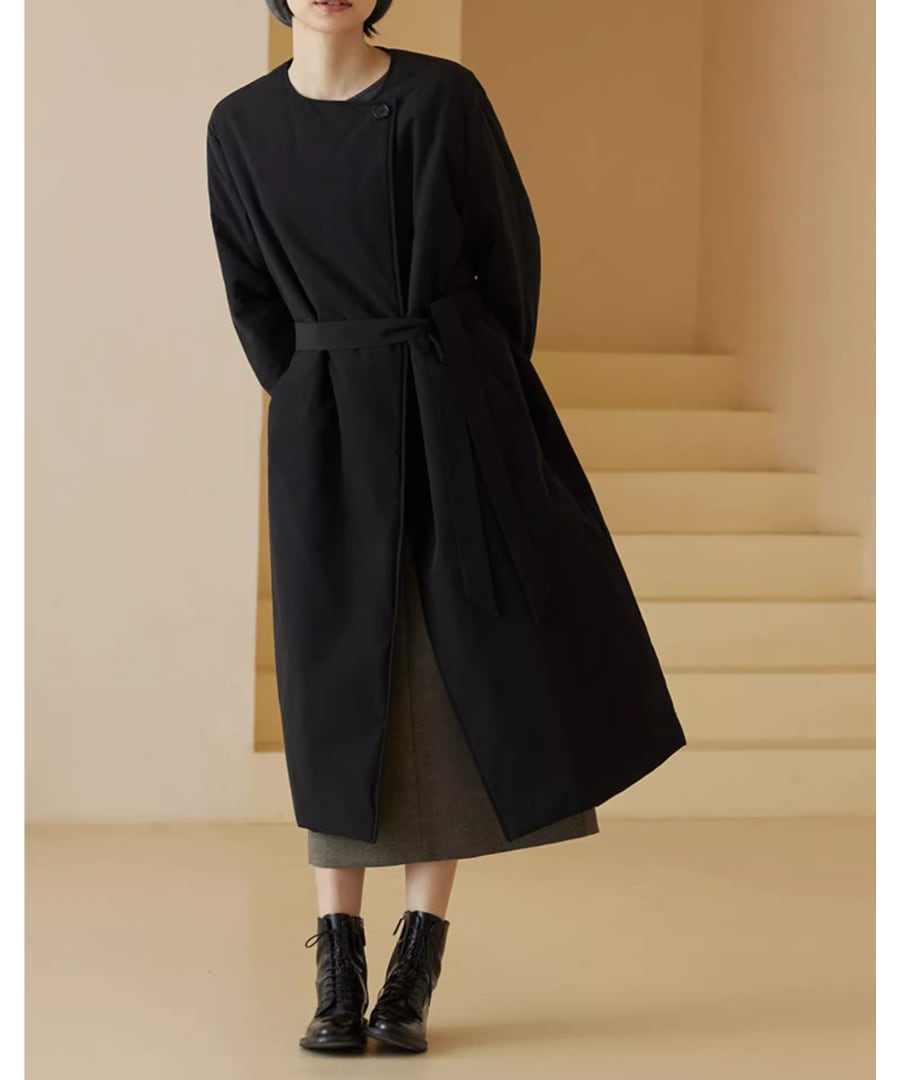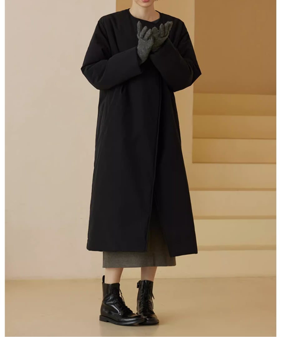 ノーカラーのデザインが洗練された印象を与え、どんなスタイルにも合わせやすい一着です。