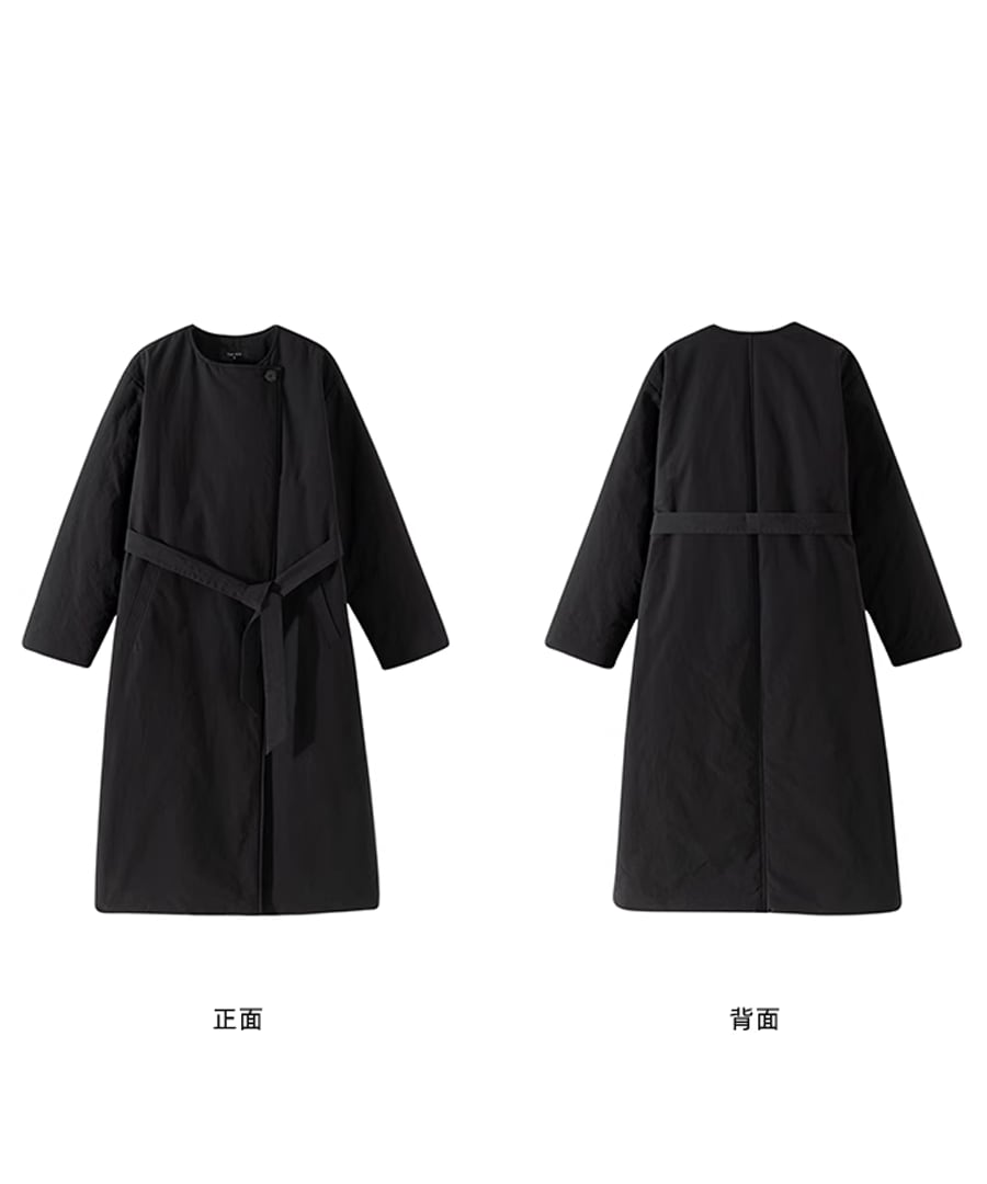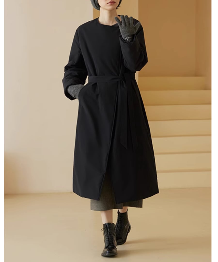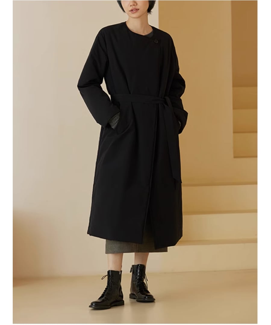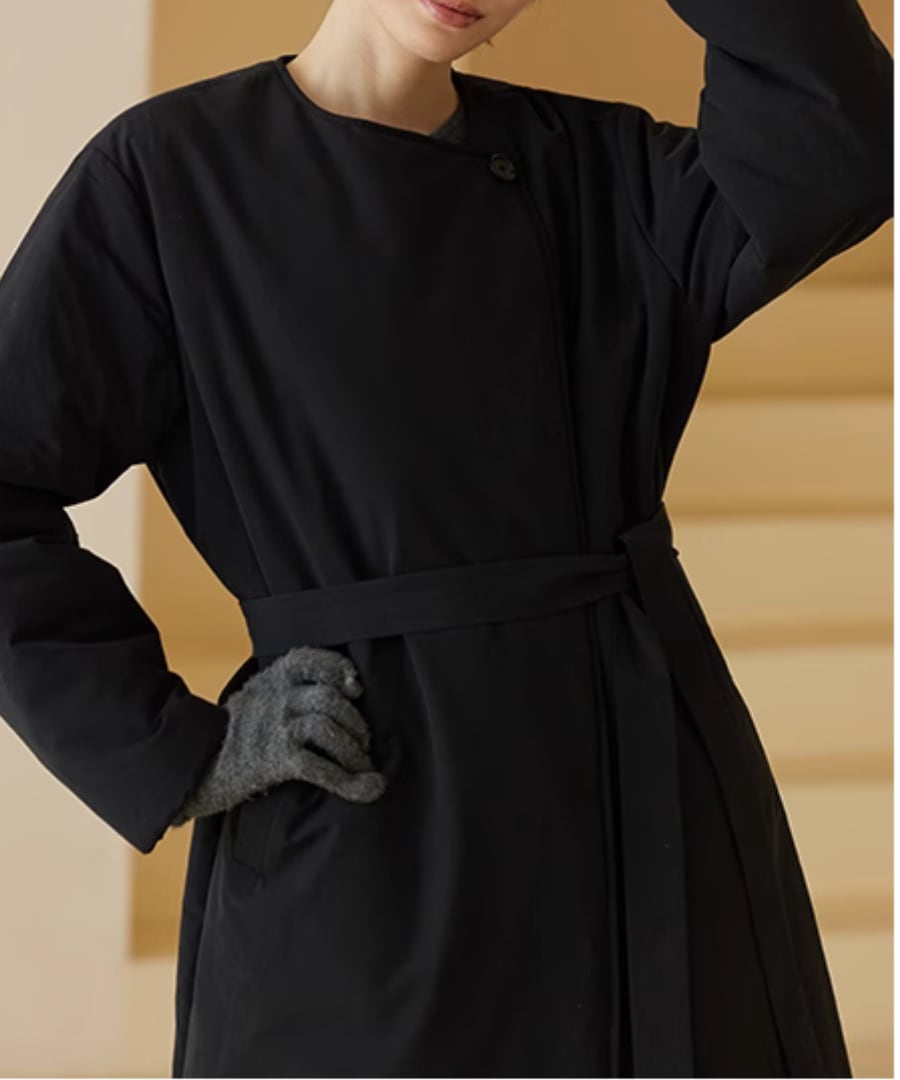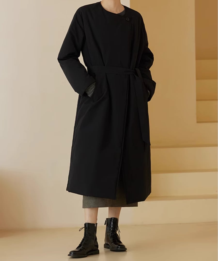 ノーカラーのデザインが洗練された印象を与え、どんなスタイルにも合わせやすい一着です。