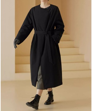 シンプルながらも美しいラインを持つ、キルティングのロングコート。