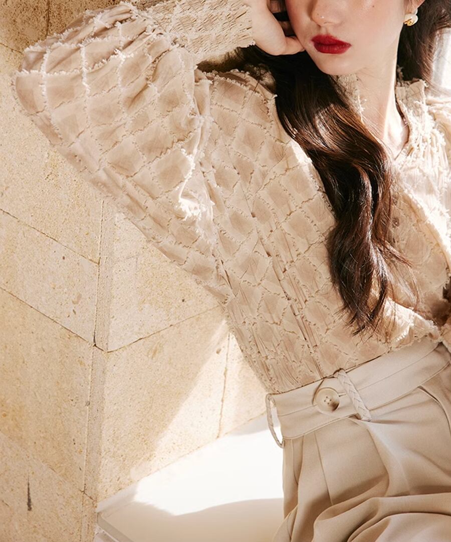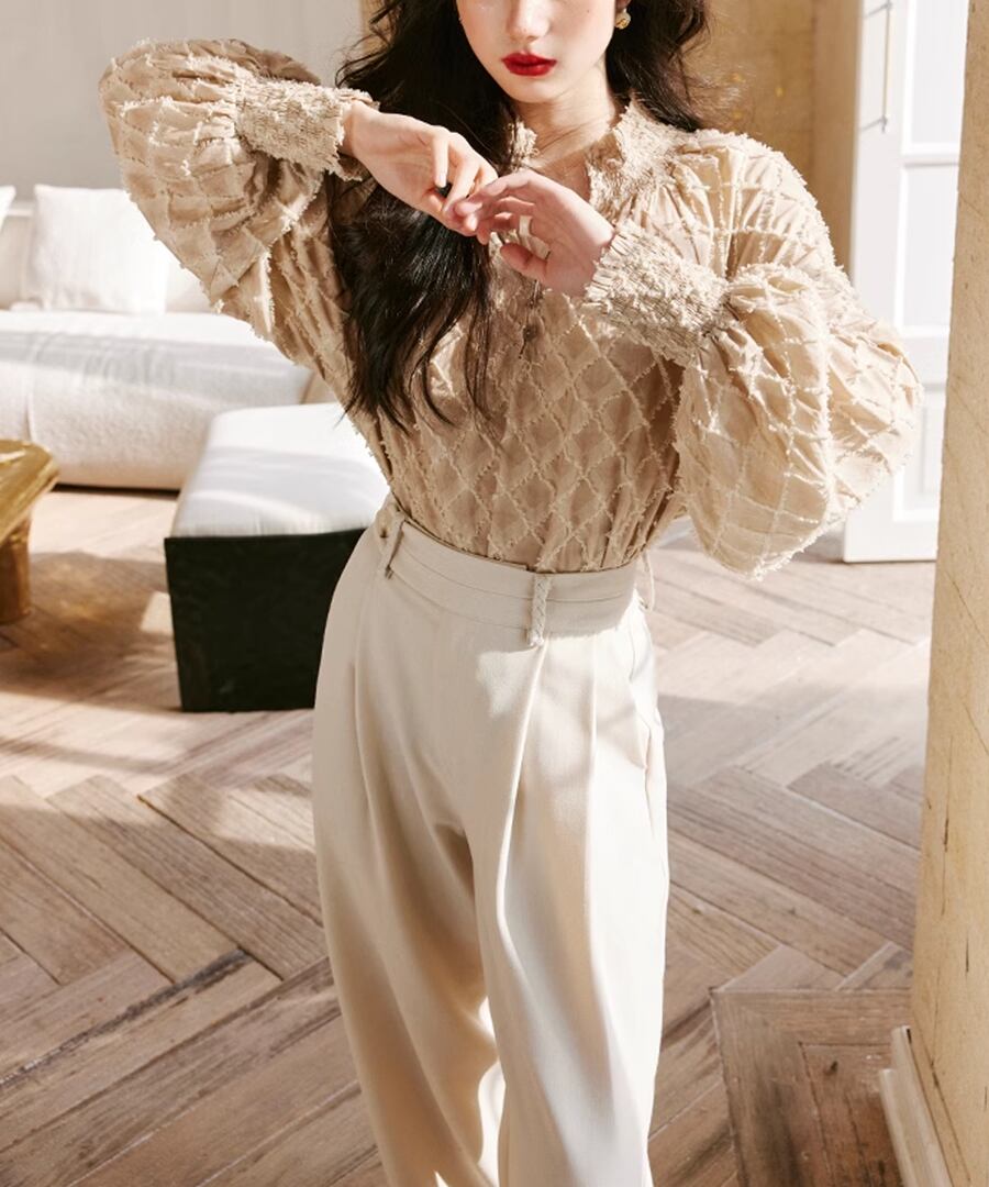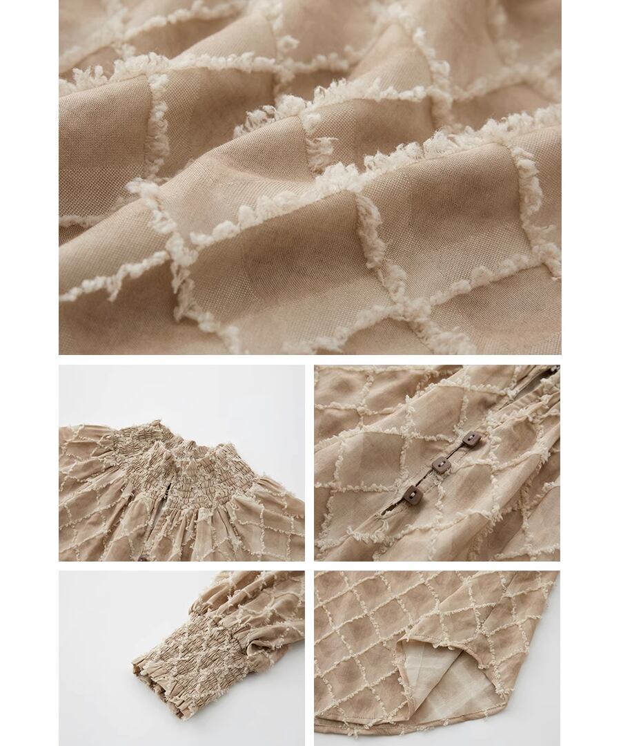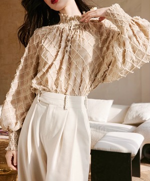 ランタンスリーブが特徴的な、チェックデザインブラウス。