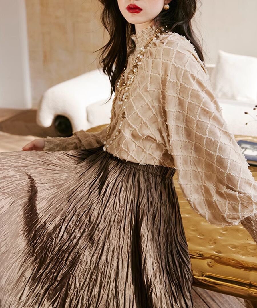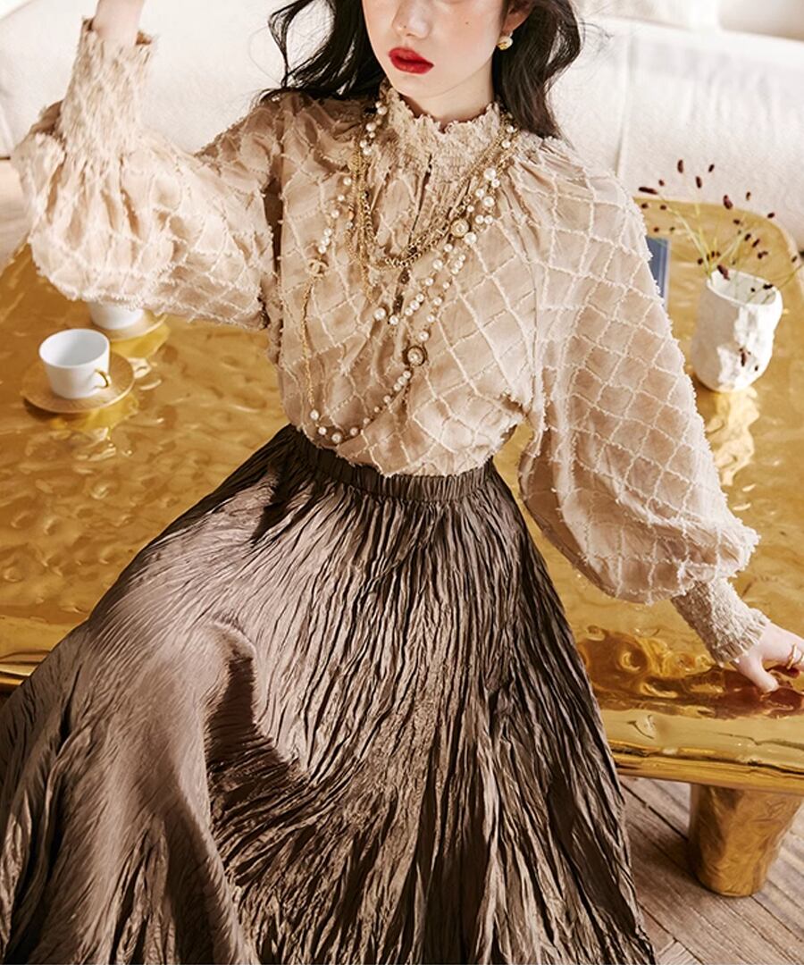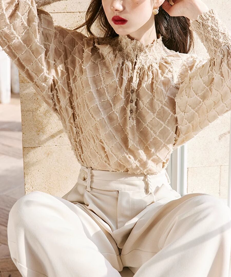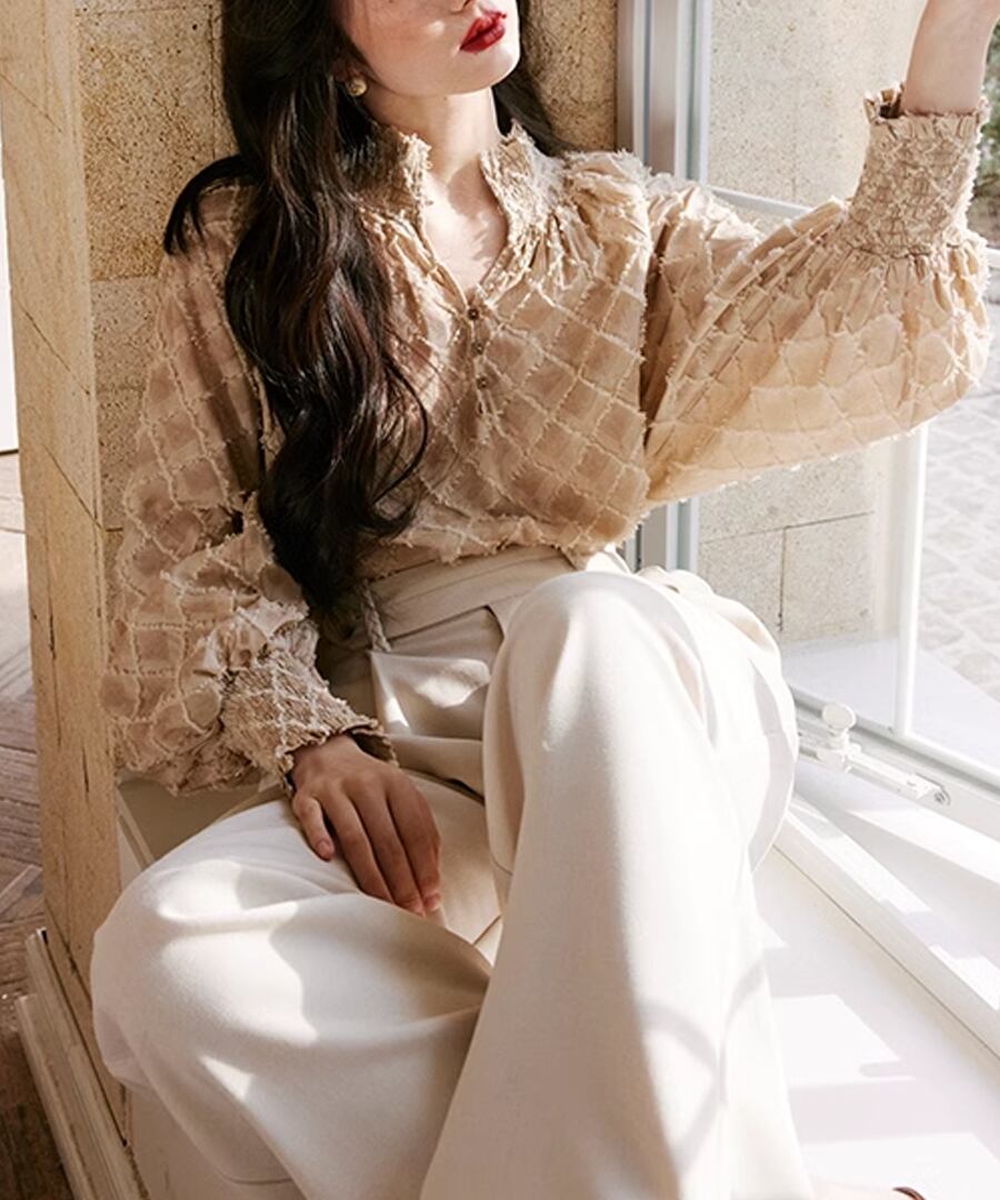 ランタンスリーブが特徴的な、チェックデザインブラウス。