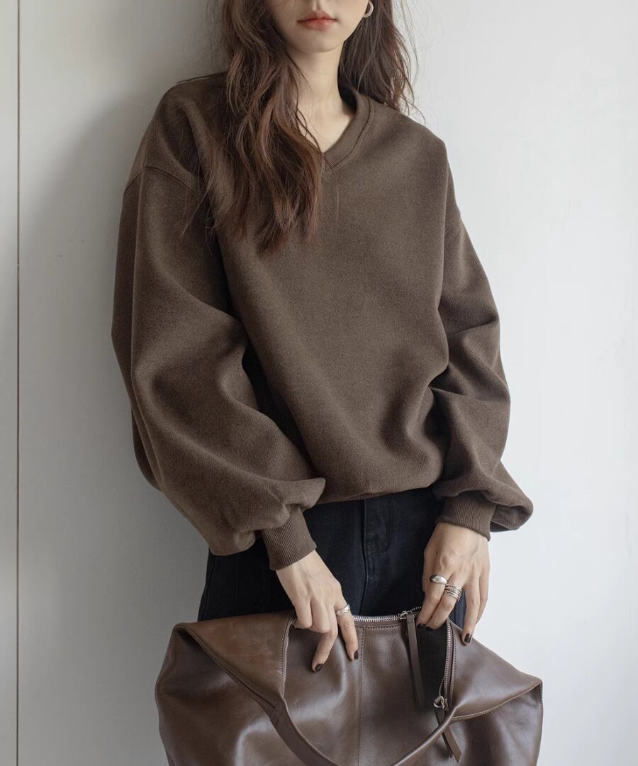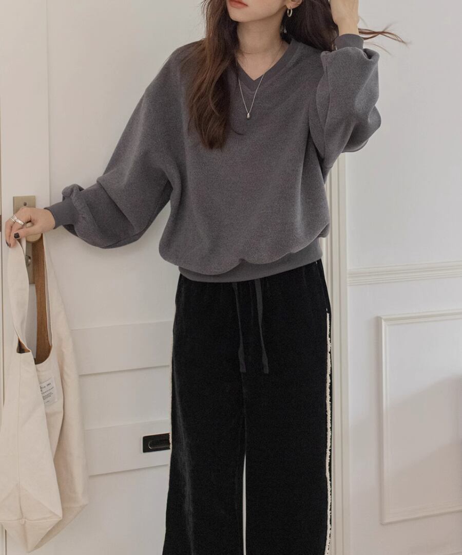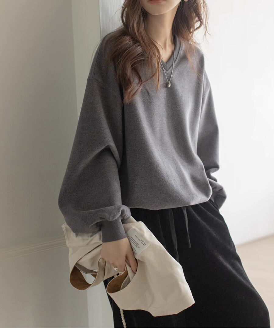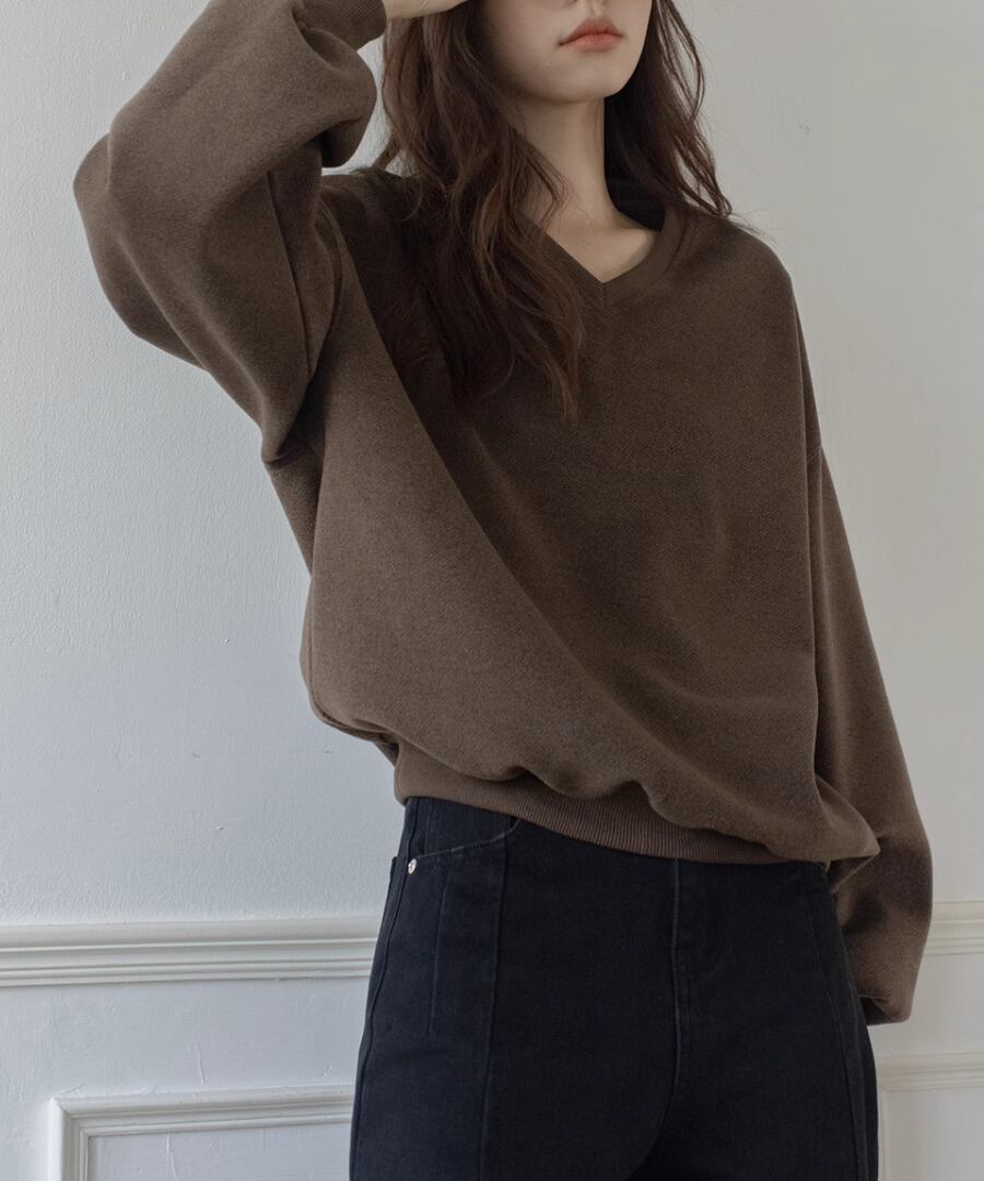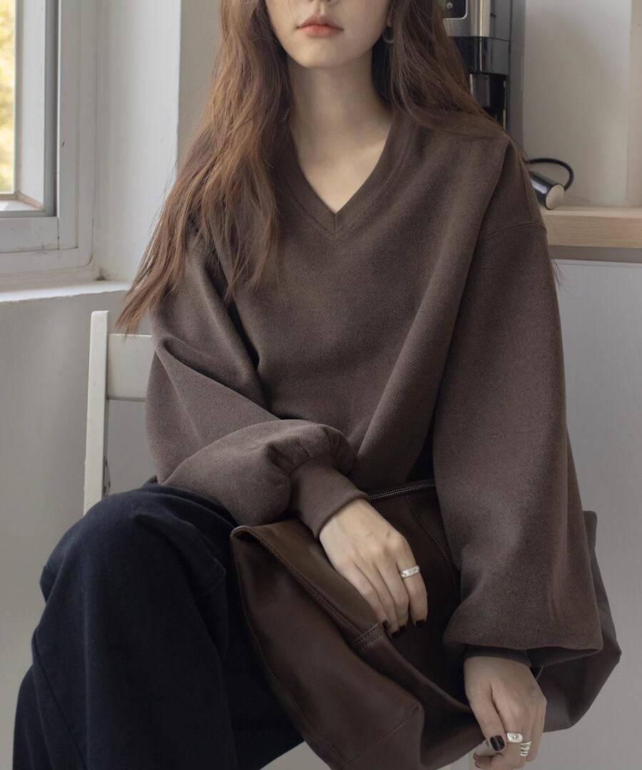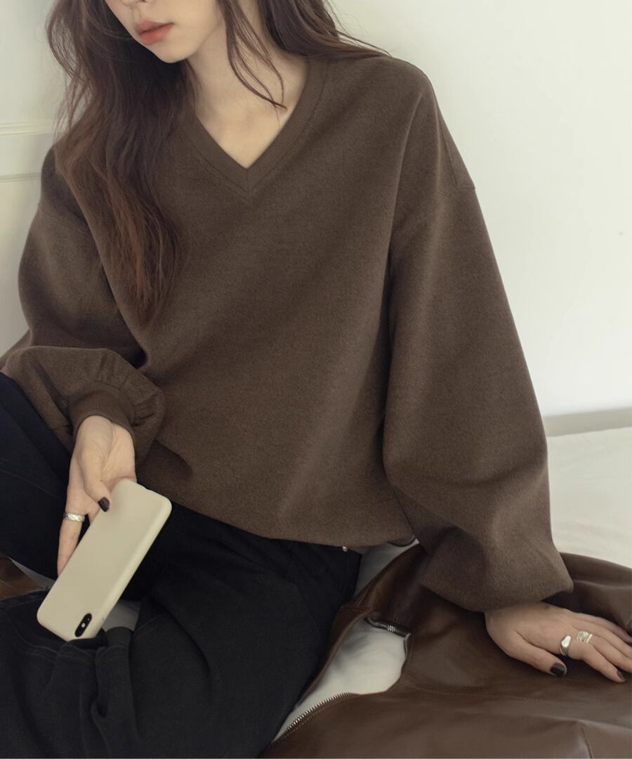 Vネックデザインが顔周りをすっきりと見せるため、カジュアルなスタイルにも少しのエレガンスを加えます。