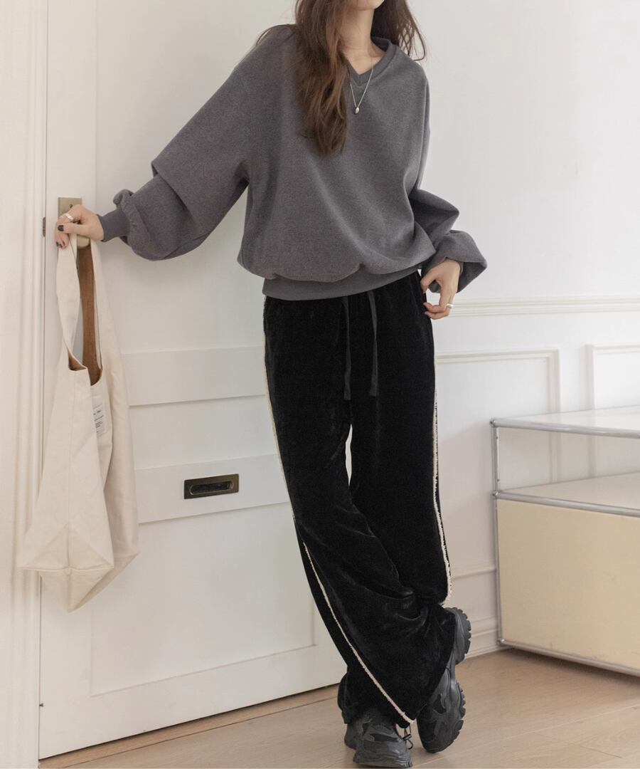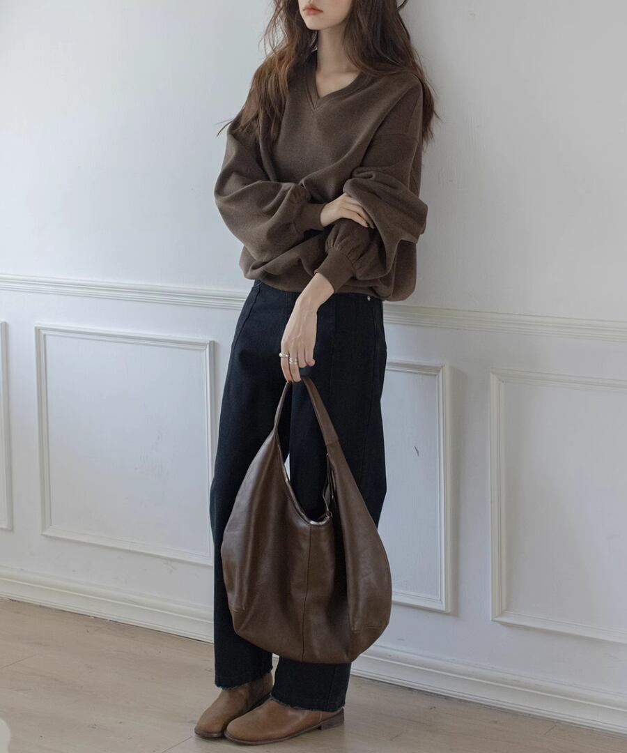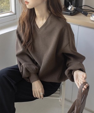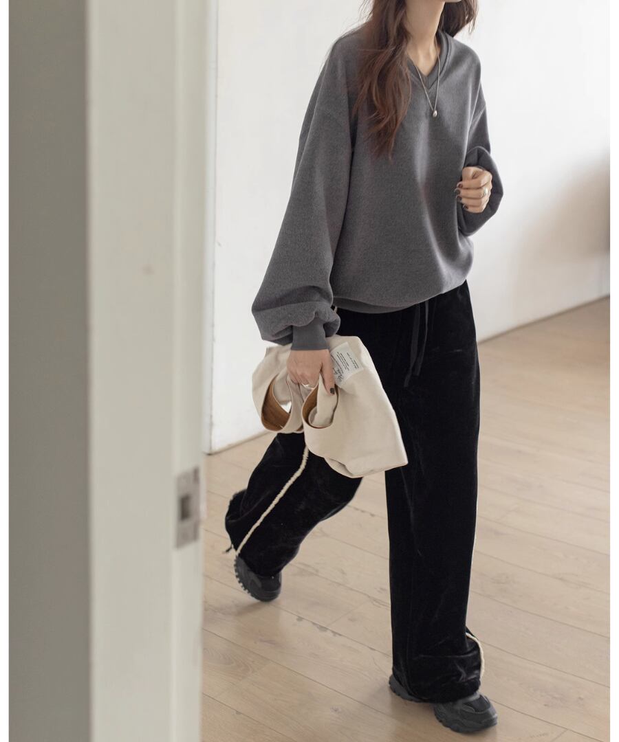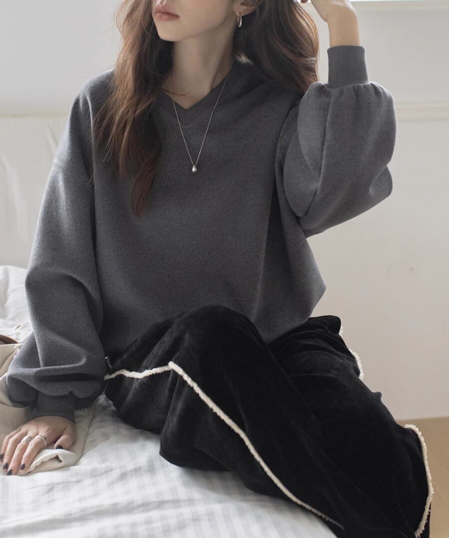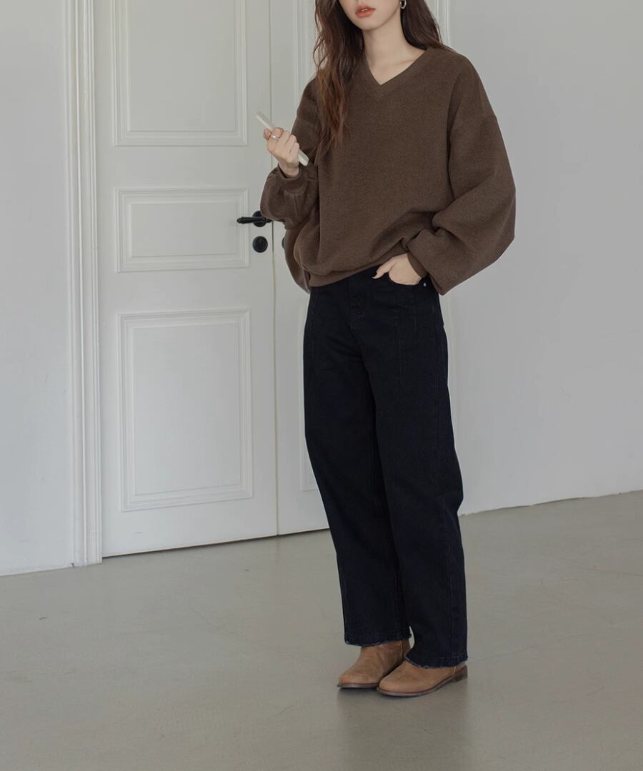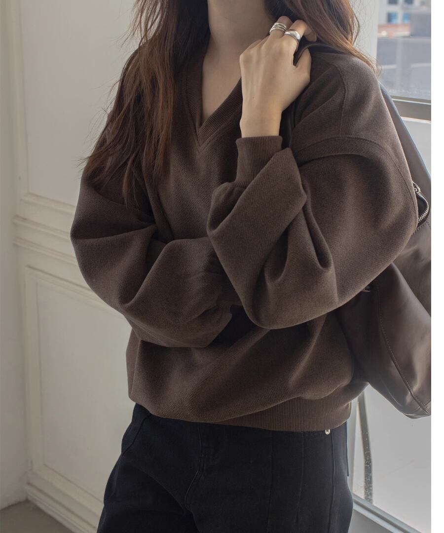 Vネックデザインが顔周りをすっきりと見せるため、カジュアルなスタイルにも少しのエレガンスを加えます。
