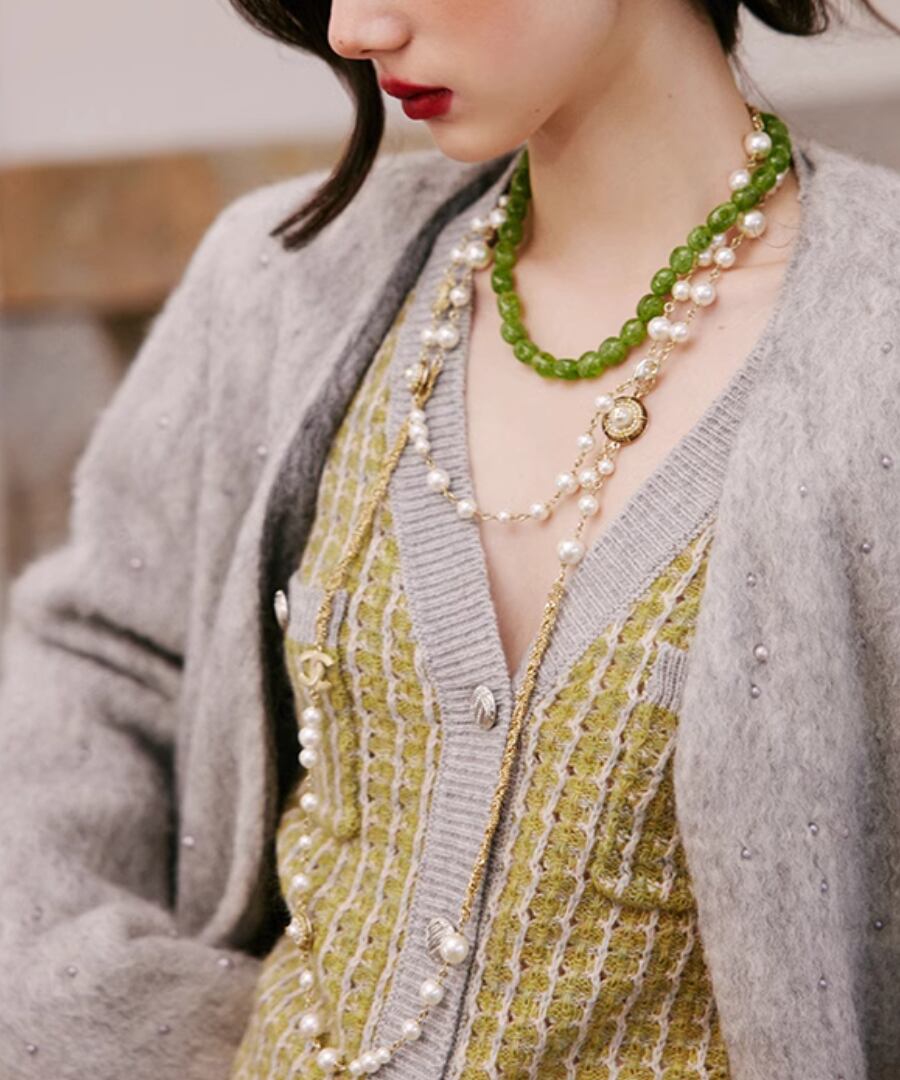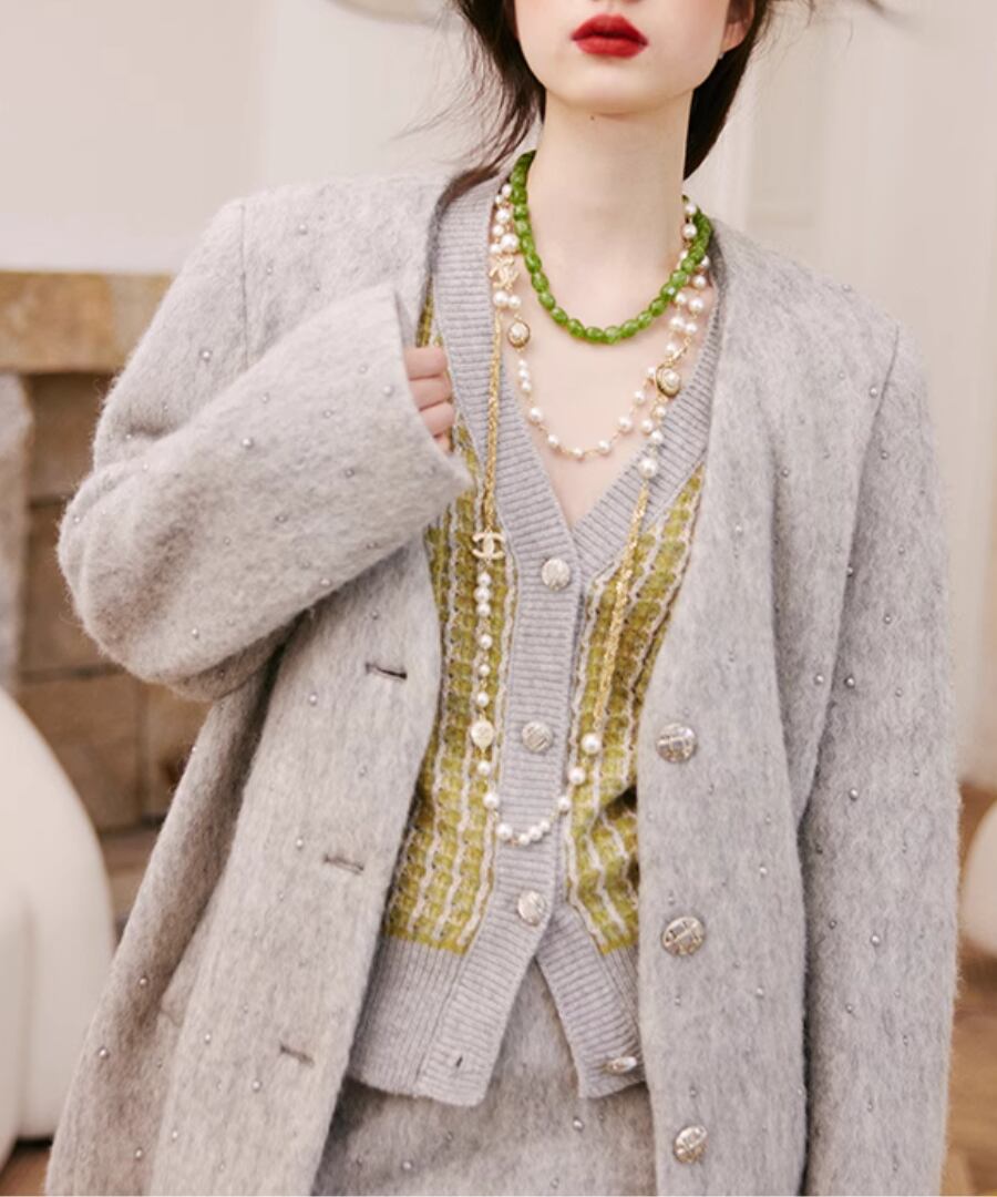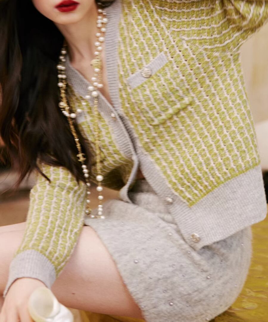 グレーとグリーンの絶妙な配色が、季節感を醸し出す一着です。