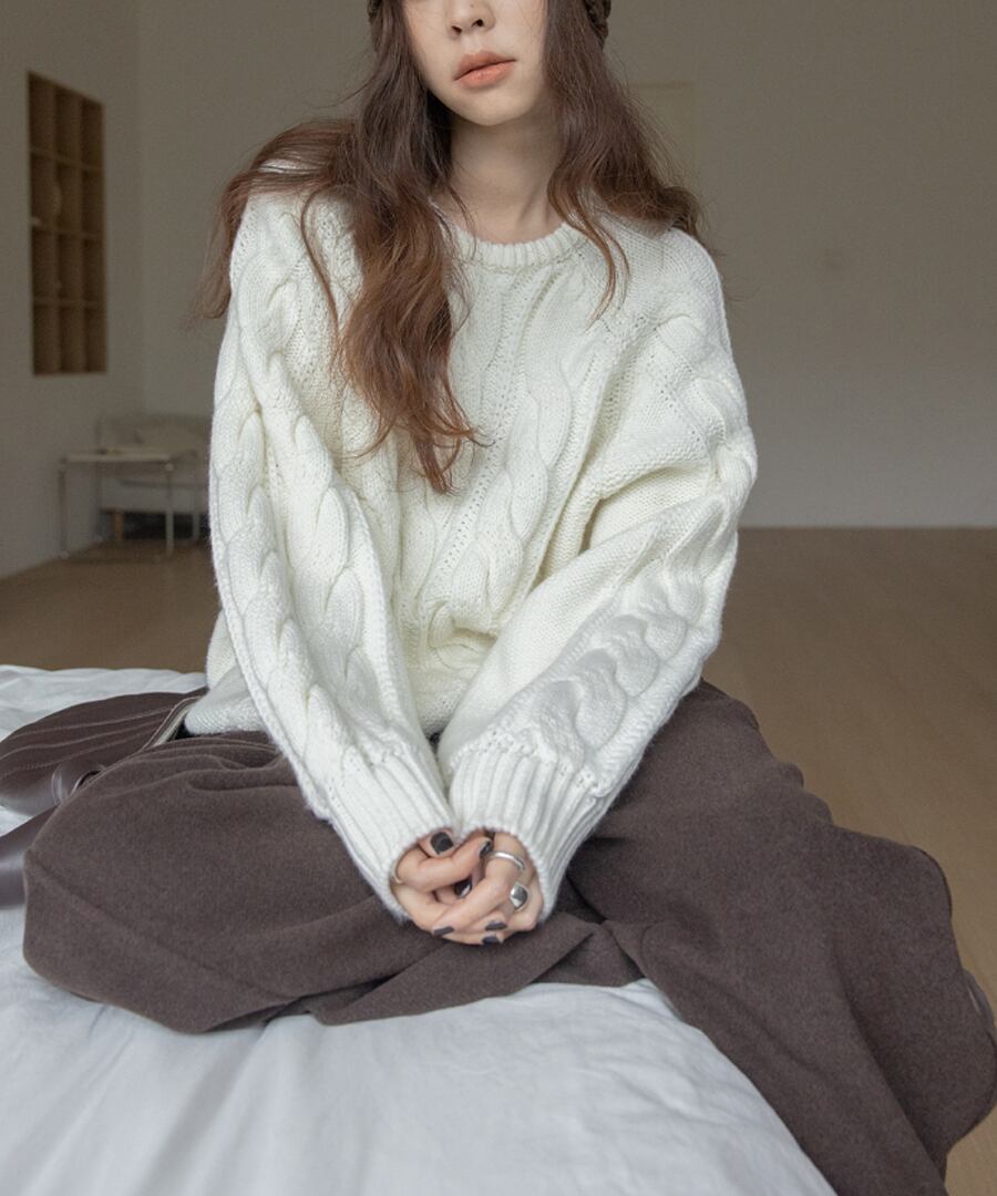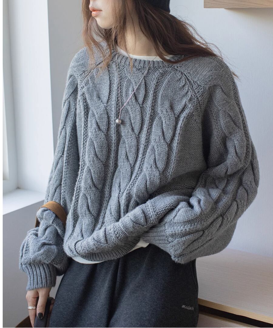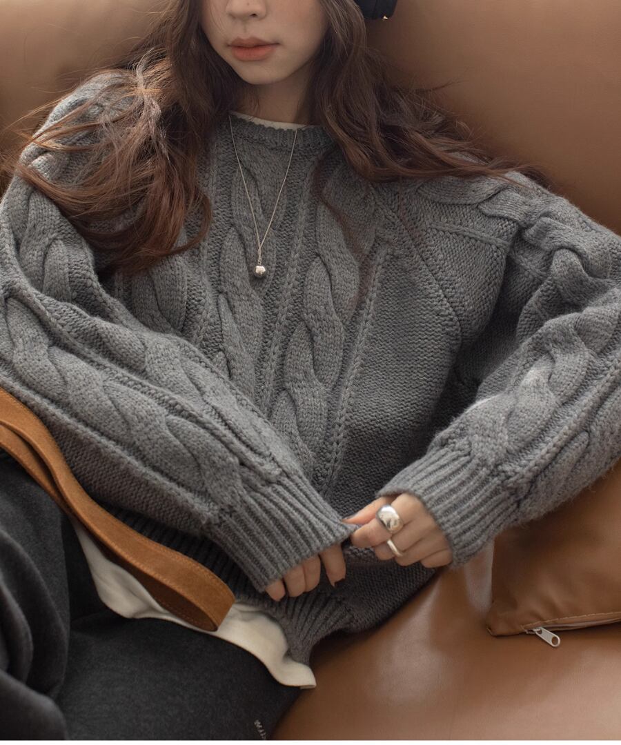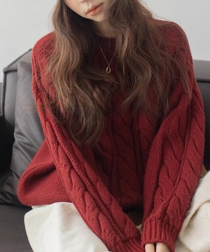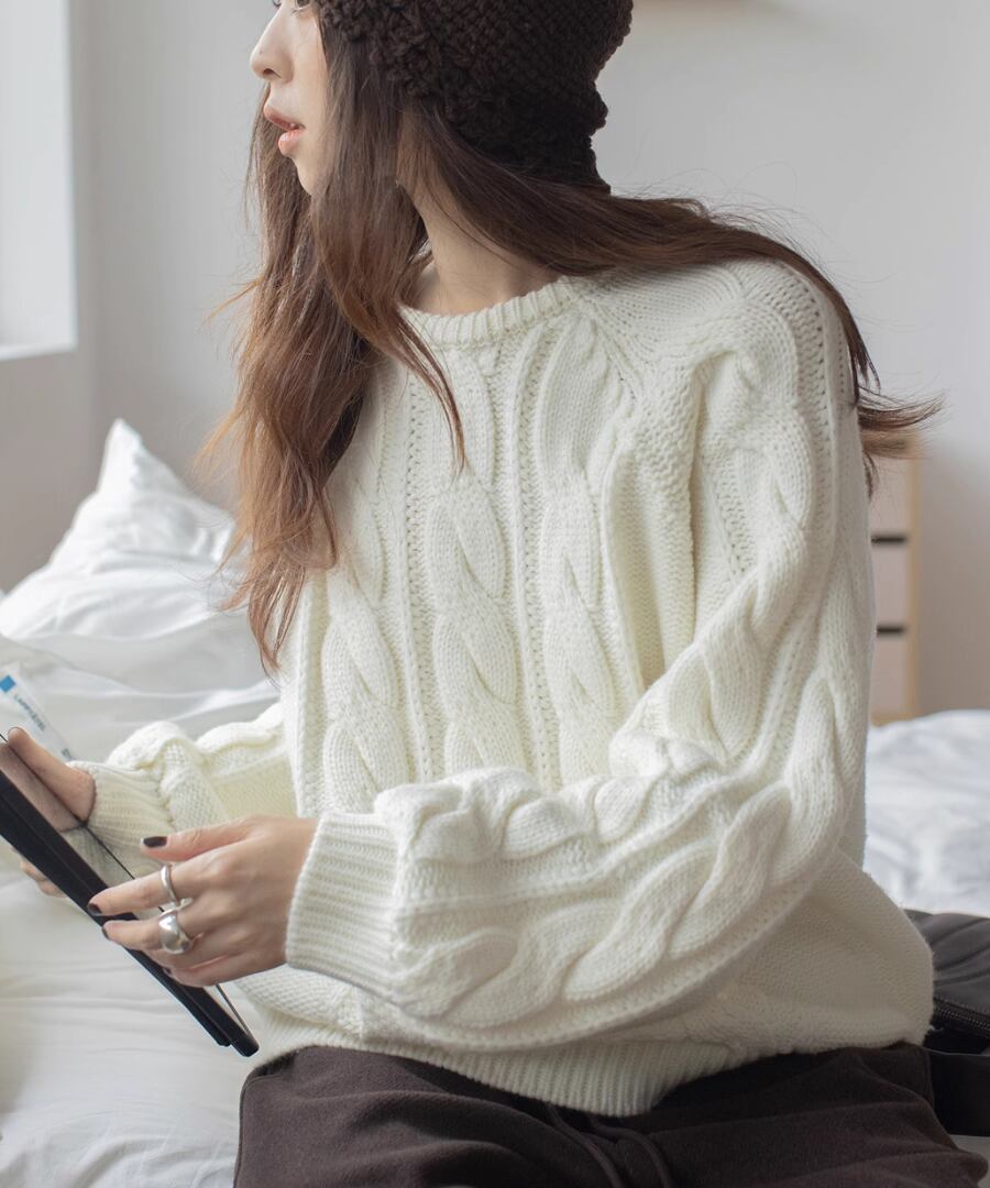 上品なケーブル編みが特徴のクルーネックニット。