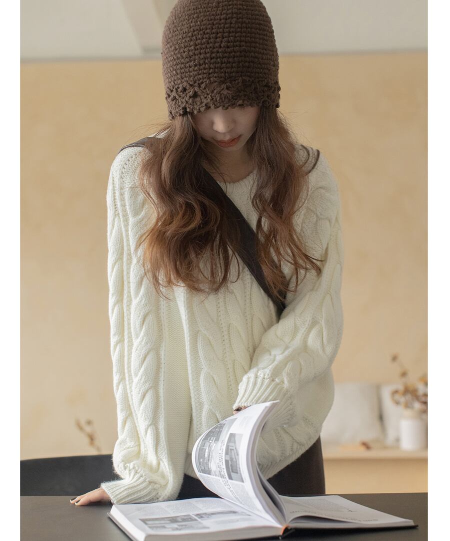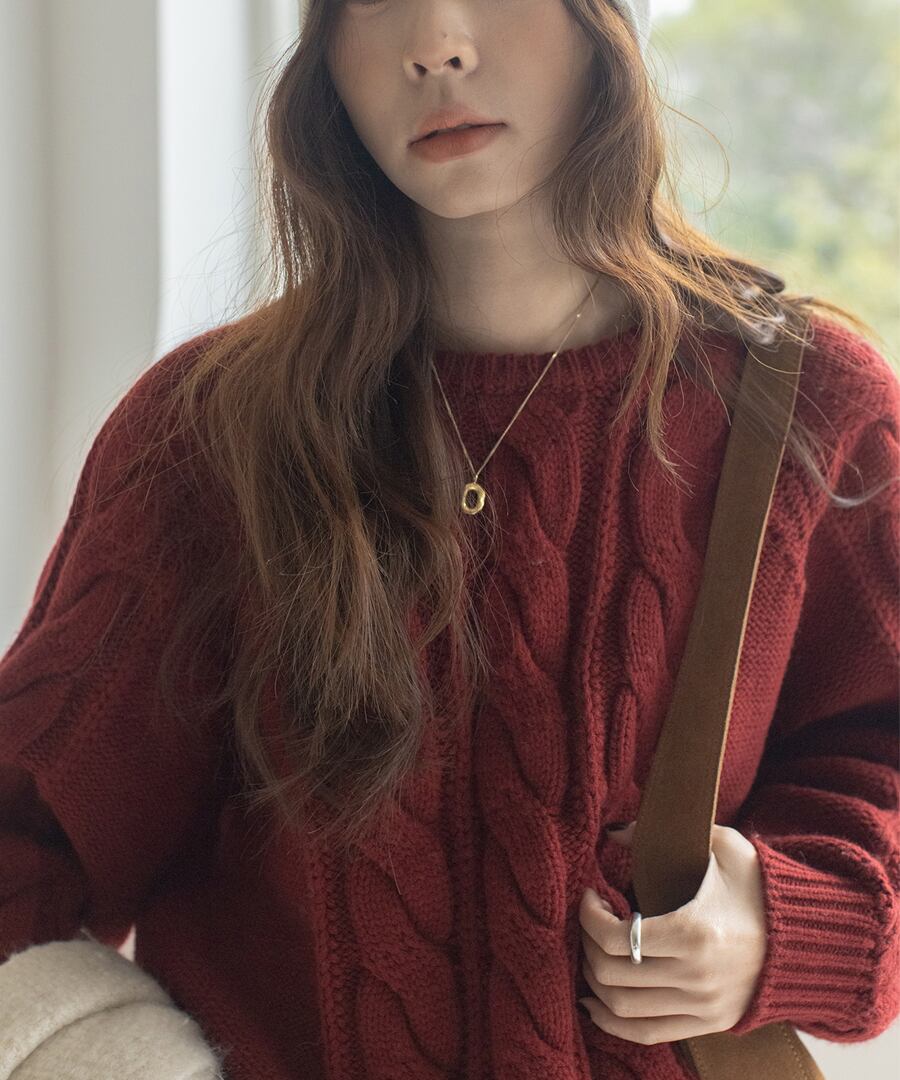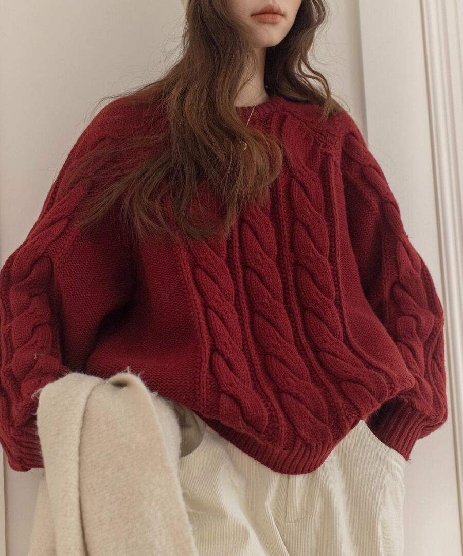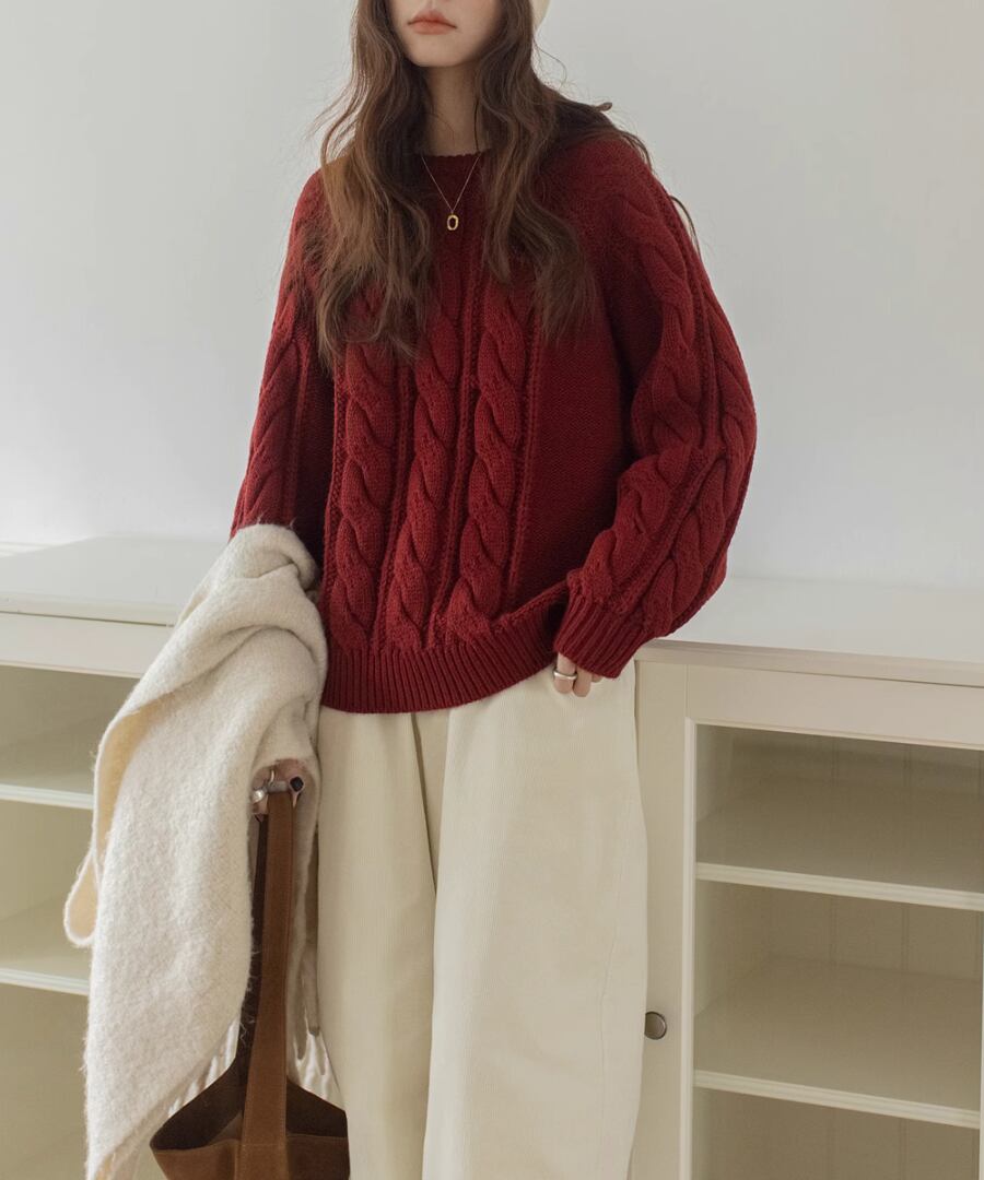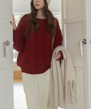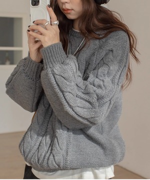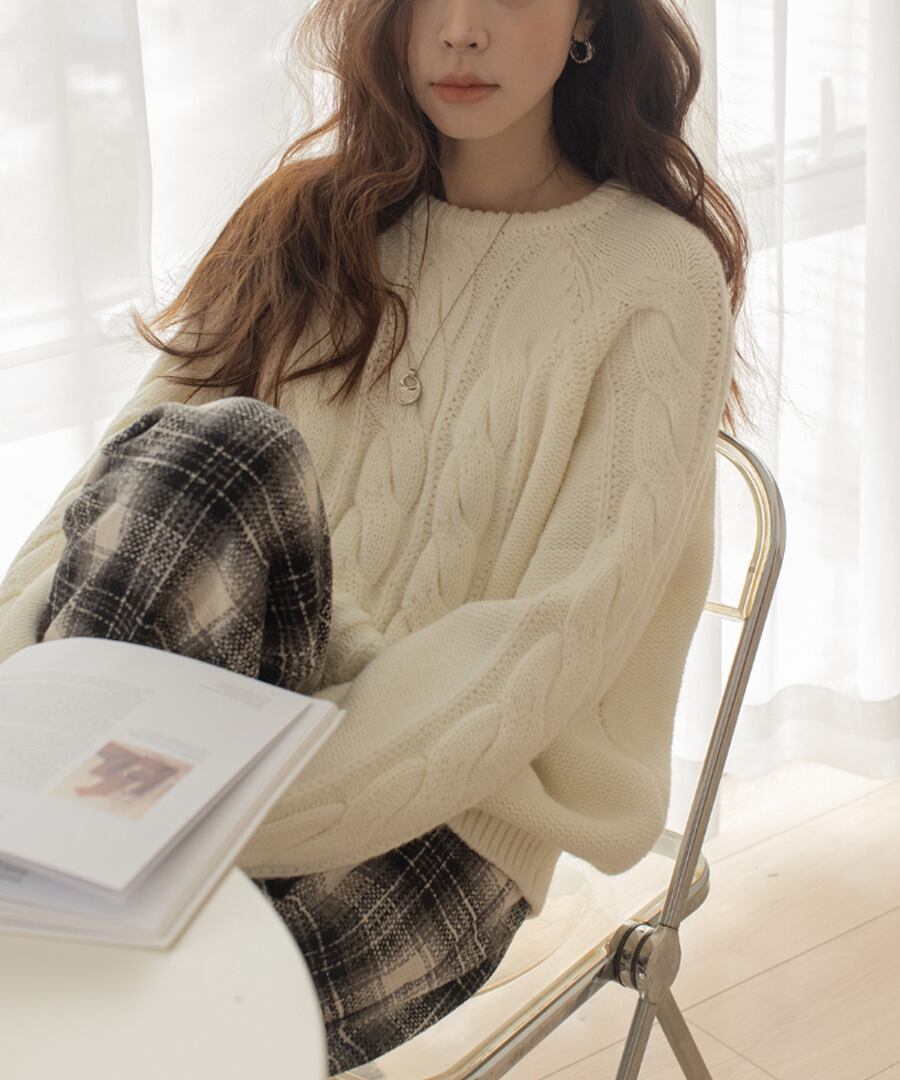上品なケーブル編みが特徴のクルーネックニット。
