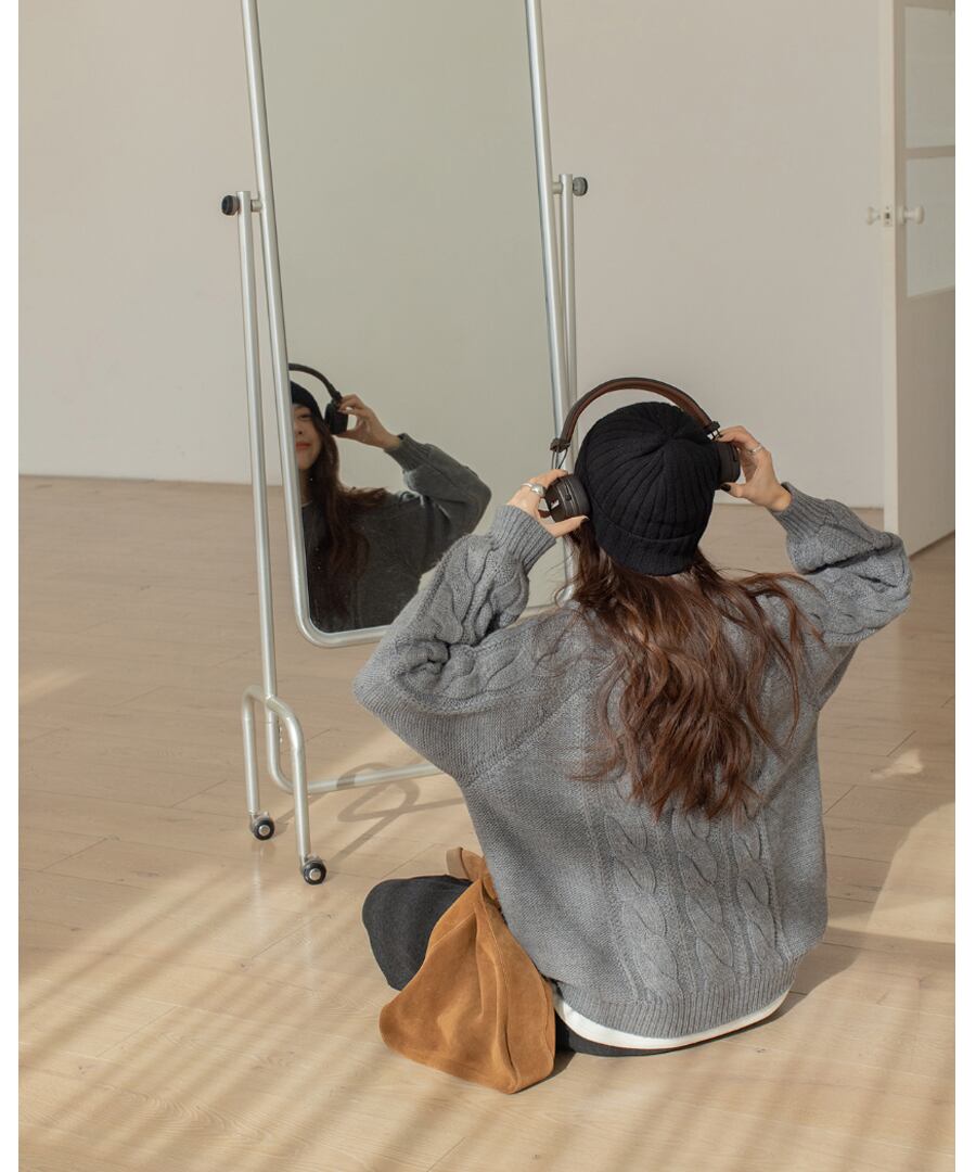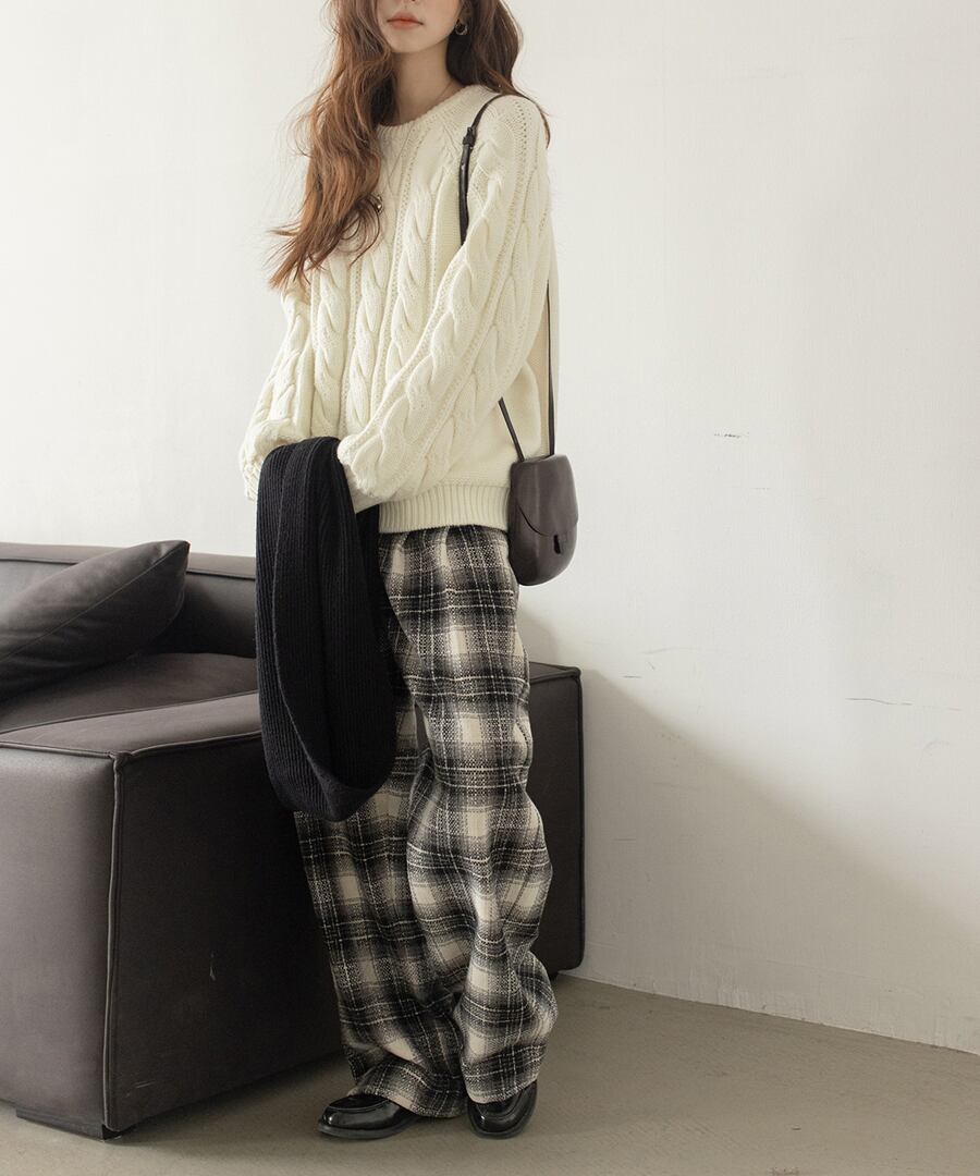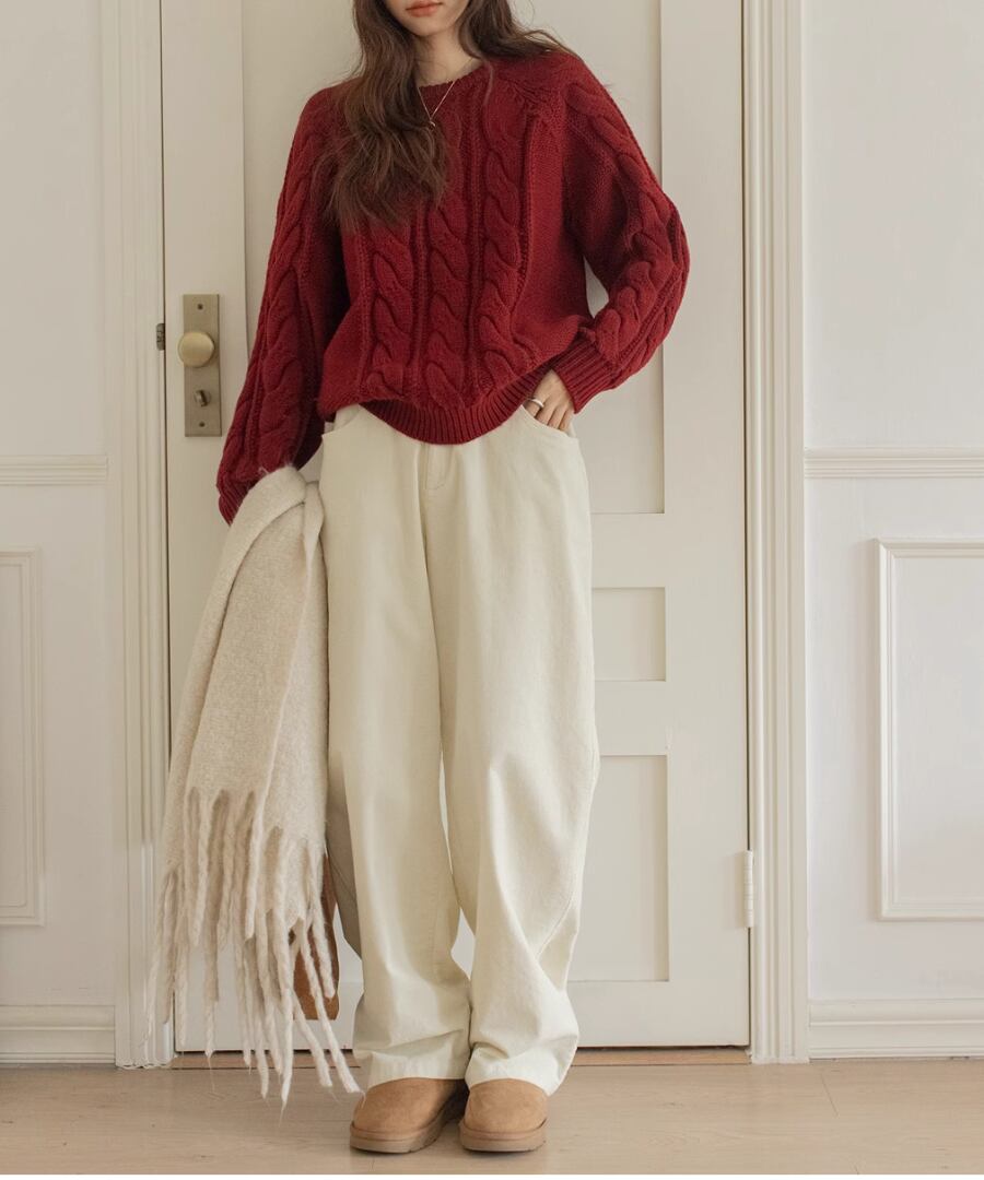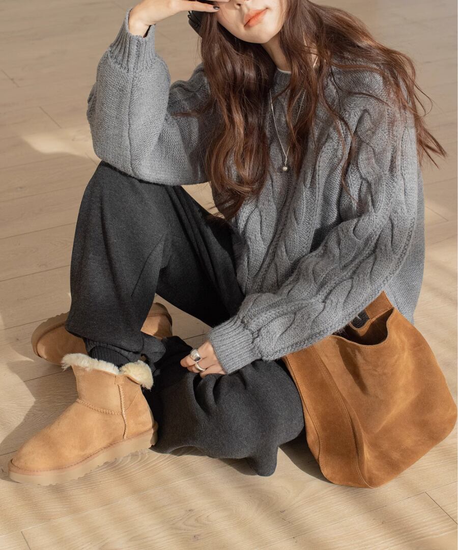 上品なケーブル編みが特徴のクルーネックニット。