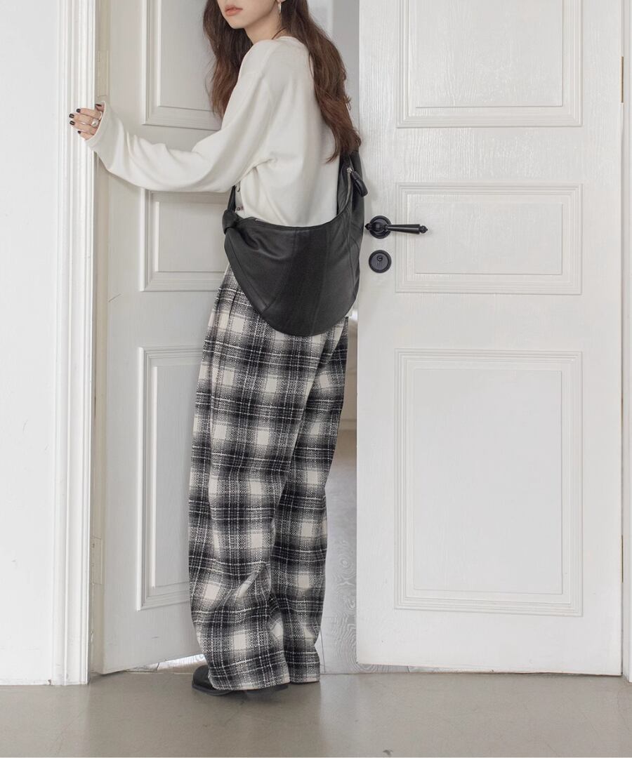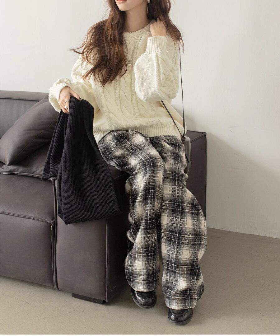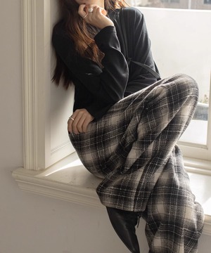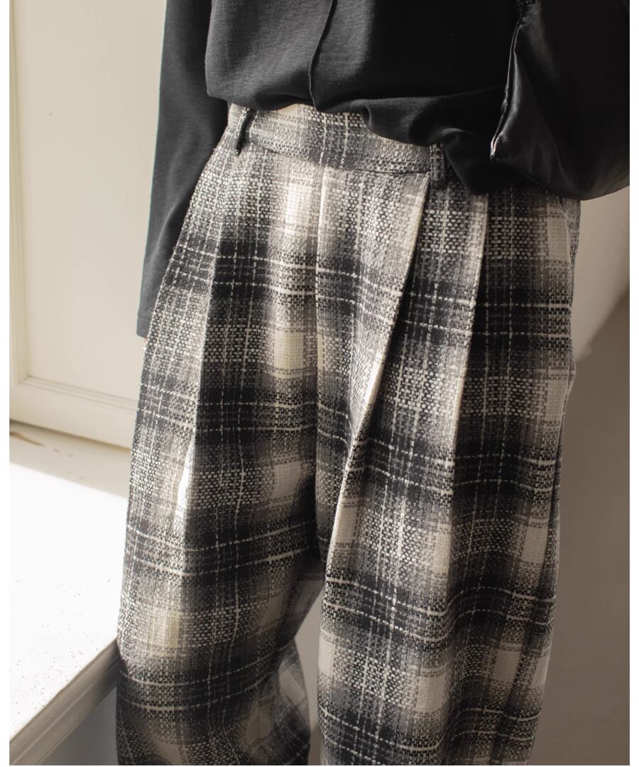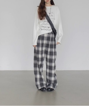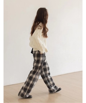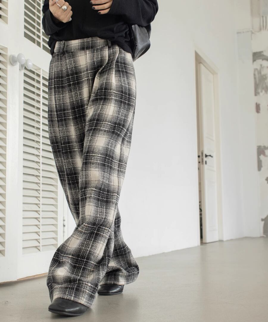 チェック柄が印象的なワイドレッグパンツ。