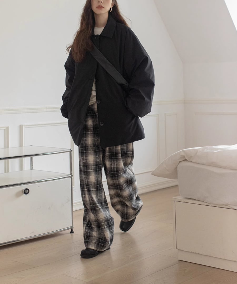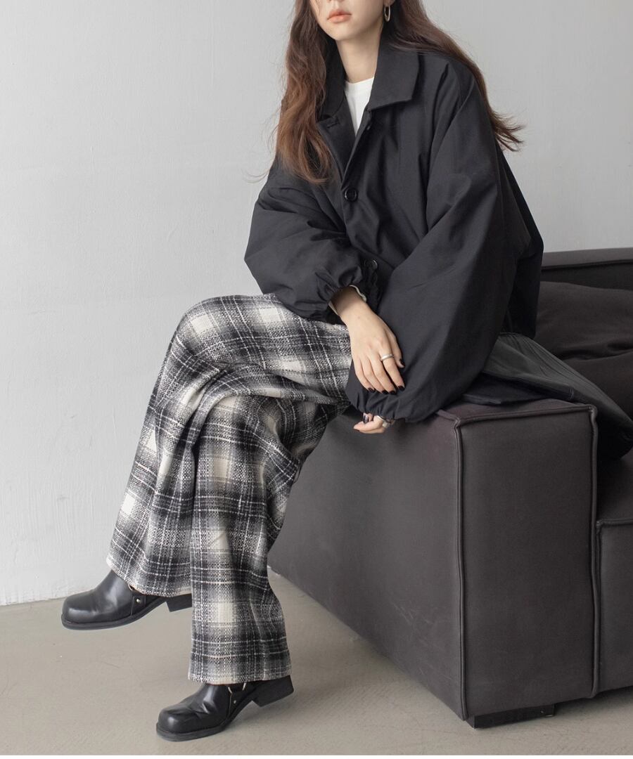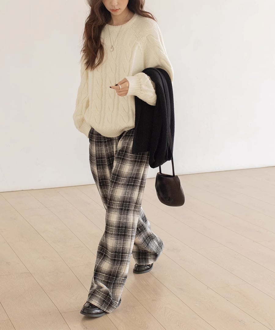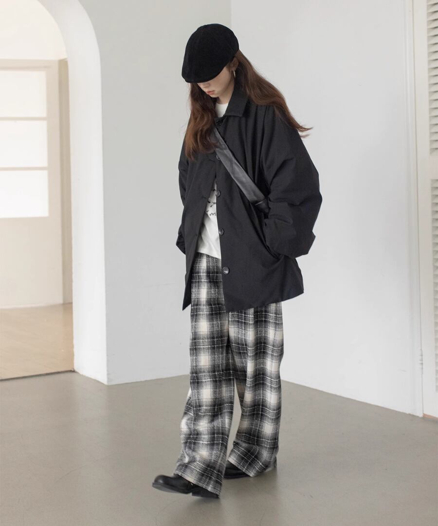 チェック柄が印象的なワイドレッグパンツ。