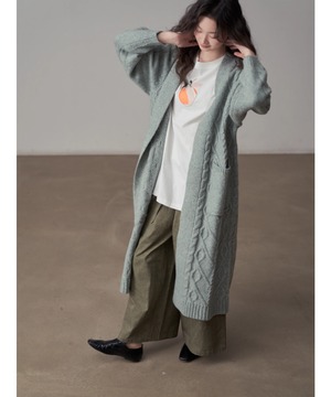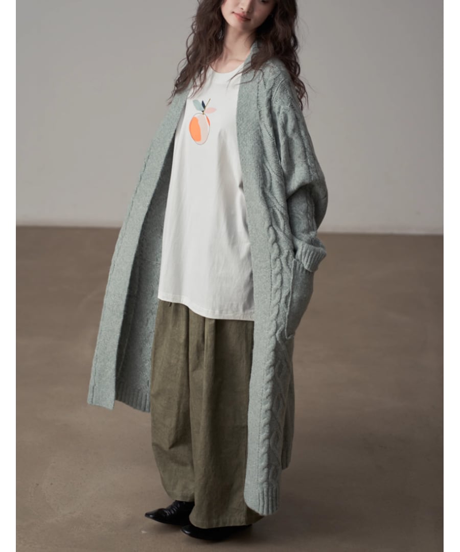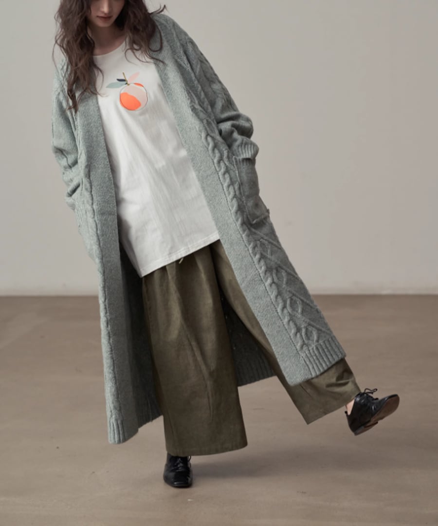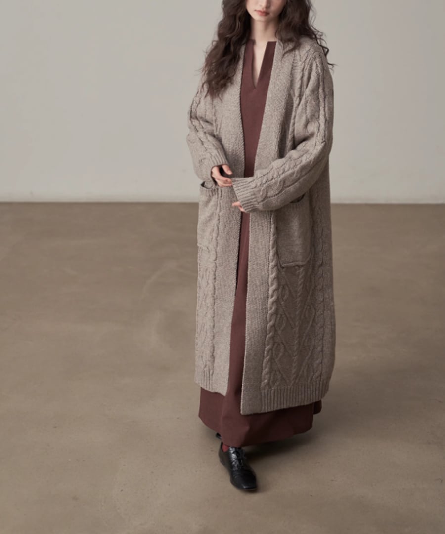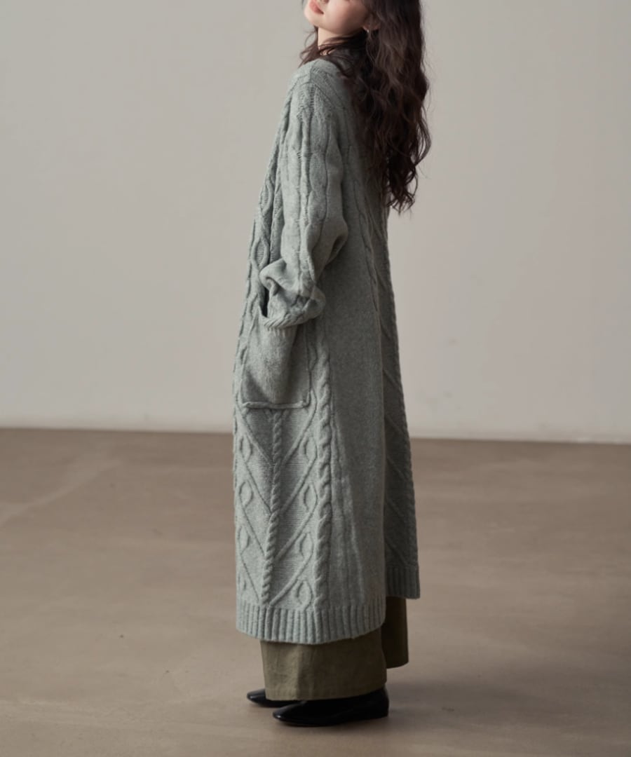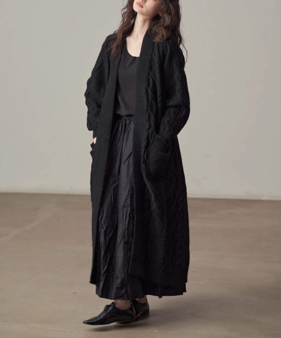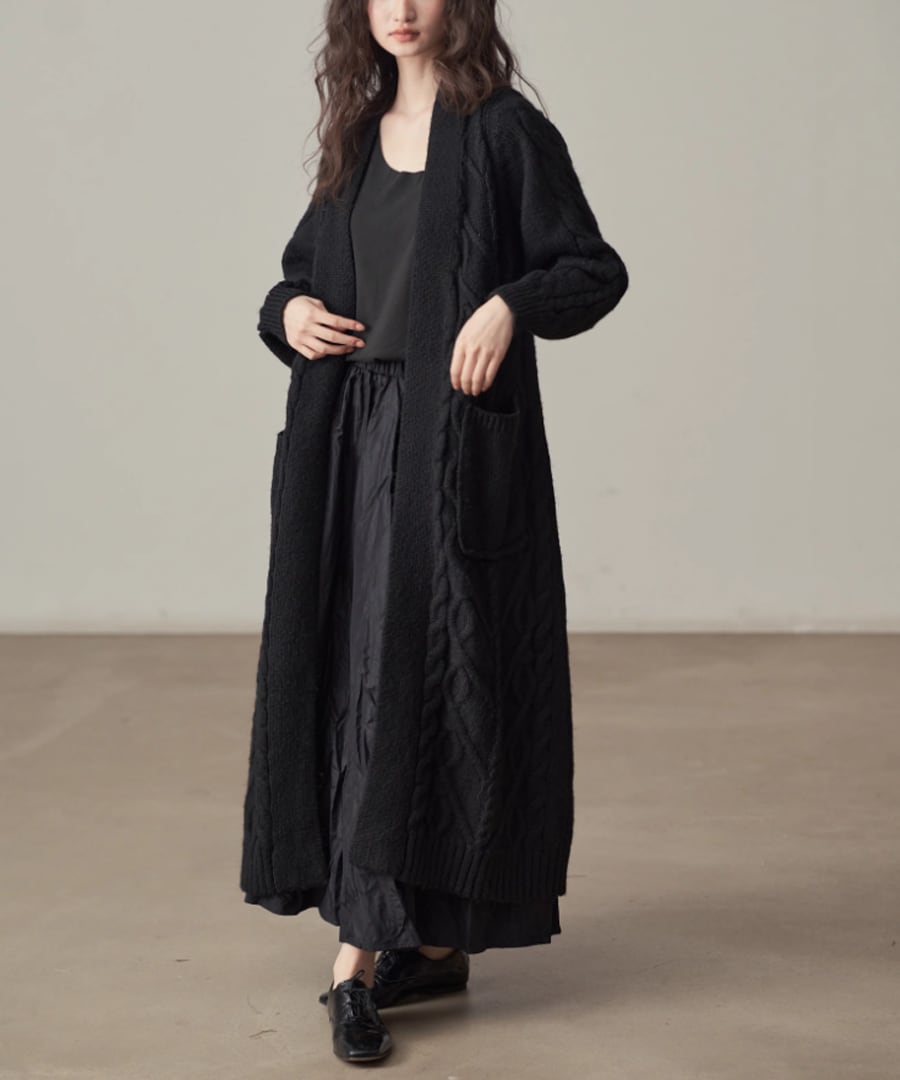 全体に施されたケーブル編みが、シンプルなコーディネートにアクセントを加えます。