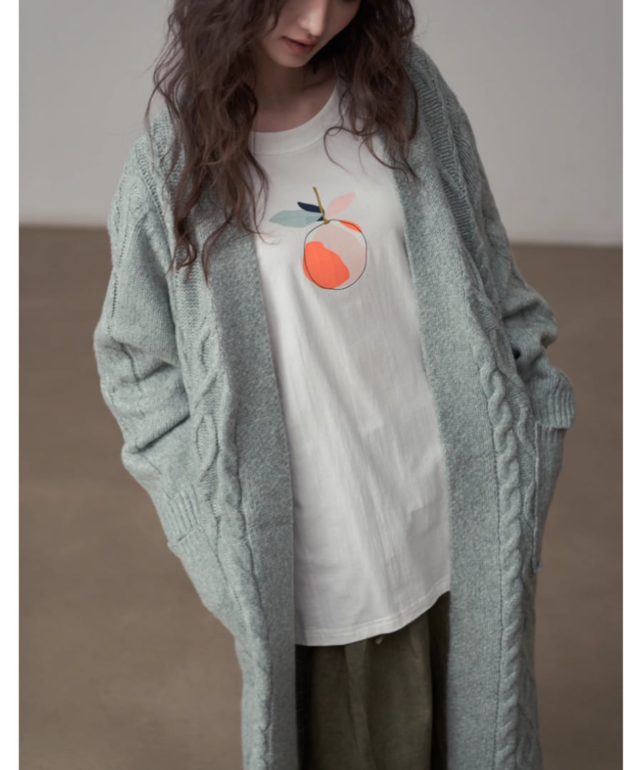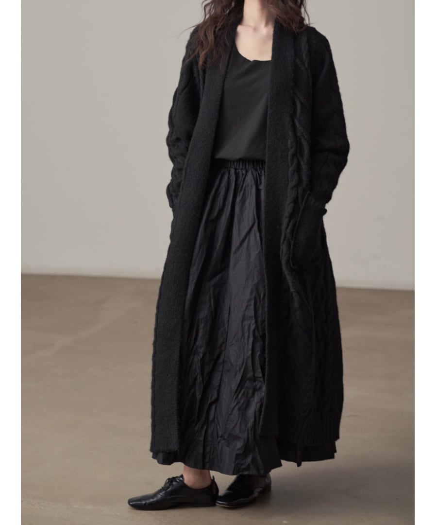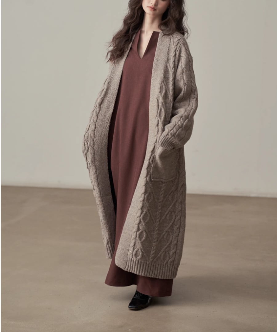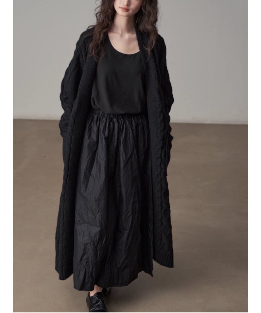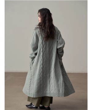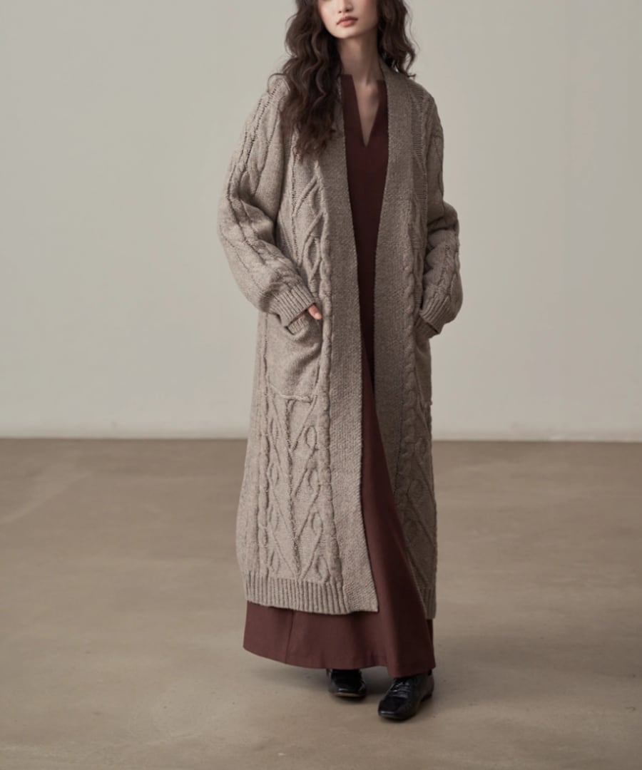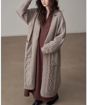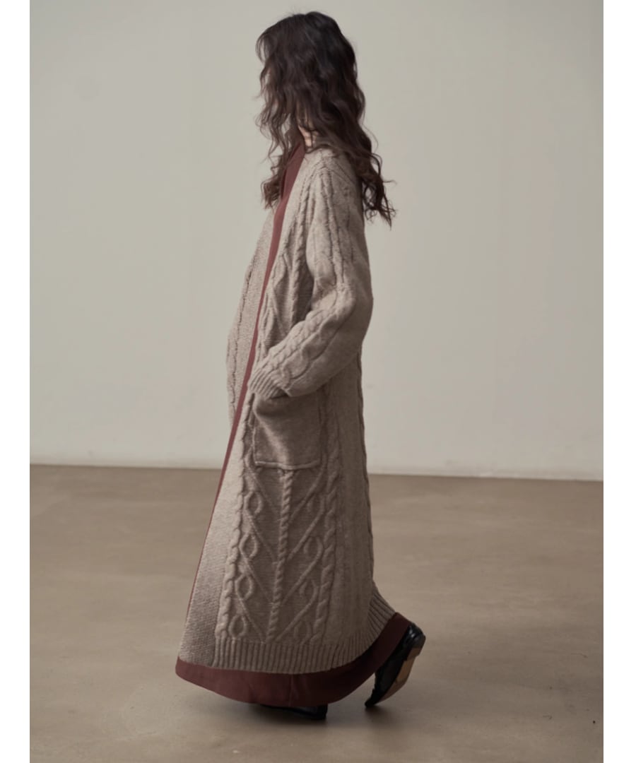 全体に施されたケーブル編みが、シンプルなコーディネートにアクセントを加えます。