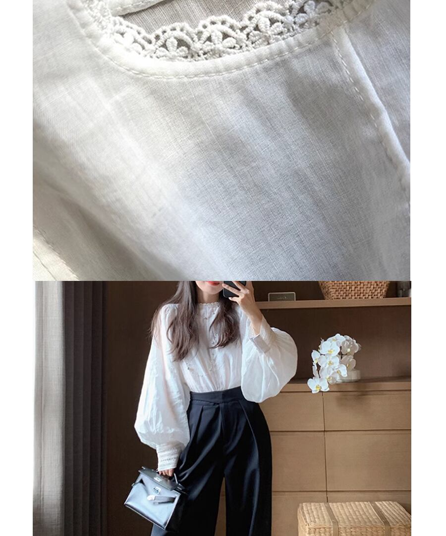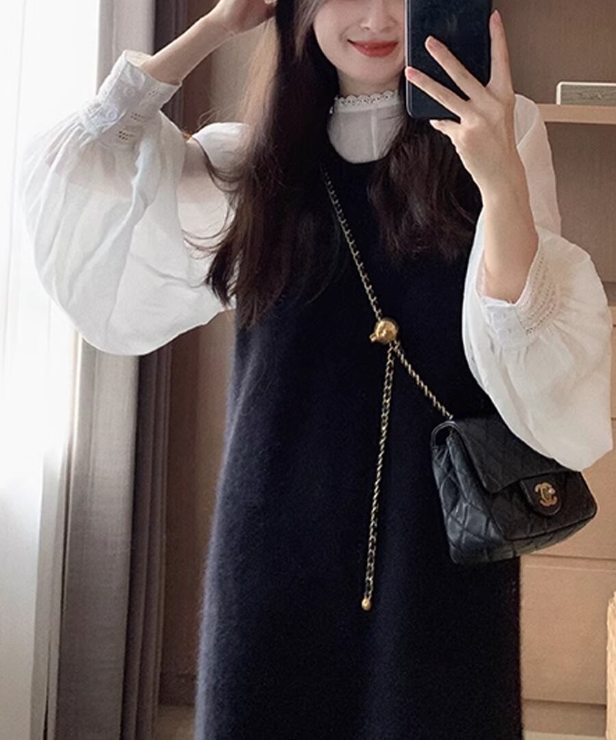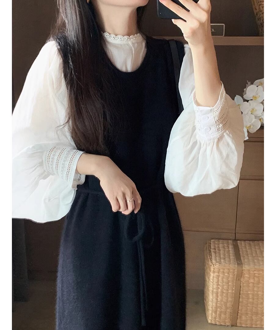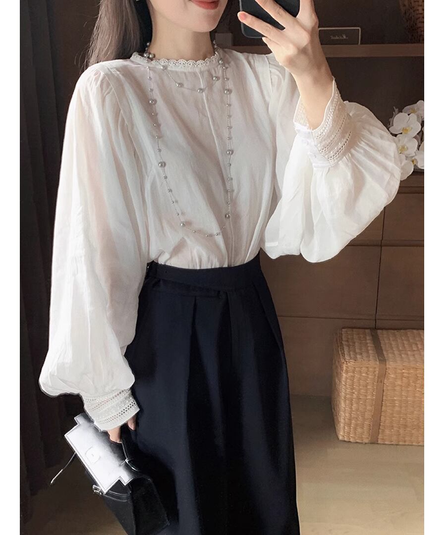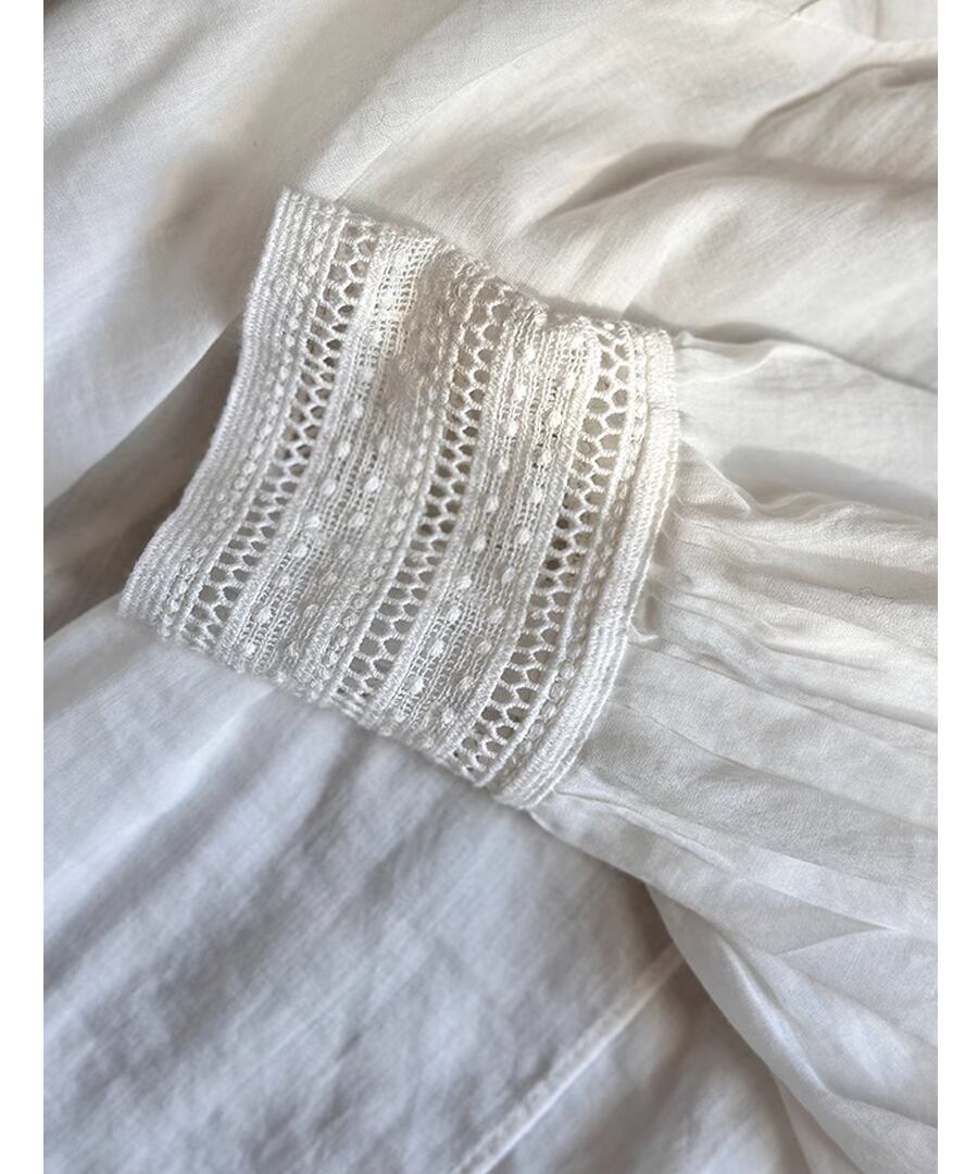 特徴的なランタンスリーブと繊細なレース使いが、女性らしさを引き立てる魅力的な一着です。