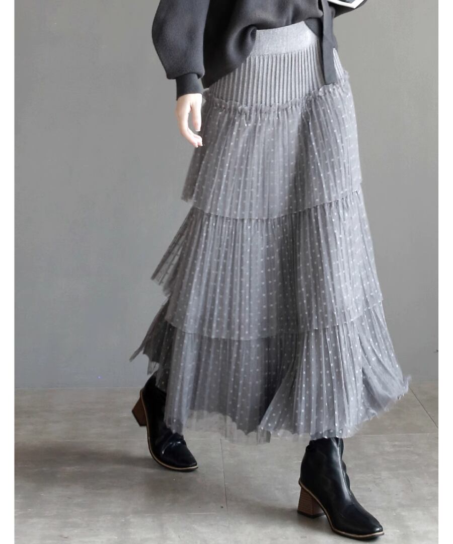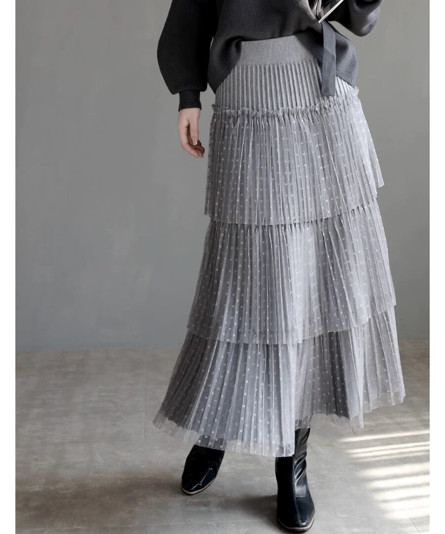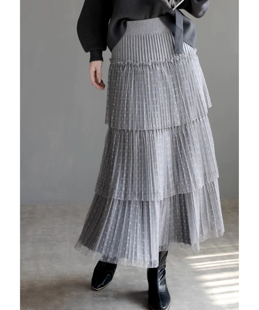 カジュアルさとエレガントさを兼ね備えた、メッシュスプライシングプリーツのニットスカート。