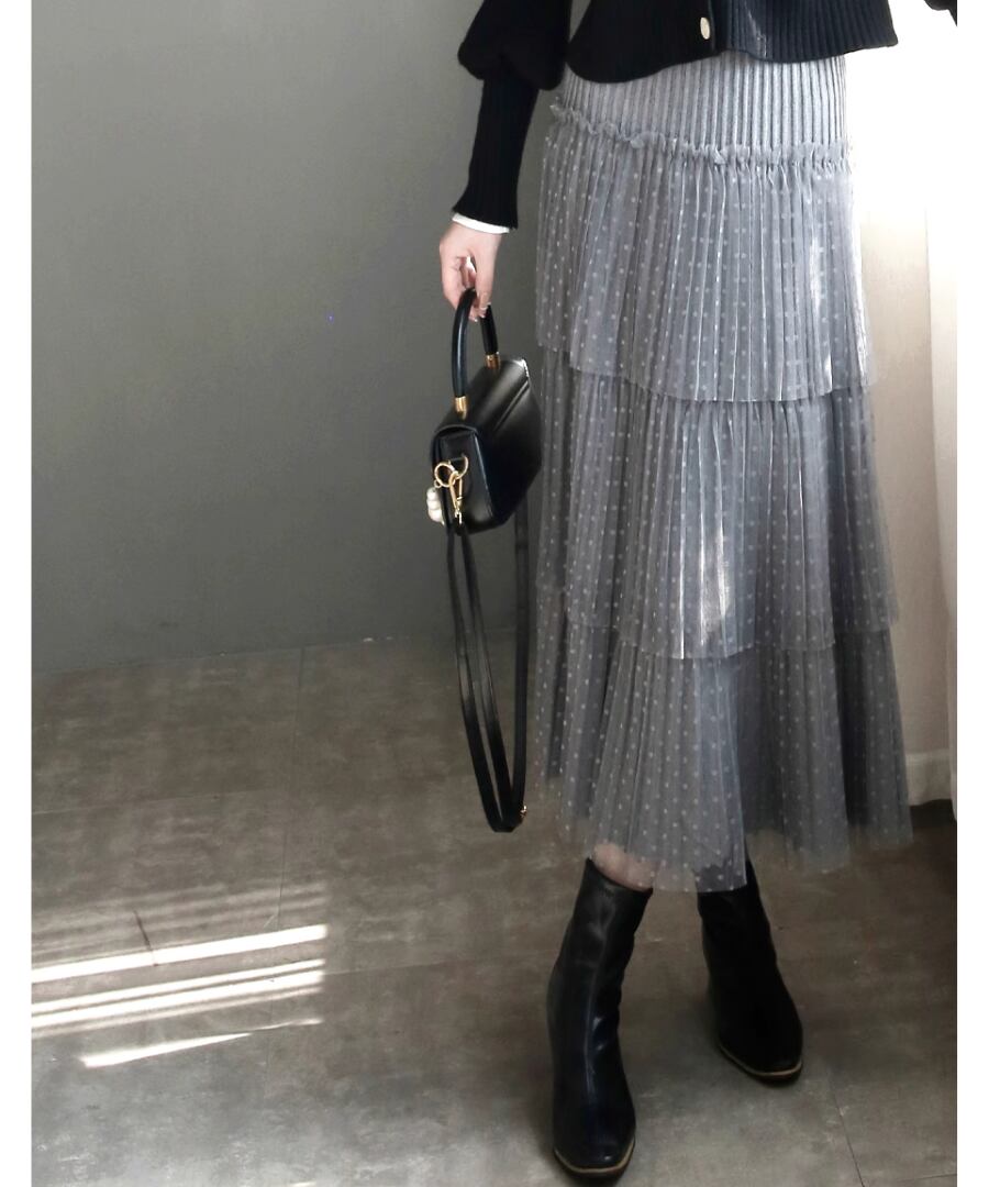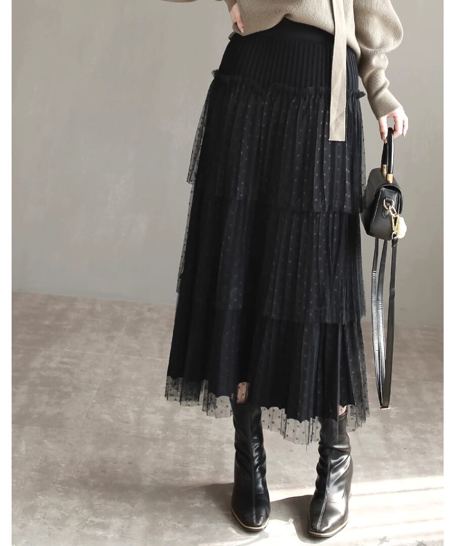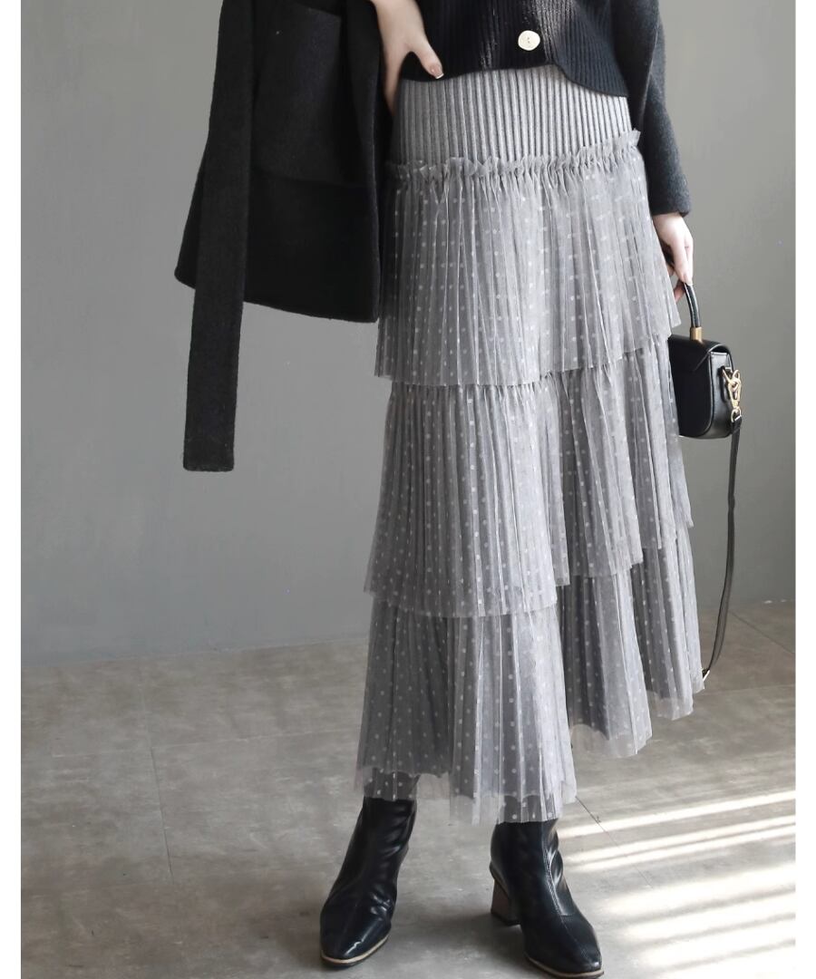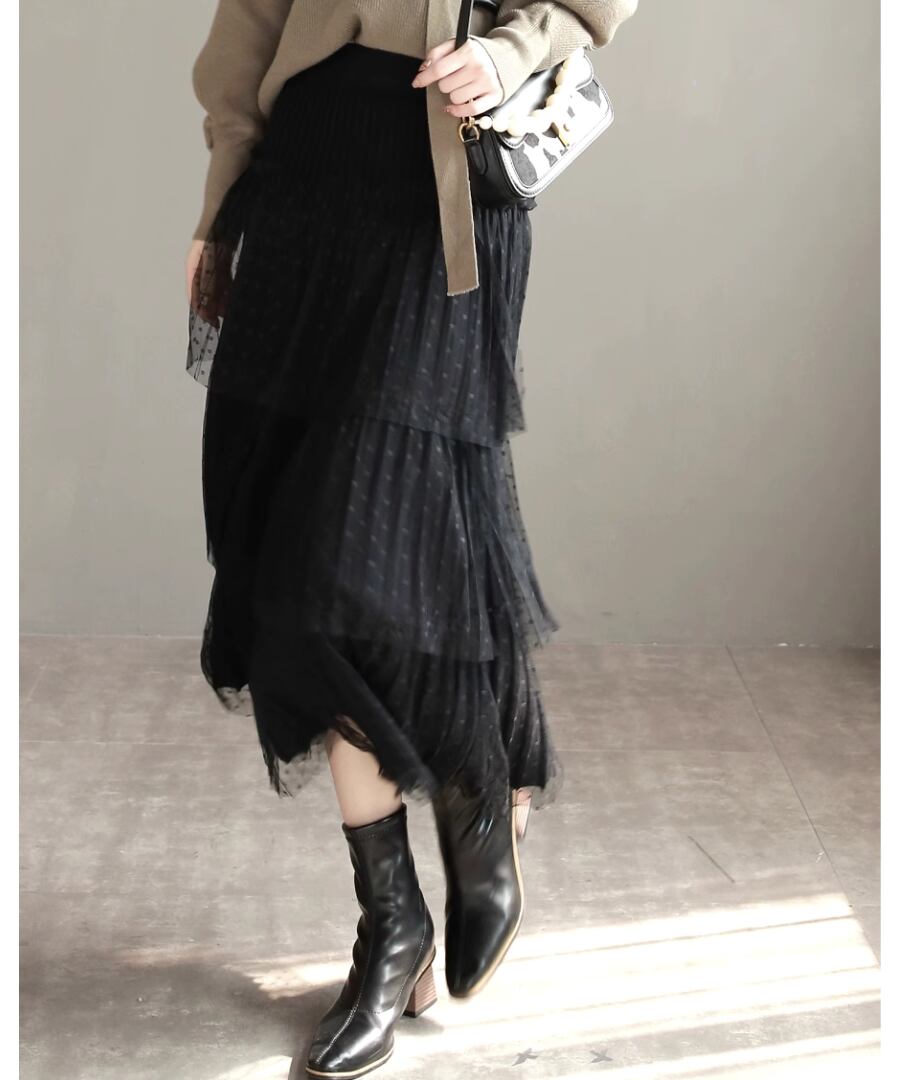 カジュアルさとエレガントさを兼ね備えた、メッシュスプライシングプリーツのニットスカート。
